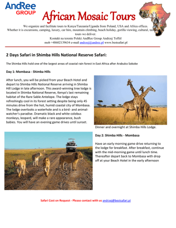 African Mosaic Tours We organize and facilitate tours to Kenya/Tanzania/Uganda from Poland, USA and Africa offices. Whether it is excursions, camping, luxury, car hire, mountain climbing, beach holiday, gorilla viewing, cultural, tailor-made tours we deliver. Kontakt na terenie Polski AndRee Group Andrzej Toffel mob +48602139634 e-mail [email protected] www.bestsafari.pl 2 Days Safari in Shimba Hills National Reserve Safari: The Shimba Hills hold one of the largest areas of coastal rain forest in East Africa after Arabuko Sokoke Day 1: Mombasa - Shimba Hills After lunch, you will be picked from your Beach Hotel and depart to Shimba Hills National Reserve arriving in Shimba Hill Lodge in late afternoon. This award-winning tree lodge is located in Shimba National Reserve, Kenya's last remaining habitat of the Rare Sable Antelope. The lodge stays refreshingly cool in its forest setting despite being only 45 minutes drive from the hot, humid coastal city of Mombasa. The lodge overlooks a waterhole and is a bird- and animalwatcher's paradise. Dramatic black and white colobus monkeys, leopard, will make a rare appearance, bush babies. You will have an evening game drives until sunset. Dinner and overnight at Shimba Hills Lodge. Day 2: Shimba Hills - Mombasa Have an early morning game drive returning to the lodge for breakfast. After breakfast, continue with the mid-morning game until lunch time. Thereafter depart back to Mombasa with drop off at your Beach Hotel in the early afternoon Safari Cost on Request - Please contact with us [email protected]