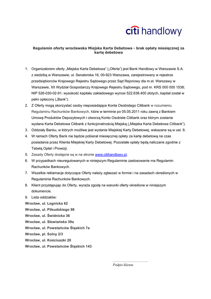 Regulamin oferty wrocławska Miejska Karta Debetowa - brak opłaty miesięcznej za kartę debetowa 1. Organizatorem oferty „Miejska Karta Debetowa” („Oferta”) jest Bank Handlowy w Warszawie S.A. z siedzibą w Warszawie, ul. Senatorska 16, 00-923 Warszawa, zarejestrowany w rejestrze przedsiębiorców Krajowego Rejestru Sądowego przez Sąd Rejonowy dla m.st. Warszawy w Warszawie, XII Wydział Gospodarczy Krajowego Rejestru Sądowego, pod nr. KRS 000 000 1538; NIP 526-030-02-91; wysokość kapitału zakładowego wynosi 522.638.400 złotych, kapitał został w pełni opłacony („Bank”). 2. Z Oferty mogą skorzystać osoby nieposiadające Konta Osobistego Citibank w rozumieniu Regulaminu Rachunków Bankowych, które w terminie po 05.05.2011 roku zawrą z Bankiem Umowę Produktów Depozytowych i otworzą Konto Osobiste Citibank oraz którym zostanie wydana Karta Debetowa Citibank z funkcjonalnością Miejską („Miejska Karta Debetowa Citibank”). 3. Oddziały Banku, w których możliwe jest wydanie Miejskiej Karty Debetowej, wskazane są w ust. 9. 4. W ramach Oferty Bank nie będzie pobierał miesięcznej opłaty za kartę debetową na czas posiadania przez Klienta Miejskiej Karty Debetowej. Pozostałe opłaty będą naliczane zgodnie z Tabelą Opłat i Prowizji. 5. Zasady Oferty dostępne są w na stronie www.citihandlowy.pl. 6. W przypadkach nieuregulowanych w niniejszym Regulaminie zastosowanie ma Regulamin Rachunków Bankowych. 7. Wszelkie reklamacje dotyczące Oferty należy zgłaszać w formie i na zasadach określonych w Regulaminie Rachunków Bankowych. 8. Klient przystępując do Oferty, wyraża zgodę na warunki oferty określone w niniejszym dokumencie. 9. Lista oddziałów: Wrocław, ul. Legnicka 62 Wrocław, ul. Piłsudskiego 98 Wrocław, ul. Świdnicka 36 Wrocław, ul. Słowiańska 39a Wrocław, ul. Powstańców Śląskich 7a Wrocław, pl. Solny 2/3 Wrocław, ul. Kościuszki 20 Wrocław, ul. Powstańców Śląskich 143 ………………………… Podpis klienta