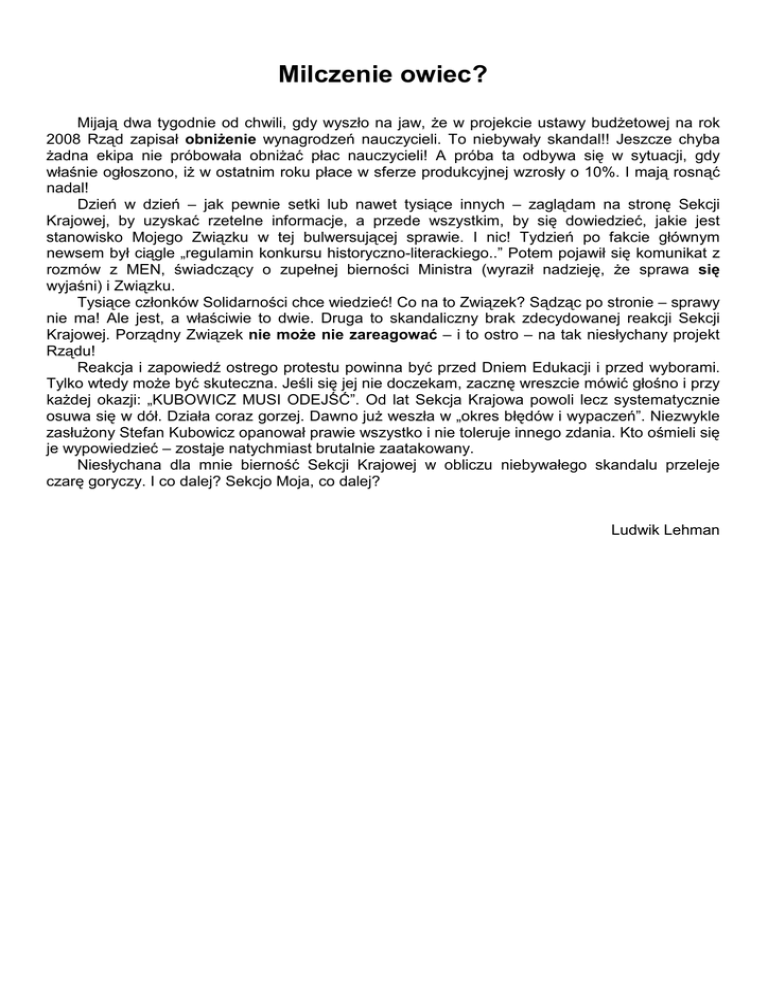 Milczenie owiec? Mijają dwa tygodnie od chwili, gdy wyszło na jaw, Ŝe w projekcie ustawy budŜetowej na rok 2008 Rząd zapisał obniŜenie wynagrodzeń nauczycieli. To niebywały skandal!! Jeszcze chyba Ŝadna ekipa nie próbowała obniŜać płac nauczycieli! A próba ta odbywa się w sytuacji, gdy właśnie ogłoszono, iŜ w ostatnim roku płace w sferze produkcyjnej wzrosły o 10%. I mają rosnąć nadal! Dzień w dzień – jak pewnie setki lub nawet tysiące innych – zaglądam na stronę Sekcji Krajowej, by uzyskać rzetelne informacje, a przede wszystkim, by się dowiedzieć, jakie jest stanowisko Mojego Związku w tej bulwersującej sprawie. I nic! Tydzień po fakcie głównym newsem był ciągle „regulamin konkursu historyczno-literackiego..” Potem pojawił się komunikat z rozmów z MEN, świadczący o zupełnej bierności Ministra (wyraził nadzieję, Ŝe sprawa się wyjaśni) i Związku. Tysiące członków Solidarności chce wiedzieć! Co na to Związek? Sądząc po stronie – sprawy nie ma! Ale jest, a właściwie to dwie. Druga to skandaliczny brak zdecydowanej reakcji Sekcji Krajowej. Porządny Związek nie moŜe nie zareagować – i to ostro – na tak niesłychany projekt Rządu! Reakcja i zapowiedź ostrego protestu powinna być przed Dniem Edukacji i przed wyborami. Tylko wtedy moŜe być skuteczna. Jeśli się jej nie doczekam, zacznę wreszcie mówić głośno i przy kaŜdej okazji: „KUBOWICZ MUSI ODEJŚĆ”. Od lat Sekcja Krajowa powoli lecz systematycznie osuwa się w dół. Działa coraz gorzej. Dawno juŜ weszła w „okres błędów i wypaczeń”. Niezwykle zasłuŜony Stefan Kubowicz opanował prawie wszystko i nie toleruje innego zdania. Kto ośmieli się je wypowiedzieć – zostaje natychmiast brutalnie zaatakowany. Niesłychana dla mnie bierność Sekcji Krajowej w obliczu niebywałego skandalu przeleje czarę goryczy. I co dalej? Sekcjo Moja, co dalej? Ludwik Lehman