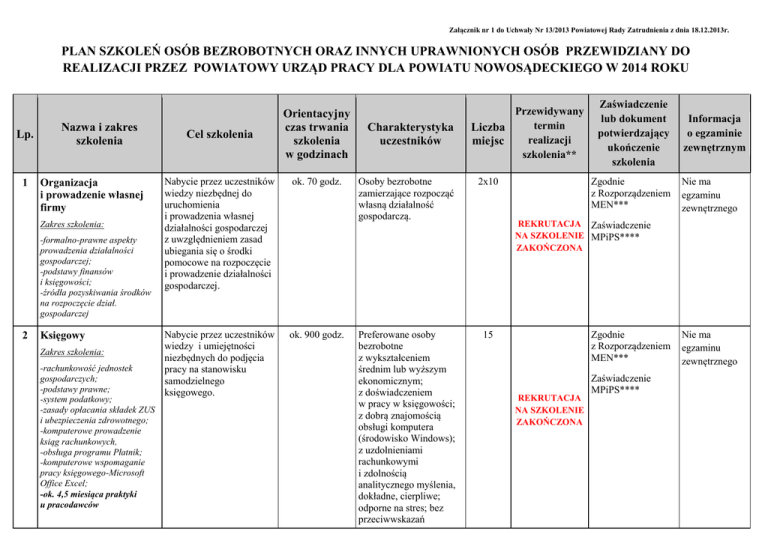 Załącznik nr 1 do Uchwały Nr 13/2013 Powiatowej Rady Zatrudnienia z dnia 18.12.2013r. PLAN SZKOLEŃ OSÓB BEZROBOTNYCH ORAZ INNYCH UPRAWNIONYCH OSÓB PRZEWIDZIANY DO REALIZACJI PRZEZ POWIATOWY URZĄD PRACY DLA POWIATU NOWOSĄDECKIEGO W 2014 ROKU Lp. 1 Nazwa i zakres szkolenia Organizacja i prowadzenie własnej firmy Zakres szkolenia: -formalno-prawne aspekty prowadzenia działalności gospodarczej; -podstawy finansów i księgowości; -źródła pozyskiwania środków na rozpoczęcie dział. gospodarczej 2 Księgowy Zakres szkolenia: -rachunkowość jednostek gospodarczych; -podstawy prawne; -system podatkowy; -zasady opłacania składek ZUS i ubezpieczenia zdrowotnego; -komputerowe prowadzenie ksiąg rachunkowych, -obsługa programu Płatnik; -komputerowe wspomaganie pracy księgowego-Microsoft Office Excel; -ok. 4,5 miesiąca praktyki u pracodawców Cel szkolenia Orientacyjny czas trwania szkolenia w godzinach Nabycie przez uczestników wiedzy niezbędnej do uruchomienia i prowadzenia własnej działalności gospodarczej z uwzględnieniem zasad ubiegania się o środki pomocowe na rozpoczęcie i prowadzenie działalności gospodarczej. ok. 70 godz. Nabycie przez uczestników wiedzy i umiejętności niezbędnych do podjęcia pracy na stanowisku samodzielnego księgowego. ok. 900 godz. Charakterystyka uczestników Przewidywany termin Liczba realizacji miejsc szkolenia** Osoby bezrobotne zamierzające rozpocząć własną działalność gospodarczą. 2x10 Preferowane osoby bezrobotne z wykształceniem średnim lub wyższym ekonomicznym; z doświadczeniem w pracy w księgowości; z dobrą znajomością obsługi komputera (środowisko Windows); z uzdolnieniami rachunkowymi i zdolnością analitycznego myślenia, dokładne, cierpliwe; odporne na stres; bez przeciwwskazań 15 Zaświadczenie lub dokument potwierdzający ukończenie szkolenia Zgodnie z Rozporządzeniem MEN*** Informacja o egzaminie zewnętrznym Nie ma egzaminu zewnętrznego REKRUTACJA Zaświadczenie NA SZKOLENIE MPiPS**** ZAKOŃCZONA Zgodnie z Rozporządzeniem MEN*** REKRUTACJA NA SZKOLENIE ZAKOŃCZONA Zaświadczenie MPiPS**** Nie ma egzaminu zewnętrznego zdrowotnych; zmotywowane do podjęcia pracy w zawodzie księgowego; będące w szczególnej sytuacji na rynku pracy* 3 Nabycie przez uczestników wiedzy i umiejętności niezbędnych do prowadzenia podatkowej książki przychodów i rozchodów z wykorzystaniem programu Płatnik. ok. 470 godz. Kosztorysant budowlany Nabycie przez uczestników ok. 305 godz. Podatkowa książka przychodów i rozchodów Zakres szkolenia: -zagadnienia teoretycznozawodowe niezbędne w pracy na stanowisku księgowego; -moduł kadrowo- płacowy; -komputerowe prowadzenie podatkowej książki przychodów i rozchodów, obsługa programu Płatnik; -komputerowe wspomaganie pracy księgowego-Microsoft Office Excel; -ok. 2 miesięczna praktyka u pracodawców 4 Zakres szkolenia: -podstawowe zagadnienia dotyczące kosztorysowania; -normowanie w kalkulacji kosztorysowej; -przedmiarowanie; -wspomaganie kosztorysowania przy użyciu licencjonowanych programów komputerowych; -moduł przedsiębiorczości; -1 miesiąc praktyki u pracodawców. wiedzy i umiejętności niezbędnych do podjęcia pracy w zawodzie kosztorysanta budowlanego. Preferowane osoby bezrobotne z wykształceniem średnim lub wyższym ekonomicznym; lub z doświadczeniem w pracy w księgowości, z dobrą znajomością obsługi komputera (Windows); z uzdolnieniami rachunkowymi; ze zdolnością analitycznego myślenia; dokładne, cierpliwe, odporne na stres; bez przeciwwskazań zdrowotnych; zmotywowane do podjęcia pracy w zawodzie księgowego; będące w szczególnej sytuacji na rynku pracy*. 20 Preferowane osoby bezrobotne z wykształceniem średnim lub wyższym budowlanym; posiadające wiedzę technicznobudowlaną oraz ekonomiczno- finansową; z umiejętnością analitycznego myślenia; z umiejętnością obsługi komputera (Windows); bez przeciwwskazań 10 Zgodnie z Rozporządzeniem MEN*** Nie ma egzaminu zewnętrznego Zaświadczenie MPiPS**** REKRUTACJA NA SZKOLENIE ZAKOŃCZONA I kwartał Zgodnie z Rozporządzeniem MEN*** Szkolenie nie będzie Zaświadczenie realizowane MPiPS**** z uwagi na brak odpowiednich kandydatów Nie ma egzaminu zewnętrznego zdrowotnych; zmotywowane do podjęcia pracy kosztorysanta budowlanego; będące w szczególnej sytuacji na rynku pracy*. 5 Nabycie przez uczestników wiedzy i umiejętności niezbędnych do podjęcia pracy w branży budowlanej – wewnętrzne prace wykończeniowe . ok. 330 godz. Nabycie przez uczestników wiedzy i umiejętności Zakres szkolenia: praktycznych niezbędnych do podjęcia pracy -charakterystyka i obsługa maszyn i urządzeń stosowanych w zawodzie tapicera. ok. 250 godz. Technolog wewnętrznych robót wykończeniowych w budownictwie Zakres szkolenia: -technologia robót budowlanych; -układanie płytek, glazury, tapetowanie i malowanie; -systemy suchej zabudowy wnętrz; -montaż okien, drzwi i parapetów wewnętrznych; -moduł przedsiębiorczości; -2 miesiące praktyki u pracodawców. 6 Tapicer meblowy podczas tapicerowania oraz ich konserwacja, -dobieranie rodzaju tapicerki oraz materiałów do konstrukcji, wykonywanie podłoża oraz warstwy tapicerskiej, - krojenie i szycie tkanin oraz naciąganie tkanin na elementy tapicerowane, - estetyczne wykańczanie produktu, -wykonywanie napraw i renowacji mebli tapicerowanych. -1,5 miesięczna praktyka Preferowane osoby bezrobotne bez przeciwwskazań zdrowotnych; zmotywowane do podjęcia pracy w branży budowlanej; będące w szczególnej sytuacji na rynku pracy*. 10 Preferowane osoby bezrobotne bez przeciwwskazań zdrowotnych; zmotywowane do podjęcia pracy w zawodzie tapicera meblowego; z dobrym wzrokiem oraz koordynacją wzrokoworuchową; z poczuciem estetyki; będące w szczególnej sytuacji na rynku pracy*. 15 Zgodnie z Rozporządzeniem MEN*** Nie ma egzaminu zewnętrznego REKRUTACJA Zaświadczenie NA SZKOLENIE MPiPS**** ZAKOŃCZONA II