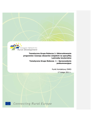 Sprawozdanie podsumowujące tematycznej grupy roboczej nr 1 – rok 2010 Tematyczna Grupa Robocza 1: Ukierunkowanie programów rozwoju obszarów wiejskich na specyfikę i potrzeby terytorialne Tematyczna Grupa Robocza 1 – Sprawozdanie podsumowujące Punkt Kontaktowy ENRD 17 lutego 2011 r. 17 lutego 2011 r. i Sprawozdanie podsumowujące tematycznej grupy roboczej nr 1 – rok 2010 Tematyczna Grupa Robocza nr 1 ENRD utworzyła tematyczne grupy robocze, które w oparciu o aktualnie realizowane programy rozwoju obszarów wiejskich zajmują się szczegółową analizą konkretnych priorytetów tematycznych. Działając na podstawie wyraźnie określonego mandatu, przedstawiają one pogłębioną analizę wdrażania polityki rozwoju obszarów wiejskich UE oraz przyczyniają się do poznania i upowszechniania wiedzy fachowej i doświadczeń oraz poprawy skuteczności tej polityki. W październiku 2010 r. utworzono tematyczne grupy robocze zajmujące się następującymi tematami: • Tematyczna Grupa Robocza 1: Ukierunkowanie programów rozwoju obszarów wiejskich na specyfikę i potrzeby terytorialne • Tematyczna Grupa Robocza 2: Rolnictwo i gospodarka wiejska w szerszym ujęciu • Tematyczna Grupa Tobocza 3: Dobra publiczne i interwencja publiczna • Tematyczna Grupa Robocza 4: Sposoby realizacji polityki rozwoju obszarów wiejskich UE Ogólnym celem Tematycznej Grupy Roboczej 1 jest przyczynienie się, poprzez odpowiednią analizę i upowszechnienie jej wyników, do skutecznego ukierunkowania programów rozwoju obszarów wiejskich (PROW) na specyfikę i potrzeby terytorialne oraz na bardziej zrównoważony rozwój obszarów wiejskich w Europie. Na podstawie przygotowanego wcześniej planu roboczego grupa prowadziła prace analityczne w 3 etapach: na etapie 1 analizowano sposoby definiowania obszarów wiejskich przez Państwa Członkowskie UE w ich PROW w okresie programowania 2007–2013 lub sposoby ukierunkowywania tych programów na obszary wiejskie, jak również rodzaje zastosowanych w tym celu wskaźników i definicji; etap 2 poświęcony był kwestii rozgraniczenia i komplementarności różnych funduszy Unii Europejskiej i funduszy krajowych z punktu widzenia zaspokojenia potrzeb w zakresie rozwoju obszarów wiejskich oraz ukierunkowania stosowanych środków i zasobów na wybrane terytoria w celu zaspokojenia potrzeb określonych obszarów; etap 3 stanowiący końcowy wynik prac analitycznych obejmuje opracowanie ogólnego sprawozdania zawierającego zestawienie różnych elementów (w tym istotnych podobieństw i różnic) w odniesieniu do: • krajowych sposobów podejścia do definicji obszarów wiejskich; • analizy szczególnych cech i potrzeb pod względem terytorialnym; • ukierunkowania środków adekwatnie do tych szczególnych cech i potrzeb; • strategii uwzględniających rozgraniczenie i komplementarność PROW i innych instrumentów unijnych i krajowych. Na podstawie tych informacji zakończenie sprawozdania z etapu 3 zawiera projekt elementów składowych uaktualnionej typologii obszarów wiejskich oraz uaktualniony zestaw wskaźników bazowych. Począwszy od jesieni 2010 r. opracowywany jest szereg „produktów” opartych na wynikach prac analitycznych, przeznaczonych do szerokiego upowszechniania i dyskusji wśród interesariuszy ENRD. 17 lutego 2011 r. ii Sprawozdanie podsumowujące tematycznej grupy roboczej nr 1 – rok 2010 1. Wprowadzenie Podejście modelowe zastosowane w tej pracy skupia się na powiązaniach między pięcioma elementami (schemat 1), w ramach każdego poddanego analizie PROW , : definicją obszarów wiejskich użytą dla potrzeb PROW; określeniem specyficznych potrzeb i ukierunkowaniem na wybrane terytoria; środkami i zasobami ujętymi w PROW zastosowanymi w celu zaspokojenia tych potrzeb; środkami i zasobami innych funduszy unijnych lub krajowych wykorzystanymi w celu zaspokojenia potrzeb w zakresie rozwoju obszarów wiejskich oraz podejściem przyjętym w stosunku do rozgraniczenia i komplementarności PROW i tych funduszy. Schemat 1: Związki pomiędzy elementami w ramach każdego programu rozwoju obszarów wiejskich Państwa Członkowskie lub regiony muszą definiować obszary wiejskie, aby wyznaczyć granice terytorium, do którego można zastosować określone środki PROW. Ponadto w odpowiedzi na priorytety polityki unijnej, krajowej lub lokalnej mogą one definiować „szczególne” terytoria (np. Natura 2000; obszary o niekorzystnych warunkach gospodarowania, obszary objęte zasięgiem LGD), oceniać swoje potrzeby w zakresie rozwoju i stosować (wyłącznie na tych terytoriach lub także na innych obszarach wiejskich) szczególne środki przewidziane w PROW. Ponadto te szczególne terytoria mogą być „odbiorcami” niewielu bądź szerokiej gamy środków PROW. Obszary wiejskie mogą także korzystać z polityki interwencyjnej wiążącej się z innymi funduszami unijnymi (np. EFRR, Fundusz Spójności, EFS, EFR, Life+ itp.) lub krajowymi. W związku z tym przy ocenie skuteczności ukierunkowania na potrzeby w zakresie rozwoju danego terytorium należy uwzględnić także środki i zasoby spoza EFRROW. W tym kontekście znaczenia nabierają takie kwestie jak rozgraniczenie1, nakładanie się2 i komplementarnośc3 różnych działań interwencyjnych finansowanych za pomocą różnych instrumentów służących rozwojowi, a także zarządzanie nimi, ponieważ mogą w dużej mierze determinować skuteczność polityki. Niniejsze sprawozdanie przedstawia streszczenie tej analizy. W części 2 zaprezentowano wnioski dotyczące różnorodnych definicji używanych do określania obszarów wiejskich dla celów realizowanych tam PROW. W części 3 zrelacjonowano sposoby podejścia do rozgraniczenia i komplementarności środków i zasobów charakterystycznych dla EFRROW, innych funduszy unijnych lub krajowych, natomiast w części 4 omówiono szereg studiów przypadku i przedstawiono konkretne definicje terytoriów, potrzeby