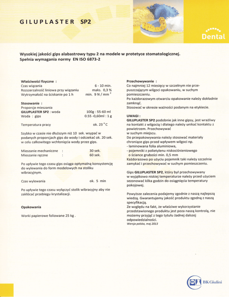 GlLUPLASTER sP2 Wysokiej jakościgips alabastrowy typu 2 na modele w protetyce stomatologicznej. Spełnia wymagania normy EN lSO 6873-2 fizyczne : Właściwości Czas wiązania Rozszerzalność liniowa przy wiązaniu Wytrzymałośćna ściskaniepo 1 h stosowanie Przechowywanie 6 - 10 min. maks. 0,3 % min.9N/mm2 Stosować w okresie ważnościpodanym na etykiecie. GlLUPLASTER SP2 : woda Woda : gips 1009 : 55-60 ml 0.55-0,60ml:1g Temperatura pracy ok. 23 oc Szybko w czasie nie dłuższymniż 10 sek. wsypać w podanych proporcjach gips do wody i odczekać ok. 20 sek. w celu całkowitego wchłonięcia wody przez gips. Mieszanie ręczne : 30 sek. : 60 sek. Po upływie tego czasu gips osiąga optymalną konsystencję do wylewania do form modelowych na stoliku wibracyjnym. Czas pomieszczeniu. Po każdorazowym otwarciu opakowanie należy dokładnie zamknąć. : Proporcje mieszania Mieszaniemechaniczne : Co najmniej 12 miesięcy w szczelnym nie przepuszczającym wilgoci opakowaniu, w suchym wylewania ok. 5 min Gips GlLUPLASTER SP2, który był przechowywany w wyjątkowo niskiej temperaturze należy przed użyciem sezonować kilka godzin do osiągnięcia temperatury pokojowej. Po upływie tego czasu wyłączyć stolik wibracyjny aby nie zakłocać przebiegu krystalizacji. Opakowania Worki papierowe foliowane 25 kg UWAG|: GlLUPLASTER SP2 podobnie jak inne gipsy, jest wrażliwy na kontakt z wilgocią i dlatego należy unikać kontaktu z powietrzem. Przechowywać w suchym miejscu. Do przepakowywania naIeży stosować materiały chroniące gips przed wpływem wilgoci np. - laminowana folia aluminiowa, - pojemniki z polietylenu niskociśnieniowego o ściancegrubości min, 0,5 mm Każdorazowo po użyciu pojemnik taki należy szczelnie zamykać i przechowywać w suchym pomieszczeniu, . Powyższe zalecenia podajemy zgodnie z naszą najlepszą wiedzą. Gwarantujemy jakośćproduktu zgodną z naszą specyfikacją. Ze względu na fakt, że właściwewykorzystanie przedstawionego produktu jest poza naszą kontrolą, nie możemy przyjąć z tego tytułu żadnej dalszej odpowiedzialności. Wersja polska, mdj 2073 @BKGiulini