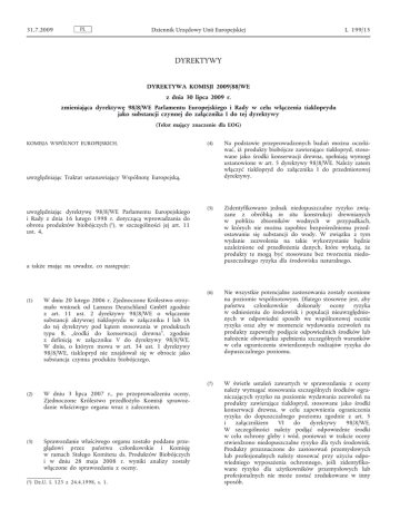 31.7.2009 PL Dziennik Urzędowy Unii Europejskiej L 199/15 DYREKTYWY DYREKTYWA KOMISJI 2009/88/WE z dnia 30 lipca 2009 r. zmieniająca dyrektywę 98/8/WE Parlamentu Europejskiego i Rady w celu włączenia tiakloprydu jako substancji czynnej do załącznika I do tej dyrektywy (Tekst mający znaczenie dla EOG) KOMISJA WSPÓLNOT EUROPEJSKICH, (4) Na podstawie przeprowadzonych badań można oczeki wać, iż produkty biobójcze zawierające tiaklopryd, stoso wane jako środki konserwacji drewna, spełniają wymogi ustanowione w art. 5 dyrektywy 98/8/WE. Należy zatem włączyć tiaklopryd do załącznika I do przedmiotowej dyrektywy. (5) Zidentyfikowano jednak niedopuszczalne ryzyko zwią zane z obróbką in situ konstrukcji drewnianych w pobliżu zbiorników wodnych w przypadkach, w których nie można zapobiec bezpośredniemu przed ostawaniu się substancji do wody. W związku z tym wydanie zezwolenia na takie wykorzystanie będzie uzależnione od przedłożenia danych, które wykażą, że produkty te mogą być stosowane bez tworzenia niedo puszczalnego ryzyka dla środowiska naturalnego. (6) Nie wszystkie potencjalne zastosowania zostały ocenione na poziomie wspólnotowym. Dlatego stosowne jest, aby państwa członkowskie dokonały oceny ryzyka w odniesieniu do środowisk i populacji nieuwzględnio nych w odpowiedni sposób we wspólnotowej ocenie ryzyka oraz aby w momencie wydawania zezwoleń na produkty zapewniły podjęcie odpowiednich środków lub nałożenie obowiązku spełnienia szczególnych warunków w celu ograniczenia stwierdzonych rodzajów ryzyka do dopuszczalnego poziomu. (7) W świetle ustaleń zawartych w sprawozdaniu z oceny należy wymagać stosowania szczególnych środków ogra niczających ryzyko na poziomie wydawania zezwoleń na produkty zawierające tiaklopryd, stosowane jako środki konserwacji drewna, w celu zapewnienia ograniczenia ryzyka do dopuszczalnego poziomu zgodnie z art. 5 i załącznikiem VI do dyrektywy 98/8/WE. W szczególności należy podjąć odpowiednie środki w celu ochrony gleby i wód, ponieważ w trakcie oceny stwierdzono niedopuszczalne ryzyko dla tych środowisk. Produkty przeznaczone do zastosowań przemysłowych lub profesjonalnych należy stosować przy użyciu odpo wiedniego wyposażenia ochronnego, jeśli zidentyfiko wane ryzyko dla użytkowników przemysłowych lub profesjonalnych nie może zostać zredukowane w inny sposób. uwzględniając Traktat ustanawiający Wspólnotę Europejską, uwzględniając dyrektywę 98/8/WE Parlamentu Europejskiego i Rady z dnia 16 lutego 1998 r. dotyczącą wprowadzania do obrotu produktów biobójczych (1), w szczególności jej art. 11 ust. 4, a także mając na uwadze, co następuje: (1) W dniu 20 lutego 2006 r. Zjednoczone Królestwo otrzy mało wniosek od Lanxess Deutschland GmbH zgodnie z art. 11 ust. 2 dyrektywy 98/8/WE o włączenie substancji aktywnej tiakloprydu w załączniku I lub IA do tej dyrektywy pod kątem stosowania w produktach typu 8, „środki do konserwacji drewna”, zgodnie z definicją w załączniku V do dyrektywy 98/8/WE. W dniu, o którym mowa w art. 34 ust. 1 dyrektywy 98/8/WE, tiaklopryd nie znajdował się w obrocie jako substancja czynna produktu biobójczego. (2) W dniu 3 lipca 2007 r., po przeprowadzeniu oceny, Zjednoczone Królestwo przedłożyło Komisji sprawoz danie właściwego organu wraz z zaleceniem. (3) Sprawozdanie właściwego organu zostało poddane prze glądowi przez państwa członkowskie i Komisję w ramach Stałego Komitetu ds. Produktów Biobójczych i w dniu 28 maja 2008 r. wyniki analizy zostały włączone do sprawozdania z oceny. (1) Dz.U. L 123 z 24.4.1998, s. 1. L 199/16 (8) PL Dziennik Urzędowy Unii Europejskiej Należy przewidzieć odpowiednią ilość czasu, zanim substancja czynna zostanie włączona do załącznika I, aby umożliwić państwom członkowskim wprowadzenie w życie przepisów ustawowych, wykonawczych i administracyjnych niezbędnych do wykonania niniejszej dyrektywy. (9) Należy zatem odpowiednio zmienić dyrektywę 98/8/WE. (10) Po konsultacjach, które miały miejsce w dniu 30 maja 2008 r., Stały Komitet ds. Produktów Biobójczych wydał pozytywną opinię na temat projektu dyrektywy Komisji zmieniającej dyrektywę 98/8/WE Parlamentu Europej skiego i Rady w celu włączenia tiakloprydu jako substancji czynnej do załącznika I do tej dyrektywy. W dniu 11 czerwca Komisja przedłożyła Parlamentowi i Radzie przedmiotowy projekt do kontroli. Parlament Europejski nie wyraził sprzeciwu wobec projektu środków w wyznaczonym terminie. Rada sprzeciwiła się przyjęciu projektu przez Komisję, wskazując, że proponowane środki przekraczają uprawnienia wyko nawcze przewidziane w dyrektywie 1998/8/WE. W wyniku powyższego Komisja nie przyjęła projektu środków, a następnie przedłożyła zmieniony projekt dotyczący przedmiotowej dyrektywy Stałemu Komitetowi ds. Produktów Biobójczych. Konsultacje ze Stałym Komi tetem dotyczące przedmiotowego projektu miały miejsce w dniu 20 lutego 2009 r. (11) Środki przewidziane w niniejszej dyrektywie są zgodne z opinią Stałego Komitetu ds. Produktów Biobójczych, 31.7.2009 Artykuł 1 W załączniku I do dyrektywy 98/8/WE wprowadza się zmiany zgodnie z załącznikiem do niniejszej dyrektywy. Artykuł 2 1. Państwa członkowskie wprowadzają w życie przepisy ustawowe, wykonawcze i administracyjne niezbędne do wyko nania niniejszej dyrektywy najpóźniej w ciągu 6 miesięcy od dnia jej wejścia w życie. Przepisy przyjęte przez państwa członkowskie zawierają odnie sienie do niniejszej dyrektywy lub odniesienie takie towarzyszy ich urzędowej publikacji. Metody dokonywania takiego odnie sienia określane są przez państwa członkowskie. 2. Państwa członkowskie przekazują Komisji tekst głównych przepisów prawa krajowego dotyczących dziedziny objętej niniejszą dyrektywą. Artykuł 3 Niniejsza dyrektywa wchodzi w życie dwudziestego dnia po jej opublikowaniu