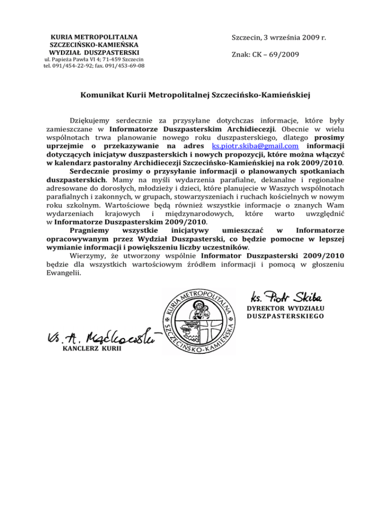 KURIA METROPOLITALNA SZCZECIŃSKO-KAMIEŃSKA WYDZIAŁ DUSZPASTERSKI ul. Papieża Pawła VI 4; 71-459 Szczecin tel. 091/454-22-92; fax. 091/453-69-08 Szczecin, 3 września 2009 r. Znak: CK – 69/2009 Komunikat Kurii Metropolitalnej Szczecińsko-Kamieńskiej Dziękujemy serdecznie za przysyłane dotychczas informacje, które były zamieszczane w Informatorze Duszpasterskim Archidiecezji. Obecnie w wielu wspólnotach trwa planowanie nowego roku duszpasterskiego, dlatego prosimy uprzejmie o przekazywanie na adres [email protected] informacji dotyczących inicjatyw duszpasterskich i nowych propozycji, które można włączyć w kalendarz pastoralny Archidiecezji Szczecińsko-Kamieńskiej na rok 2009/2010. Serdecznie prosimy o przysyłanie informacji o planowanych spotkaniach duszpasterskich. Mamy na myśli wydarzenia parafialne, dekanalne i regionalne adresowane do dorosłych, młodzieży i dzieci, które planujecie w Waszych wspólnotach parafialnych i zakonnych, w grupach, stowarzyszeniach i ruchach kościelnych w nowym roku szkolnym. Wartościowe będą również wszystkie informacje o znanych Wam wydarzeniach krajowych i międzynarodowych, które warto uwzględnić w Informatorze Duszpasterskim 2009/2010. Pragniemy wszystkie inicjatywy umieszczać w Informatorze opracowywanym przez Wydział Duszpasterski, co będzie pomocne w lepszej wymianie informacji i powiększeniu liczby uczestników. Wierzymy, że utworzony wspólnie Informator Duszpasterski 2009/2010 będzie dla wszystkich wartościowym źródłem informacji i pomocą w głoszeniu Ewangelii. DYREKTOR WYDZIAŁU DUSZPASTERSKIEGO KANCLERZ KURII