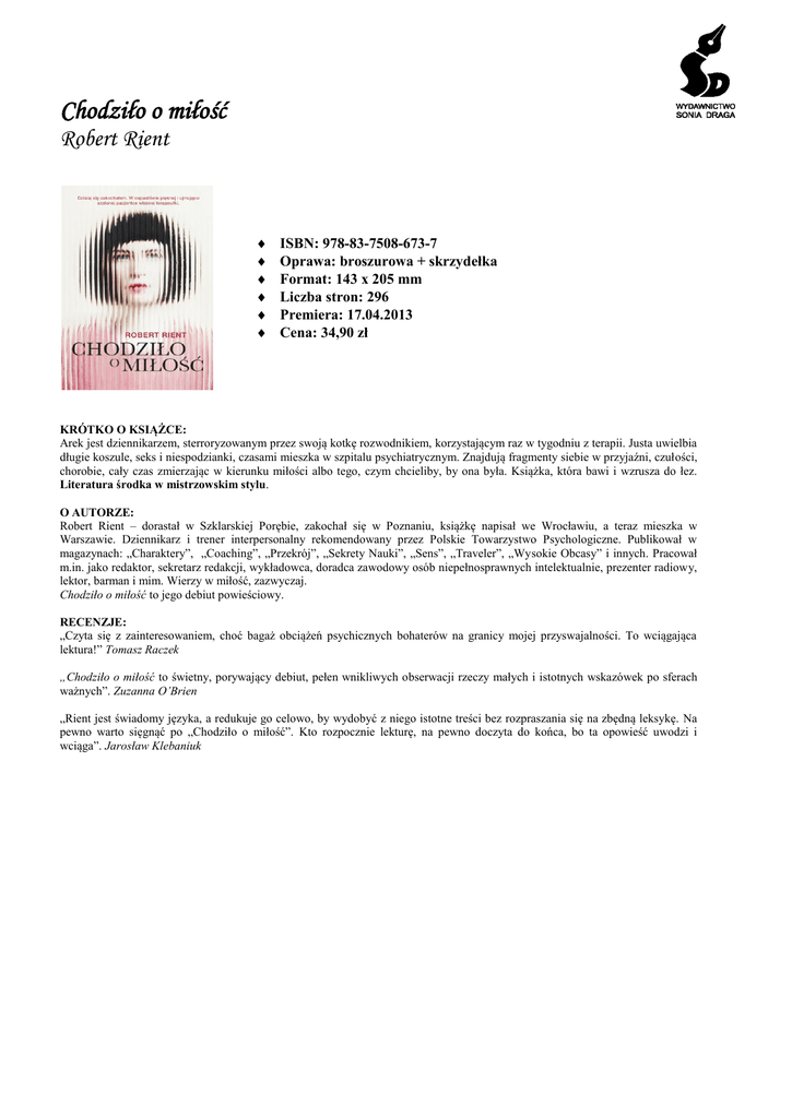 Chodziło o miłość Robert Rient ISBN: 978-83-7508-673-7 Oprawa: broszurowa + skrzydełka Format: 143 x 205 mm Liczba stron: 296 Premiera: 17.04.2013 Cena: 34,90 zł KRÓTKO O KSIĄŻCE: Arek jest dziennikarzem, sterroryzowanym przez swoją kotkę rozwodnikiem, korzystającym raz w tygodniu z terapii. Justa uwielbia długie koszule, seks i niespodzianki, czasami mieszka w szpitalu psychiatrycznym. Znajdują fragmenty siebie w przyjaźni, czułości, chorobie, cały czas zmierzając w kierunku miłości albo tego, czym chcieliby, by ona była. Książka, która bawi i wzrusza do łez. Literatura środka w mistrzowskim stylu. O AUTORZE: Robert Rient – dorastał w Szklarskiej Porębie, zakochał się w Poznaniu, książkę napisał we Wrocławiu, a teraz mieszka w Warszawie. Dziennikarz i trener interpersonalny rekomendowany przez Polskie Towarzystwo Psychologiczne. Publikował w magazynach: „Charaktery”, „Coaching”, „Przekrój”, „Sekrety Nauki”, „Sens”, „Traveler”, „Wysokie Obcasy” i innych. Pracował m.in. jako redaktor, sekretarz redakcji, wykładowca, doradca zawodowy osób niepełnosprawnych intelektualnie, prezenter radiowy, lektor, barman i mim. Wierzy w miłość, zazwyczaj. Chodziło o miłość to jego debiut powieściowy. RECENZJE: „Czyta się z zainteresowaniem, choć bagaż obciążeń psychicznych bohaterów na granicy mojej przyswajalności. To wciągająca lektura!” Tomasz Raczek „Chodziło o miłość to świetny, porywający debiut, pełen wnikliwych obserwacji rzeczy małych i istotnych wskazówek po sferach ważnych”. Zuzanna O’Brien „Rient jest świadomy języka, a redukuje go celowo, by wydobyć z niego istotne treści bez rozpraszania się na zbędną leksykę. Na pewno warto sięgnąć po „Chodziło o miłość”. Kto rozpocznie lekturę, na pewno doczyta do końca, bo ta opowieść uwodzi i wciąga”. Jarosław Klebaniuk