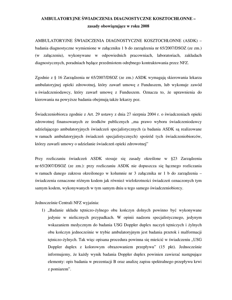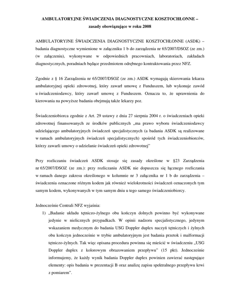 AMBULATORYJNE ŚWIADCZENIA DIAGNOSTYCZNE KOSZTOCHŁONNE – zasady obowiązujące w roku 2008 AMBULATORYJNE ŚWIADCZENIA DIAGNOSTYCZNE KOSZTOCHŁONNE (ASDK) – badania diagnostyczne wymienione w załączniku 1 b do zarządzenia nr 65/2007/DSOZ (ze zm.) (w załączeniu), wykonywane w odpowiednich pracowniach, laboratoriach, zakładach diagnostycznych, poradniach będące przedmiotem odrębnego kontraktowania przez NFZ. Zgodnie z § 16 Zarządzenia nr 65/2007/DSOZ (ze zm.) ASDK wymagają skierowania lekarza ambulatoryjnej opieki zdrowotnej, który zawarł umowę z Funduszem, lub wykonuje zawód u świadczeniodawcy, który zawarł umowę z Funduszem. Oznacza to, że uprawnienia do kierowania na powyższe badania obejmują także lekarzy poz. Świadczeniobiorca zgodnie z Art. 29 ustawy z dnia 27 sierpnia 2004 r. o świadczeniach opieki zdrowotnej finansowanych ze środków publicznych „ma prawo wyboru świadczeniodawcy udzielającego ambulatoryjnych świadczeń specjalistycznych (a badania ASDK są realizowane w ramach ambulatoryjnych świadczeń specjalistycznych) spośród tych świadczeniobiorców, którzy zawarli umowy o udzielanie świadczeń opieki zdrowotnej” Przy rozliczaniu świadczeń ASDK stosuje się zasady określone w §23 Zarządzenia nr 65/2007/DSOZ (ze zm.): przy rozliczaniu ASDK nie dopuszcza się łącznego rozliczania w ramach danego zakresu określonego w kolumnie nr 3 załącznika nr 1 b do zarządzenia – świadczenia oznaczone różnym kodem jak również wielokrotności świadczeń oznaczonych tym samym kodem, wykonywanych w tym samym dniu u tego samego świadczeniobiorcy. Jednocześnie Centrali NFZ wyjaśnia: 1) „Badanie układu tętniczo-żylnego obu kończyn dolnych powinno być wykonywane jedynie w nielicznych przypadkach. W opinii nadzoru specjalistycznego, jedynym wskazaniem medycznym do badania USG Doppler duplex naczyń tętniczych i żylnych obu kończyn jednocześnie w trybie ambulatoryjnym jest badania przetok i malformacji tętniczo-żylnych. Tak więc opisana procedura powinna się mieścić w świadczeniu „USG Doppler duplex z kolorowym obrazowaniem przepływu” (15 pkt). Jednocześnie informujemy, że każdy wynik badania Doppler duplex powinien zawierać następujące elementy: opis badania w prezentacji B oraz analizę zapisu spektralnego przepływu krwi z pomiarem”. 2) „Scyntygrafia perfuzyjna mięśnia sercowego SPECT może być badaniem jedno lub dwudniowym. W zależności od zaleceń lekarza kierującego wykonywane być może tylko badanie spoczynkowe bądź też wykonana scyntygrafia perfuzyjna serca spoczynkowa i wysiłkowa. Procedura z katalogu ASDK o kodzie 5.03.00.0000018 „SPECT” jest świadczeniem uwzględniającym zarówno badanie spoczynkowe jak i spoczynkowe i wysiłkowe (łącznie). Wartość punktowa jest wartości uśrednioną” 3) Zgodnie z § 5 pkt. 4 rozporządzeniem Ministra zdrowia z dnia 25 sierpnia 2005 roku w sprawie warunków bezpieczeństwa stosowania promieniowania jonizującego dla wszystkich rodzajów ekspozycji medycznej „badania rentgenodiagnostyczne są wykonywane przez lekarzy posiadających specjalizację z radiologii i diagnostyki obrazowej lub pod ich nadzorem, przez lekarzy będących w trakcie takiej specjalizacji. Technicy elektroradiologii są uprawnieni do wykonywania radiografii. Inne elementy procedury medycznej zlecane technikom przez lekarzy radiologów wykonywane są po ich nadzorem” Wyjaśnienia Centrali NFZ podpisał Z-ca Prezesa ds. Medycznych Jacek Grabowski