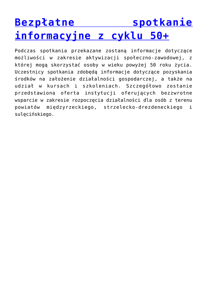 Bezpłatne spotkanie informacyjne z cyklu 50+ Podczas spotkania przekazane zostaną informacje dotyczące możliwości w zakresie aktywizacji społeczno-zawodowej, z której mogą skorzystać osoby w wieku powyżej 50 roku życia. Uczestnicy spotkania zdobędą informacje dotyczące pozyskania środków na założenie działalności gospodarczej, a także na udział w kursach i szkoleniach. Szczegółowo zostanie przedstawiona oferta instytucji oferujących bezzwrotne wsparcie w zakresie rozpoczęcia działalności dla osób z terenu powiatów międzyrzeckiego, strzelecko-drezdeneckiego i sulęcińskiego.