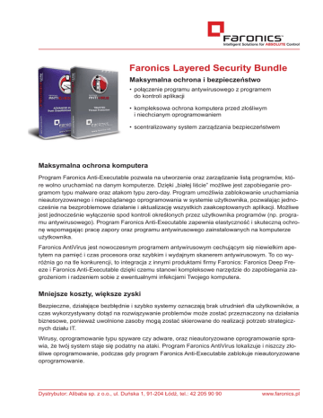 Faronics Layered Security Bundle Maksymalna ochrona i bezpieczeństwo • połączenie programu antywirusowego z programem do kontroli aplikacji • kompleksowa ochrona komputera przed złośliwym i niechcianym oprogramowaniem • scentralizowany system zarządzania bezpieczeństwem Maksymalna ochrona komputera Program Faronics Anti-Executable pozwala na utworzenie oraz zarządzanie listą programów, które wolno uruchamiać na danym komputerze. Dzięki „białej liście” możliwe jest zapobieganie programom typu malware oraz atakom typu zero-day. Program umożliwia zablokowanie uruchamiania nieautoryzowanego i niepożądanego oprogramowania w systemie użytkownika, pozwalając jednocześnie na bezproblemowe działanie i aktualizację wszystkich zaakceptowanych aplikacji. Możliwe jest jednocześnie wyłączenie spod kontroli określonych przez użytkownika programów (np. programu antywirusowego). Program Faronics Anti-Executable zapewnia elastyczność i skuteczną ochronę wspomagając pracę zapory oraz programu antywirusowego zainstalowanych na komputerze użytkownika. Faronics AntiVirus jest nowoczesnym programem antywirusowym cechującym się niewielkim apetytem na pamięć i czas procesora oraz szybkim i wydajnym skanerem antywirusowym. To co wyróżnia go na tle konkurencji, to integracja z innymi produktami firmy Faronics: Faronics Deep Freeze i Faronics Anti-Executable dzięki czemu stanowi kompleksowe narzędzie do zapobiegania zagrożeniom i radzeniem sobie z ewentualnymi infekcjami Twojego komputera. Mniejsze koszty, większe zyski Bezpieczne, działające bezbłędnie i szybko systemy oznaczają brak utrudnień dla użytkowników, a czas wykorzystywany dotąd na rozwiązywanie problemów może zostać przeznaczony na działania biznesowe, ponieważ uwolnione zasoby mogą zostać skierowane do realizacji potrzeb strategicznych działu IT. Wirusy, oprogramowanie typu spyware czy adware, oraz nieautoryzowane oprogramowanie sprawia, że twój system staje się podatny na ataki. Program Faronics AntiVirus lokalizuje i niszczy złośliwe oprogramowanie, podczas gdy program Faronics Anti-Executable zablokuje nieautoryzowane oprogramowanie. Dystrybutor: Alibaba sp. z o.o., ul. Duńska 1, 91-204 Łódź, tel.: 42 205 90 90 www.faronics.pl Faronics Layered Security Bundle Podstawowe funkcje • połączenie programu antywirusowego i programu do kontroli aplikacji • skalowalna architektura • aktualizacja bazy wirusów przechowywana na serwerze Faronics Core • blokowanie działania nieautoryzowanych czy niebezpiecznych aplikacji na stacjach roboczych • śledzenie zablokowanych aplikacji, bieżący status programu i otrzymywanie szczegółowych raportów na temat wszystkich stacji roboczych • wydajne zarządzanie wszystkimi stacjami roboczymi przez Faronics Core Dystrybutor: Alibaba sp. z o.o., ul. Duńska 1, 91-204 Łódź, tel.: 42 205 90 90 www.faronics.pl