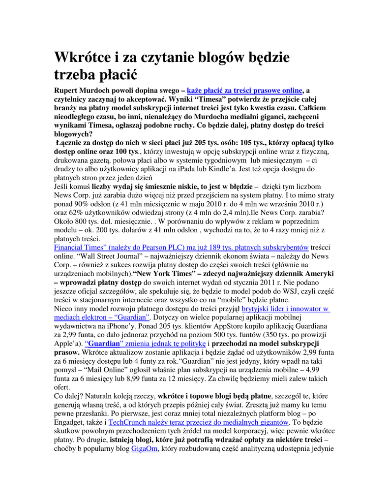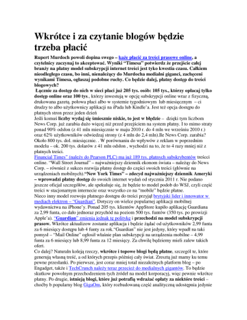 Wkrótce i za czytanie blogów będzie trzeba płacić Rupert Murdoch powoli dopina swego – kaŜe płacić za treści prasowe online, a czytelnicy zaczynaj to akceptować. Wyniki “Timesa” potwierdz Ŝe przejście całej branŜy na płatny model subskrypcji internet treści jest tyko kwestia czasu. Całkiem nieodległego czasu, bo inni, nienaleŜący do Murdocha medialni giganci, zachęceni wynikami Timesa, ogłaszaj podobne ruchy. Co będzie dalej, płatny dostęp do treści blogowych? Łącznie za dostęp do nich w sieci płaci juŜ 205 tys. osób: 105 tys., którzy opłacaj tylko dostęp online oraz 100 tys., którzy inwestują w opcję subskrypcji online wraz z fizyczną, drukowana gazetą. połowa płaci albo w systemie tygodniowym lub miesięcznym – ci drudzy to albo uŜytkownicy aplikacji na iPada lub Kindle’a. Jest teŜ opcja dostępu do płatnych stron przez jeden dzień Jeśli komuś liczby wydaj się śmiesznie niskie, to jest w błędzie – dzięki tym liczbom News Corp. juŜ zarabia duŜo więcej niŜ przed przejściem na system płatny. I to mimo straty ponad 90% odsłon (z 41 mln miesięcznie w maju 2010 r. do 4 mln we wrześniu 2010 r.) oraz 62% uŜytkowników odwiedzaj strony (z 4 mln do 2,4 mln).Ile News Corp. zarabia? Około 800 tys. dol. miesięcznie. . W porównaniu do wpływów z reklam w poprzednim modelu – ok. 200 tys. dolarów z 41 mln odsłon , wychodzi na to, Ŝe to 4 razy mniej niŜ z płatnych treści. Financial Times” (naleŜy do Pearson PLC) ma juŜ 189 tys. płatnych subskrybentów treścci online. “Wall Street Journal” – najwaŜniejszy dziennik ekonom świata – naleŜąy do News Corp. – równieŜ z sukces rozwija płatny dostęp do części swoich treści (głównie na urządzeniach mobilnych).“New York Times” – zdecyd najwaŜniejszy dziennik Ameryki – wprowadzi płatny dostęp do swoich internet wydań od stycznia 2011 r. Nie podano jeszcze oficjal szczegółów, ale spekuluje się, Ŝe będzie to model podob do WSJ, czyli część treści w stacjonarnym internecie oraz wszystko co na “mobile” będzie płatne. Nieco inny model rozwoju płatnego dostępu do treści przyjął brytyjski lider i innowator w mediach elektron – “Guardian”. Dotyczy on wielce popularnej aplikacji mobilnej wydawnictwa na iPhone’y. Ponad 205 tys. klientów AppStore kupiło aplikację Guardiana za 2,99 funta, co dało jednoraz przychód na poziom 500 tys. funtów (350 tys. po prowizji Apple’a). “Guardian” zmienia jednak tę politykę i przechodzi na model subskrypcji prasow. Wkrótce aktualizow zostanie aplikacja i będzie Ŝądać od uŜytkowników 2,99 funta za 6 miesięcy dostępu lub 4 funty za rok.“Guardian” nie jest jedyny, który wpadł na taki pomysł – “Mail Online” ogłosił właśnie plan subskrypcji na urządzenia mobilne – 4,99 funta za 6 miesięcy lub 8,99 funta za 12 miesięcy. Za chwilę będziemy mieli zalew takich ofert. Co dalej? Naturaln koleją rzeczy, wkrótce i topowe blogi będą płatne, szczegól te, które generują własną treść, a od których przepis póŜniej cały świat. Zresztą juŜ mamy ku temu pewne przesłanki. Po pierwsze, jest coraz mniej total niezaleŜnych platform blog – po Engadget, takŜe i TechCrunch naleŜy teraz przecieŜ do medialnych gigantów. To będzie skutkow powolnym przechodzeniem tych Ŝródeł na model korporacyj, więc pewnie wkrótce płatny. Po drugie, istnieją blogi, które juŜ potrafią wdraŜać opłaty za niektóre treści – choćby b popularny blog GigaOm, który rozbudowaną część analityczną udostępnia jedynie uŜytkownikom płatnej wersji GigaOm Pro. Rupert Murdoch moŜe nie umieć obsługiw e-maila, ale jednego nie moŜna mu odmówić – pokazuje godną podziwu determinację w dąŜeniu do urealnienia biznesu, jakim jest info medialna w internecie. Przy okazji zmienia nieco optykę analizy popularności danego Ŝródła – nie licza się odsłony i liczba uŜytkowników, liczy się liczba uŜytkowników, którzy decydują się płacić za dostęp do treści online.