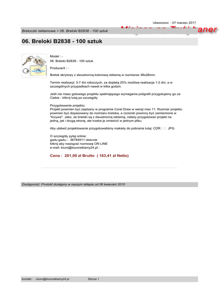 Utworzono : 07 marzec 2017 Breloczki reklamowe > 06. Breloki B2838 - 100 sztuk 06. Breloki B2838 - 100 sztuk Model : 06. Breloki B2838 - 100 sztuk Producent : Brelok akrylowy z dwustronną kolorową reklamą w rozmiarze 38x28mm. Termin realizacji: 3-7 dni roboczych, za dopłatą 20% możliwa realizacja 1-2 dni, a w szczególnych przypadkach nawet w kilka godzin. Jeśli nie masz gotowego projektu spełniającego wymagania poligrafii przygotujemy go za Ciebie - kliknij tutaj po szczegóły Przygotowanie projektu: Projekt powinien być zapisany w programie Corel Draw w wersji max 11. Rozmiar projektu powinien być dopasowany do rozmiaru breloka, a czcionki powinny być zamiemione w "krzywe". Jako, że breloki są z dwustronną reklamą, należy przygotować projekt na jedną, jak i drugą stronę, ale trzeba je zmieścić w jednym pliku. Aby ułatwić projektowanie przygotowaliśmy makiety do pobrania tutaj: CDR�� JPG O szczegóły pytaj online: gadu-gadu:�36784911 obecnie kliknij aby nawiązać rozmowę ON LINE e-mail: [email protected]� Cena : 201,00 zł Brutto ( 163,41 zł Netto) Dostępność: Produkt dostępny w naszym sklepie od 06 kwiecień 2010 kontakt : - [email protected] Strona 1