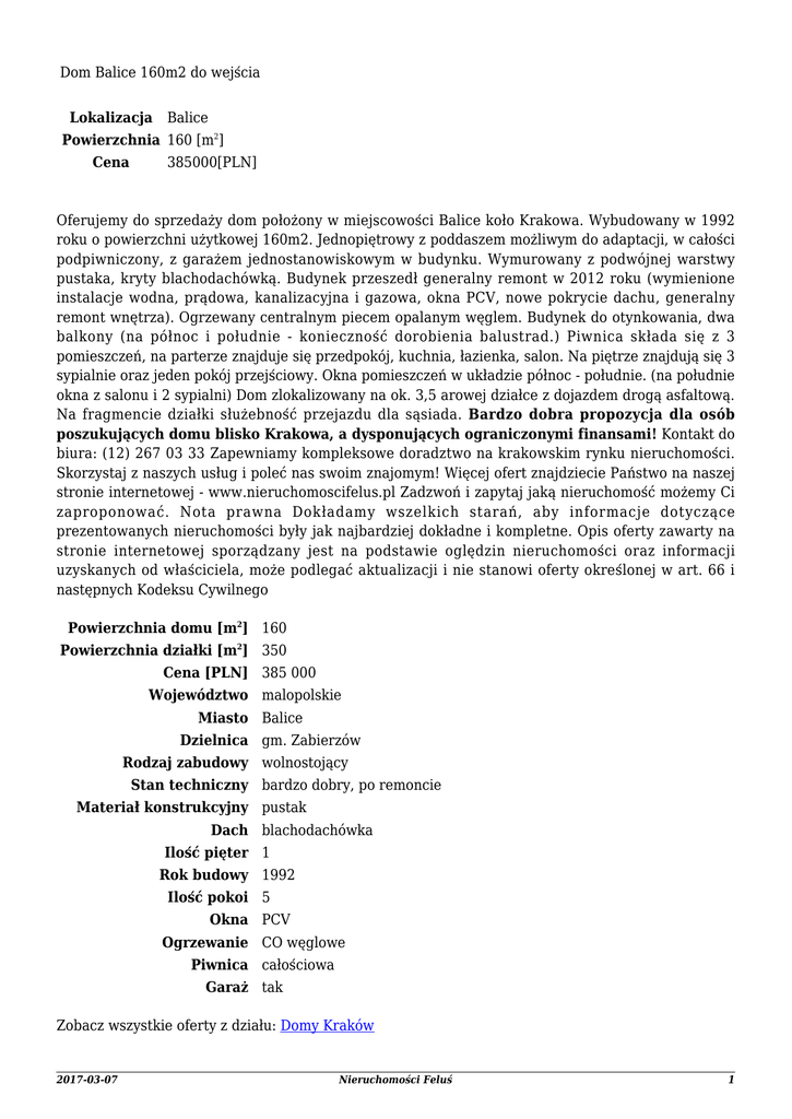 Dom Balice 160m2 do wejścia Lokalizacja Balice Powierzchnia 160 [m2] Cena 385000[PLN] Oferujemy do sprzedaży dom położony w miejscowości Balice koło Krakowa. Wybudowany w 1992 roku o powierzchni użytkowej 160m2. Jednopiętrowy z poddaszem możliwym do adaptacji, w całości podpiwniczony, z garażem jednostanowiskowym w budynku. Wymurowany z podwójnej warstwy pustaka, kryty blachodachówką. Budynek przeszedł generalny remont w 2012 roku (wymienione instalacje wodna, prądowa, kanalizacyjna i gazowa, okna PCV, nowe pokrycie dachu, generalny remont wnętrza). Ogrzewany centralnym piecem opalanym węglem. Budynek do otynkowania, dwa balkony (na północ i południe - konieczność dorobienia balustrad.) Piwnica składa się z 3 pomieszczeń, na parterze znajduje się przedpokój, kuchnia, łazienka, salon. Na piętrze znajdują się 3 sypialnie oraz jeden pokój przejściowy. Okna pomieszczeń w układzie północ - południe. (na południe okna z salonu i 2 sypialni) Dom zlokalizowany na ok. 3,5 arowej działce z dojazdem drogą asfaltową. Na fragmencie działki służebność przejazdu dla sąsiada. Bardzo dobra propozycja dla osób poszukujących domu blisko Krakowa, a dysponujących ograniczonymi finansami! Kontakt do biura: (12) 267 03 33 Zapewniamy kompleksowe doradztwo na krakowskim rynku nieruchomości. Skorzystaj z naszych usług i poleć nas swoim znajomym! Więcej ofert znajdziecie Państwo na naszej stronie internetowej - www.nieruchomoscifelus.pl Zadzwoń i zapytaj jaką nieruchomość możemy Ci zaproponować. Nota prawna Dokładamy wszelkich starań, aby informacje dotyczące prezentowanych nieruchomości były jak najbardziej dokładne i kompletne. Opis oferty zawarty na stronie internetowej sporządzany jest na podstawie oględzin nieruchomości oraz informacji uzyskanych od właściciela, może podlegać aktualizacji i nie stanowi oferty określonej w art. 66 i następnych Kodeksu Cywilnego Powierzchnia domu [m2] 160 Powierzchnia działki [m2] 350 Cena [PLN] 385 000 Województwo malopolskie Miasto Balice Dzielnica gm. Zabierzów Rodzaj zabudowy wolnostojący Stan techniczny bardzo dobry, po remoncie Materiał konstrukcyjny pustak Dach blachodachówka Ilość pięter 1 Rok budowy 1992 Ilość pokoi 5 Okna PCV Ogrzewanie CO węglowe Piwnica całościowa Garaż tak Zobacz wszystkie oferty z działu: Domy Kraków 2017-03-07 Nieruchomości Feluś 1