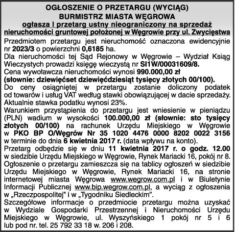OGŁOSZENIE O PRZETARGU (WYCIĄG) BURMISTRZ MIASTA WĘGROWA ogłasza I przetarg ustny nieograniczony na sprzedaż nieruchomości gruntowej położonej w Węgrowie przy ul. Zwycięstwa Przedmiotem przetargu jest nieruchomość oznaczona ewidencyjnie nr 2023/3 o powierzchni 0,6185 ha. Dla nieruchomości tej Sąd Rejonowy w Węgrowie – Wydział Ksiąg Wieczystych prowadzi księgę wieczystą nr SI1W/00031609/8. Cena wywoławcza nieruchomości wynosi 990.000,00 zł (słownie: dziewięćset dziewięćdziesiąt tysięcy złotych 00/100). Do ceny osiągniętej w przetargu zostanie doliczony podatek od towarów i usług VAT według stawki obowiązującej w dacie sprzedaży. Aktualnie stawka podatku wynosi 23%. Warunkiem przystąpienia do przetargu jest wniesienie w pieniądzu (PLN) wadium w wysokości 100.000,00 zł (słownie: sto tysięcy złotych 00/100) na rachunek Urzędu Miejskiego w Węgrowie w PKO BP O/Węgrów Nr 35 1020 4476 0000 8202 0022 3156 w terminie do dnia 6 kwietnia 2017 r. (data wpływu na konto). Przetarg odbędzie się w dniu 11 kwietnia 2017 r. o godz. 12.00 w siedzibie Urzędu Miejskiego w Węgrowie, Rynek Mariacki 16, pokój nr 8. Ogłoszenie o przetargu zamieszcza się na tablicy ogłoszeń w siedzibie Urzędu Miejskiego w Węgrowie, Rynek Mariacki 16, na stronie internetowej miasta Węgrowa www.wegrow.com.pl i w Biuletynie Informacji Publicznej www.bip.wegrow. com.pl, a wyciąg z ogłoszenia w „Rzeczpospolitej” i w „Tygodniku Siedleckim”. Szczegółowe informacje o przedmiocie przetargu można uzyskać w Wydziale Gospodarki Przestrzennej i Nieruchomości Urzędu Miejskiego w Węgrowie ul. Wyszyńskiego 1 pokój nr 5 i 6 lub pod nr tel. 25 792 33 18 w. 206 i 208.