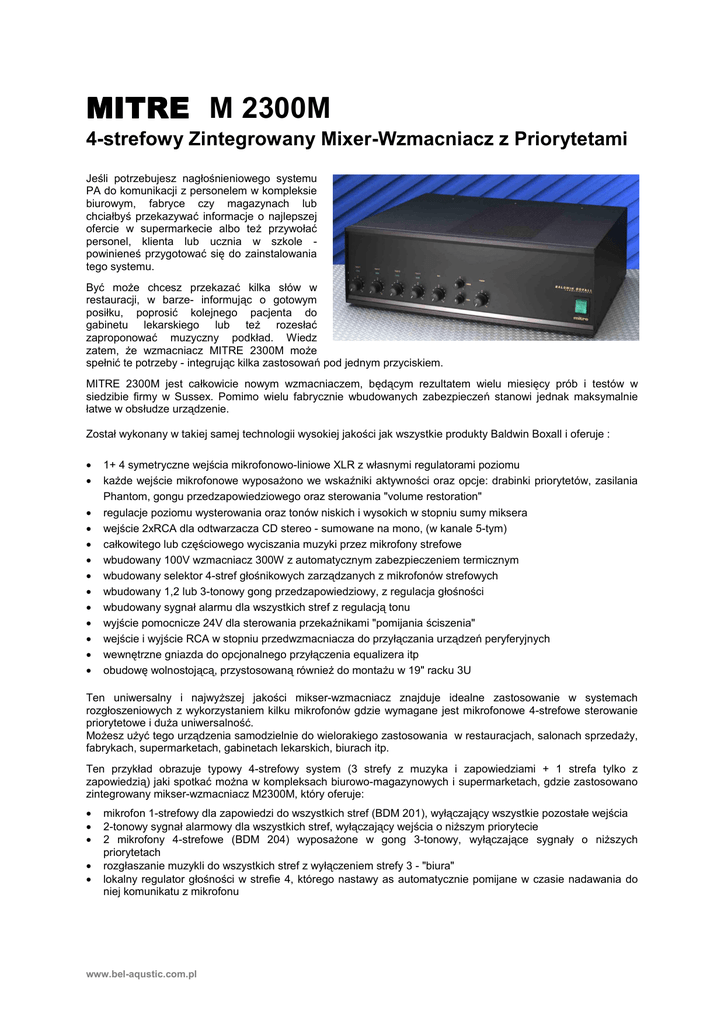 MITRE M 2300M 4-strefowy Zintegrowany Mixer-Wzmacniacz z Priorytetami Jeśli potrzebujesz nagłośnieniowego systemu PA do komunikacji z personelem w kompleksie biurowym, fabryce czy magazynach lub chciałbyś przekazywać informacje o najlepszej ofercie w supermarkecie albo też przywołać personel, klienta lub ucznia w szkole powinieneś przygotować się do zainstalowania tego systemu. Być może chcesz przekazać kilka słów w restauracji, w barze- informując o gotowym posiłku, poprosić kolejnego pacjenta do gabinetu lekarskiego lub też rozesłać zaproponować muzyczny podkład. Wiedz zatem, że wzmacniacz MITRE 2300M może spełnić te potrzeby - integrując kilka zastosowań pod jednym przyciskiem. MITRE 2300M jest całkowicie nowym wzmacniaczem, będącym rezultatem wielu miesięcy prób i testów w siedzibie firmy w Sussex. Pomimo wielu fabrycznie wbudowanych zabezpieczeń stanowi jednak maksymalnie łatwe w obsłudze urządzenie. Został wykonany w takiej samej technologii wysokiej jakości jak wszystkie produkty Baldwin Boxall i oferuje : • • • • • • • • • • • • • 1+ 4 symetryczne wejścia mikrofonowo-liniowe XLR z własnymi regulatorami poziomu każde wejście mikrofonowe wyposażono we wskaźniki aktywności oraz opcje: drabinki priorytetów, zasilania Phantom, gongu przedzapowiedziowego oraz sterowania "volume restoration" regulacje poziomu wysterowania oraz tonów niskich i wysokich w stopniu sumy miksera wejście 2xRCA dla odtwarzacza CD stereo - sumowane na mono, (w kanale 5-tym) całkowitego lub częściowego wyciszania muzyki przez mikrofony strefowe wbudowany 100V wzmacniacz 300W z automatycznym zabezpieczeniem termicznym wbudowany selektor 4-stref głośnikowych zarządzanych z mikrofonów strefowych wbudowany 1,2 lub 3-tonowy gong przedzapowiedziowy, z regulacja głośności wbudowany sygnał alarmu dla wszystkich stref z regulacją tonu wyjście pomocnicze 24V dla sterowania przekaźnikami "pomijania ściszenia" wejście i wyjście RCA w stopniu przedwzmacniacza do przyłączania urządzeń peryferyjnych wewnętrzne gniazda do opcjonalnego przyłączenia equalizera itp obudowę wolnostojącą, przystosowaną również do montażu w 19" racku 3U Ten uniwersalny i najwyższej jakości mikser-wzmacniacz znajduje idealne zastosowanie w systemach rozgłoszeniowych z wykorzystaniem kilku mikrofonów gdzie wymagane jest mikrofonowe 4-strefowe sterowanie priorytetowe i duża uniwersalność. Możesz użyć tego urządzenia samodzielnie do wielorakiego zastosowania w restauracjach, salonach sprzedaży, fabrykach, supermarketach, gabinetach lekarskich, biurach itp. Ten przykład obrazuje typowy 4-strefowy system (3 strefy z muzyka i zapowiedziami + 1 strefa tylko z zapowiedzią) jaki spotkać można w kompleksach biurowo-magazynowych i supermarketach, gdzie zastosowano zintegrowany mikser-wzmacniacz M2300M, który oferuje: • • • • • mikrofon 1-strefowy dla zapowiedzi do wszystkich stref (BDM 201), wyłączający wszystkie pozostałe wejścia 2-tonowy sygnał alarmowy dla wszystkich stref, wyłączający wejścia o niższym priorytecie 2 mikrofony 4-strefowe (BDM 204) wyposażone w gong 3-tonowy, wyłączające sygnały o niższych priorytetach rozgłaszanie muzykli do wszystkich stref z wyłączeniem strefy 3 - "biura" lokalny regulator głośności w strefie 4, którego nastawy as automatycznie pomijane w czasie nadawania do niej komunikatu z mikrofonu www.bel-aqustic.com.pl Specyfikacje techniczne MITRE M2300M Nominalna moc wyjściowa w linii 100V, przy zasilaniu sieciowym 230V 300W - 33 Ohm Zniekształcenia THD, przy 1kHz na wszystkich wyjściach i zasilaniu 230V mniej niż 0,5%, typowo 0,2% Typowa moc wyjściowa, przy THD 1% i zasilaniu 230V 340W - 29 Ohm Stabilność sygnału wyjściowego dla 1kHz i 100V lepsza niż 1 dB Wyjściowe napięcie pracy - przez wybór przyłącza 50V & 100V Napięcie zasilania sieciowego 220 - 240V , 50 - 60Hz Pobór mocy @ 230V - w spoczynku Pobór mocy @ 230V - przy pełnej mocy @ 1kHz 26 VA 700 VA Bezpieczniki : 1 x zasilanie sieciowe 20x5mm 2 x stopień mocy wzmacniacza 1 x wyjście zasilania AUX 20x5mm 6.3 A (zwłoczny) 20 A (szybki) 2 A (zwłoczny) Wejście muzyczne AUX, stereo - sumowane na mono czułość pasmo przenoszenia - 3dB odstęp od szumów 100mV @ 20 kOhm szersze od 40Hz - 20 kHz > 80 dB Regulacja barwy tonu bass sopran +/- 12 dB @ 100Hz +/- 12 dB @ 12 kHz Wejście uniwersalne XLR (poziom line) czułość pasmo przenoszenia - 3dB odstęp od szumów 80 mV @ 12 kOhm symetryczne szersze od 40Hz - 18 kHz > 70 dB Wejście uniwersalne XLR (poziom mic) czułość impedancja - bez Phantom impedancja - z Phantom 0.6mV @ symetryczne 12 kOhm 660 Ohm Współczynnik przesłuchu w zakresie 50 Hz - 30 kHz Pasmo przenoszenia - 3dB @ Odstęp od szumów @ 200 Ohm lepiej niż 60 dB szersze od 40 Hz - 18 kHz > 60 dB System wyjścia pomocniczego "Busy" Typu "otwarty kolektor" 0.5A @ 40V total max. Poziom wyjścia liniowego AUX Impedancja żródła 0 dB, izolowane transformatorem 100 Ohm Wyjście przekaźnika Busy/Restoration Wyjście pomocnicze zasilania 2 biegunowy przełącznik 5A @ 100V max. 30V @ 1.5A Przyłącza : 3-stykowe 2 x RCA 6-stykowe 4-stykowe 8-stykowa 3-stykowy zasilanie sieciowe wejście muzyczne AUX wejścia uniwersalne mic/line wyzwalanie Alarmu & 0dB wyjście line wyjście busy/sterowania przekaźnikiem wyjście głośnikowe Wymiary zewnętrzne (mm) D x W x H Chłodzenie wymuszone wentylatorem Waga www.bel-aqustic.com.pl DIN IEC 6A stereo sumowane na mono listwa zaciskowa listwa zaciskowa listwa zaciskowa listwa zaciskowa 340 x 430 x 132 tak 18 kg