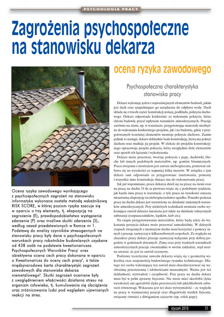 PSYCHOLOGIA PRACY Zagro˝enia psychospo∏eczne na stanowisku dekarza ocena ryzyka zawodowego Psychospo∏eczna charakterystyka stanowiska pracy Ocena ryzyka zawodowego wynikajàcego z psychospo∏ecznych zagro˝eƒ na stanowisku informatyka wykonana zosta∏a metodà wskaênikowà RISK SCORE, w której poziom ryzyka szacuje si´ w oparciu o trzy elementy, tj. ekspozycj´ na zagro˝enie (E), prawdopodobieƒstwo wystàpienia zdarzenia (P) oraz mo˝liwe skutki zdarzenia (S), wed∏ug zasad przedstawionych w Ramce nr 1 . Podstawà do analizy czynników stresogennych na stanowisku pracy by∏y dane o psychospo∏ecznych warunkach pracy robotników budowlanych uzyskane od 438 osób na podstawie kwestionariusza Psychospo∏ecznych Warunków Pracy1 oraz obiektywna ocena cech pracy dokonana w oparciu o Kwestionariusz do oceny cech pracy2 , a tak˝e mi´dzynarodowa karta charakterystyki zagro˝eƒ zawodowych dla stanowiska dekarza niemetalowego3 . Skutki zagro˝eƒ oceniane by∏y z uwzgl´dnieniem w∏aÊciwoÊci dzia∏ania stresu na organizm cz∏owieka, tj. kumulowania si´ obcià˝enia oraz zró˝nicowania ludzi pod wzgl´dem ujawnianych reakcji na stres. Dekarz wykonuje jeden z najwa˝niejszych elementów budowli, jakim jest dach oraz uzupe∏niajàce go urzàdzenia do odp∏ywu wody. Dach sk∏ada si´ z trzech cz´Êci: konstrukcji noÊnej, podk∏adu, pokrycia dachowego. Dekarz odpowiada konkretnie za wykonanie pokrycia, które chroni budowl´ przed wp∏ywem warunków atmosferycznych. Pracuje zarówno na ziemi, np. w warsztacie, przygotowujàc materia∏y niezb´dne do wykonania konkretnego projektu, jak i na budowie, gdzie z przygotowanych wczeÊniej elementów montuje pokrycie dachowe. Zanim jednak to nastàpi, dekarz dok∏adnie bada konstrukcj´, którà ma pokryç dachem oraz studiuje jej projekt. W efekcie do projektu konstrukcyjnego opracowuje projekt pokrycia, który uwzgl´dnia iloÊç elementów oraz sposób ich ∏àczenia i wykoƒczenia. Dekarz mo˝e pracowaç, tworzàc pokrycia z papy, dachówki, blachy lub innych podobnych materia∏ów, np. gontów bitumicznych. Praca zwiàzana z monta˝em jest zawsze niebezpieczna, poniewa˝ odbywa si´ na wysokoÊci co najmniej kilku metrów. W zwiàzku z tym dekarz sam odpowiada za przygotowane rusztowania, pomosty i wszystkie inne konstrukcje s∏u˝àce mu do wykonywania pracy. Jak ju˝ wspomniano, praca dekarza dzieli si´ na prac´ na ziemi oraz na prac´ na dachu. O ile ta pierwsza wià˝e si´ z podobnym ryzykiem, jak ka˝da inna praca w warsztacie, o tyle praca na wysokoÊci oznacza nieustannà ekspozycj´ na niebezpieczeƒstwo upadku. Ponadto podczas pracy na dachu dekarz jest wystawiony na dzia∏anie zmiennych warunków atmosferycznych. Przy niektórych technikach monta˝u osoba wykonujàca zawód dekarza nara˝ona jest tak˝e na dzia∏anie toksycznych substancji (rozpuszczalników, lepików, farb etc). Na etapie przygotowywania materia∏ów, które b´dà u˝yte do wykonania poszycia dekarz mo˝e pracowaç samodzielnie. W dalszych etapach zwiàzanych z monta˝em dachu musi korzystaç z pomocy innych i pracuje zazwyczaj w kilkuosobowych zespo∏ach. Ze wzgl´du na charakter pracy dekarz pracuje zazwyczaj wy∏àcznie przy dobrej pogodzie w godzinach dziennych. Zimà oraz przy trudnych warunkach atmosferycznych pracuje ewentualnie w swoim zak∏adzie, stàd mo˝na uwa˝aç, ˝e jest to zawód sezonowy. Podstawy teoretyczne zawodu dekarza wià˝à si´ z geometrià wykreÊlnà oraz znajomoÊcià budowlanego rysunku technicznego. Dlatego te˝ osoba wykonujàca ten zawód musi charakteryzowaç si´ wyobraênià przestrzennà i zdolnoÊciami manualnymi. Wa˝na jest te˝ dok∏adnoÊç, wytrwa∏oÊç i cierpliwoÊç. Przy pracy na dachu dekarz musi byç w pe∏ni sprawny fizycznie. Nie mo˝e mieç akrofobii (l´ku wysokoÊci) ani agorafobii (l´ku przestrzeni) lub jakichkolwiek zaburzeƒ równowagi. Wskazana jest te˝ du˝a wytrzyma∏oÊç – ze wzgl´du na prac´ w wymuszonej pozycji oraz d∏ugotrwa∏y wysi∏ek fizyczny, zwiàzany równie˝ z dêwiganiem ci´˝arów (np. rolek papy). styczeƒ 2010 51 PSYCHOLOGIA PRACY Karta informacji o zagro˝eniach psychospo∏ecznych na stanowisku dekarza Czynniki zagra˝ajàce èród∏o zagro˝enia (sytuacje zagra˝ajàce) 1. Przecià˝enie iloÊciowe pracà – cz´sty i znaczny wysi∏ek fizyczny – zbyt du˝o pracy do wykonania (okresowo) – nierównomierne tempo pracy (uzale˝nienie od pogody) 2. Przecià˝enie jakoÊciowe pracà – du˝e konsekwencje b∏´du w pracy – koniecznoÊç zachowania sta∏ej czujnoÊci 3. Przecià˝enie roli – koniecznoÊç kooperacji z wieloma osobami 4. Fizyczne warunki pracy – zmienne warunki atmosferyczne – odór substancji chemicznych 5. Ograniczony zakres kontroli nad pracà – brak mo˝liwoÊci kontroli czasu i sposobu wykonania zadaƒ (zadania wynikajà z projektu budowlanego i sà uzale˝nione od warunków pogodowych) – brak mo˝liwoÊci decydowania o doborze wspó∏pracowników – uzale˝nienie efektów pracy od zachowaƒ innych ludzi (wynik koniecznoÊci pracy zespo∏owej) – brak wp∏ywu na fizyczne warunki pracy – niewielki wp∏yw na podejmowane decyzje wp∏ywajàce na organizacj´ pracy (o organizacji pracy decyduje majster lub kierownik budowy) 52 styczeƒ 2010 Mo˝liwe skutki zagro˝eƒ w zale˝noÊci od ekspozycji i zasobów jednostki (odpornoÊci i umiej´tnoÊci radzenia sobie, a tak˝e zdolnoÊci regeneracyjnych) wystàpiç mogà: a) zaburzenia somatyczne: – bezsennoÊç – migreny – obni˝enie odpornoÊci organizmu (os∏abienie, zwi´kszona podatnoÊç na infekcje) – zaburzenia metabolizmu i choroby uk∏adu trawiennego – zaburzenia gospodarki hormonalnej – choroby naczyniowe: – nadciÊnienie t´tnicze – choroba wieƒcowa – zawa∏ serca – udar mózgu – przecià˝enie uk∏adu mi´Êniowo-szkieletowego – zwi´kszona podatnoÊç na choroby nowotworowe (np. przez wzmo˝one palenie tytoni