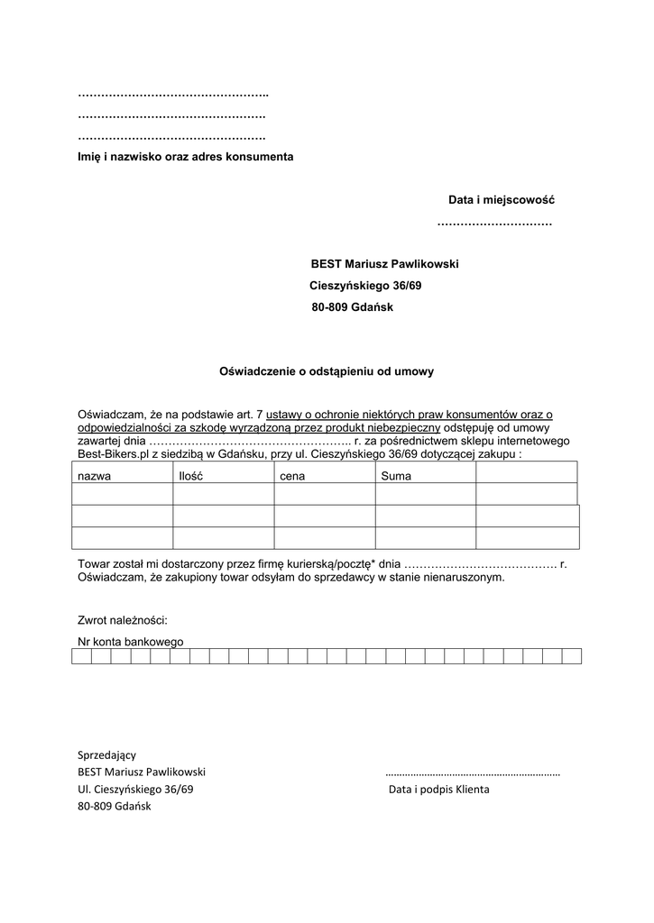 ………………………………………….. …………………………………………. …………………………………………. Imię i nazwisko oraz adres konsumenta Data i miejscowość ………………………… BEST Mariusz Pawlikowski Cieszyńskiego 36/69 80-809 Gdańsk Oświadczenie o odstąpieniu od umowy Oświadczam, że na podstawie art. 7 ustawy o ochronie niektórych praw konsumentów oraz o odpowiedzialności za szkodę wyrządzoną przez produkt niebezpieczny odstępuję od umowy zawartej dnia …………………………………………….. r. za pośrednictwem sklepu internetowego Best-Bikers.pl z siedzibą w Gdańsku, przy ul. Cieszyńskiego 36/69 dotyczącej zakupu : nazwa Ilość cena Suma Towar został mi dostarczony przez firmę kurierską/pocztę* dnia …………………………………. r. Oświadczam, że zakupiony towar odsyłam do sprzedawcy w stanie nienaruszonym. Zwrot należności: Nr konta bankowego Sprzedający BEST Mariusz Pawlikowski Ul. Cieszyńskiego 36/69 80-809 Gdańsk ……………………………………………………… Data i podpis Klienta