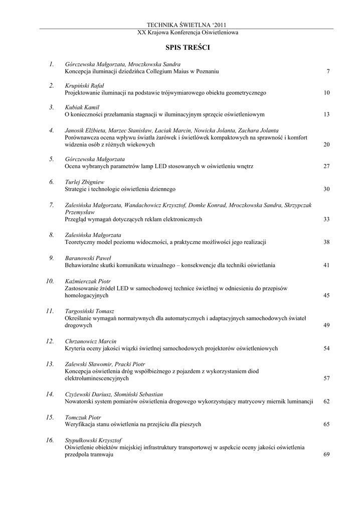 TECHNIKA ŚWIETLNA ‘2011 XX Krajowa Konferencja Oświetleniowa SPIS TREŚCI 1. 2. 3. 4. 5. 6. 7. 8. 9. 10. 11. 12. 13. 14. 15. 16. Górczewska Małgorzata, Mroczkowska Sandra Koncepcja iluminacji dziedzińca Collegium Maius w Poznaniu 7 Krupiński Rafał Projektowanie iluminacji na podstawie trójwymiarowego obiektu geometrycznego 10 Kubiak Kamil O konieczności przełamania stagnacji w iluminacyjnym sprzęcie oświetleniowym 13 Janosik Elżbieta, Marzec Stanisław, Łaciak Marcin, Nowicka Jolanta, Zachara Jolanta Porównawcza ocena wpływu światła żarówek i świetlówek kompaktowych na sprawność i komfort widzenia osób z różnych wiekowych 20 Górczewska Małgorzata Ocena wybranych parametrów lamp LED stosowanych w oświetleniu wnętrz 27 Turlej Zbigniew Strategie i technologie oświetlenia dziennego 30 Zalesińska Małgorzata, Wandachowicz Krzysztof, Domke Konrad, Mroczkowska Sandra, Skrzypczak Przemysław Przegląd wymagań dotyczących reklam elektronicznych 33 Zalesińska Małgorzata Teoretyczny model poziomu widoczności, a praktyczne możliwości jego realizacji 38 Baranowski Paweł Behawioralne skutki komunikatu wizualnego – konsekwencje dla techniki oświetlania 41 Kaźmierczak Piotr Zastosowanie źródeł LED w samochodowej technice świetlnej w odniesieniu do przepisów homologacyjnych 45 Targosiński Tomasz Określanie wymagań normatywnych dla automatycznych i adaptacyjnych samochodowych świateł drogowych 49 Chrzanowicz Marcin Kryteria oceny jakości wiązki świetlnej samochodowych projektorów oświetleniowych 54 Zalewski Sławomir, Pracki Piotr Koncepcja oświetlenia dróg współbieżnego z pojazdem z wykorzystaniem diod elektroluminescencyjnych 57 Czyżewski Dariusz, Słomiński Sebastian Nowatorski system pomiarów oświetlenia drogowego wykorzystujący matrycowy miernik luminancji 62 Tomczuk Piotr Weryfikacja stanu oświetlenia na przejściu dla pieszych 65 Stypułkowski Krzysztof Oświetlenie obiektów miejskiej infrastruktury transportowej w aspekcie oceny jakości oświetlenia przedpola tramwaju 69 TECHNIKA ŚWIETLNA ‘2011 XX Krajowa Konferencja Oświetleniowa 17. 18. 19. 20. 21. 22. 23. 24. 25. 26. 27. 28. 29. 30. 31. 32. 33. Mozyrska Dorota, Wyrwas Małgorzata, Fryc Irena Wyznaczanie parametrów kolorymetrycznych LEDa w pełnym zakresie temperatur pracy 72 Czech Eugeniusz, Fryc Irena Optymalizacja charakterystyki czułości widmowej układu elektro-optycznego spektroradiometru 76 Wandachowicz Krzysztof Optymalizacja kształtu odbłyśnika zapewniającego uzyskanie zakładanego poziomu równomierności oświetlenia 80 Borowik Lech, Kurkowski Marek Składowe mocy elektrycznej opraw z lampami fluorescencyjnymi w świetle przepisów UE 84 Tabaka Przemysław Skutki zastąpienia tradycyjnej żarówki energooszczędnymi zamiennikami 87 Gilewski Marian Algorytm pracy programowalnego sterownika z optycznym sprzężeniem zwrotnym 94 Gilewski Marian Programowalny sterownik diod laserowych oraz LED-ów 98 Dzienis Wojciech, Fryc Irena Analiza wpływu rodzaju zasilacza użytego w LEDowych oprawach oświetleniowych, na poziom generowanych przez nią zaburzeń do sieci zasilającej 102 Biczel Piotr, Sadowski Arkadiusz Czy można zasilać oświetlenie prościej i efektywniej? 106 Tomczuk Krzysztof Model laboratoryjnego układu zasilania lampy metalohalogenkowej o mocy 400W do naświetlania upraw warzywnych 109 Wojtkowski Wojciech, KarpiukAndrzej The influence of the PWM freąuency and duty cycle of a RGB LED driver on the optical spectrum of the emitted light 111 Wojtkowski Wojciech, Karpiuk Andrzej A LED current digital controller for lighting applications 114 Bonisławski Krzysztof, Fryc Irena Położenie płaszczyzny czynnej głowicy fotometrycznej luksomierza, a kształt elementu korekcji przestrzennej 116 Bonisławski Krzysztof, Fryc Irena Analiza możliwości zastosowania samomonitorujących LEDów w oświetleniu kontrolek pojazdów 119 Czyżewski Dariusz Analiza wymagań w oświetleniu drogowym w świetle najnowszych zaleceń CIE 123 Domke Konrad, Ratajczak Joanna Aplikacje wspomagające projektowanie dwuźródłowych symulatorów promieniowania słonecznego 128 Fryc Irena Istotne z punktu widzenia pomiarów kolorymetrycznych parametry spektroradiometru 133 TECHNIKA ŚWIETLNA ‘2011 XX Krajowa Konferencja Oświetleniowa 34. 35. 36. 37. 38. 39. 40. 41. 42. Gilewska Grażyna Możliwości realizacji automatycznych lub półautomatycznych pomiarów wybranych parametrów morfometrycznych w oparciu o obrazy radiologiczne 136 Grodzki Lech Regulacja barwy diod LED RGB przy zasilaniu impulsowym 140 Grodzki Lech Wybrane aspekty impulsowego i stałoprądowego sterowania diodami LED 144 Pawlak Andrzej Wyniki badań zmęczenia wzroku osób o umiarkowanym upośledzeniu widzenia w zależności od systemu oświetleniowego 148 Pawlak Andrzej, Zaremba Krzysztof Dokładność symulacji oświetlenia pośredniego z wykorzystaniem programów oświetleniowych 152 Sobótko Dorota, Szewczuk Joanna Zalecenia norm międzynarodowych dotyczące pomiarów parametrów fotometrycznych materiałów fosforescencyjnych 156 Szajna Grzegorz Komory świetlne 159 Wiśniewski Andrzej Lampy LED - ocena podstawowych parametrów 161 Zalewski Sławomir Cyfrowy zapis danych fotometrycznych opraw wieloźródłowych 165