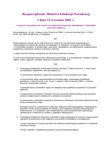 Rozporządzenie Ministra Edukacji Narodowej z dnia 12 września 2001 r. w sprawie szczegółowych zasad i warunków prowadzenia działalności w dziedzinie rekreacji ruchowej Na podstawie art. 42 ust. 3 ustawy z dnia 18 stycznia 1996 r. o kulturze fizycznej (Dz.U. z 2001r. Nr 81, poz. 889) zarządza się, co następuje: § 1. Rozporządzenie stosuje się do osób fizycznych i prawnych oraz jednostek organizacyjnych nieposiadających osobowości prawnej, prowadzących w obiektach, na terenach zamkniętych i w środowisku otwartym, w sposób stały i sezonowy, nieodpłatnie i za odpłatnością, zorganizowaną działalność w dziedzinie rekreacji ruchowej w zakresie: 1) zajęć, podczas których prowadzone są różne formy rekreacji ruchowej, 2) innych form aktywnego wypoczynku rekreacyjno-sportowego, a w szczególności: biwaków, obozów, rajdów, zlotów, spływów, turniejów, festynów i zawodów amatorskich. § 2. 1. Prowadzący działalność w dziedzinie rekreacji ruchowej, o której mowa w § 1, zwany dalej "prowadzącym działalność", jest obowiązany do: 1) opracowania regulaminu zajęć oraz zapoznania z nim uczestników tych zajęć, 2) wyznaczenia osoby odpowiedzialnej za przebieg zajęć, posiadającej kwalifikacje zawodowe, o których mowa w art. 44 ust. 1 ustawy z dnia 18 stycznia 1996 r. o kulturze fizycznej, zwanej dalej "ustawą", 3) ubezpieczenia uczestników zajęć od następstw nieszczęśliwych wypadków na zasadach ogólnych, 4) zapewnienia uczestnikom rekreacji ruchowej warunków bezpieczeństwa oraz warunków sanitarno-higienicznych określonych w odrębnych przepisach, 5) zapewnienia uczestnikom rekreacji ruchowej bazy rekreacyjno-sportowej odpowiedniej dla formy prowadzonych zajęć, 6) dopuszczenia do uczestnictwa w zajęciach wyłącznie osób posiadających zaświadczenie lekarskie o braku przeciwwskazań do udziału w tych zajęciach lub które złożą podpisane własnoręcznie, a w przypadku osób niepełnoletnich przez przedstawiciela ustawowego, oświadczenie o zdolności do udziału w zajęciach rekreacyjnych. 2. Prowadzący działalność dostarcza uczestnikom zajęć rekreacyjnych, przed ich rozpoczęciem, regulamin uczestnictwa w tych zajęciach oraz program określający w szczególności: 1) imię i nazwisko lub nazwę oraz adres lub siedzibę prowadzącego działalność w dziedzinie rekreacji ruchowej, 2) imię, nazwisko i kwalifikacje zawodowe osoby prowadzącej zajęcia, 3) termin lub terminy zajęć, 4) miejsce realizacji zajęć, 5) udostępniane urządzenia i sprzęt rekreacyjno-sportowy, 6) wyposażenie uczestników w sprzęt zabezpieczający i ochronny lub ratunkowy, 7) warunki zakwaterowania i wyżywienia, 8) cenę zajęć oraz zakres usług objętych tą ceną, 9) zasady kwalifikowania osób do udziału w zajęciach, 10) maksymalną ilość osób uczestniczących w zajęciach, 11) ilość uczestników przypadających na jednego prowadzącego zajęcia, 12) reguły zachowania się uczestników w czasie realizacji zajęć. § 3. Prowadzący działalność jest uprawniony do: 1) organizowania zajęć, 2) organizowania i prowadzenia klubów, sekcji i stałych zespołów. § 4. Prowadzący działalność zapewnia odpowiednio widzom i uczestnikom: 1) udzielanie świadczeń zdrowotnych, w ramach pierwszej pomocy medycznej, w miejscu prowadzenia zajęć, 2) zaplecze sanitarno-higieniczne, w tym w szczególności osobno oznakowane węzły sanitarne dla kobiet i mężczyzn, w ilościach uzgodnionych z powiatowym inspektorem sanitarnym, 3) regulamin imprezy, określający reguły zachowania się osób obecnych na imprezie, 4) umieszczenie w widocznym miejscu regulaminu określającego sposób korzystania z obiektu i znajdujących się w nim urządzeń. § 5. Udostępniane lub wynajmowane do prowadzenia działalności rekreacyjnej obiekty rekreacyjnosportowe, a także sprzęt i urządzenia rekreacyjno-sportowe przeznaczone do tej działalności, powinny spełniać wymogi określone w odrębnych przepisach. § 6. 1. Sprawność techniczna i kompletność urządzeń i sprzętu, o których mowa w § 5, podlega sprawdzeniu każdorazowo przed ich udostępnieniem uczestnikom zajęć rekreacyjnych przez osobę prowadzącą zajęcia. 2. Jeżeli korzystanie z urządzenia lub sprzętu rekreacyjno-sportowego może stanowić zagrożenie dla zdrowia lub życia, podmiot udostępniający urządzenie lub sprzęt zapoznaje osoby korzystające z nich z instrukcją prawidłowego i bezpiecznego ich używania albo zapewnia korzystanie z tych urządzeń i sprzętu pod nadzorem osób posiadających kwalifikacje, o których mowa w art. 44 ust. 1 ustawy. § 7. Warunki bezpieczeństwa, jakie powinny być spełnione podczas prowadzenia działalności w dziedzinie rekreacji ruchowej: 1) przez szkoły i placówki systemu oświaty, 2) na drogach publicznych, w górach i nad wodą, 3) w dyscyplinach lub dziedzinach sportu wymienionych w art. 53 ustawy - określają odrębne przepisy. § 8. Rozporządzenie wchodzi w życie po upływie 14 dni od dnia ogłoszenia. Minister Edukacji Narodowej: E. Wittbrodt