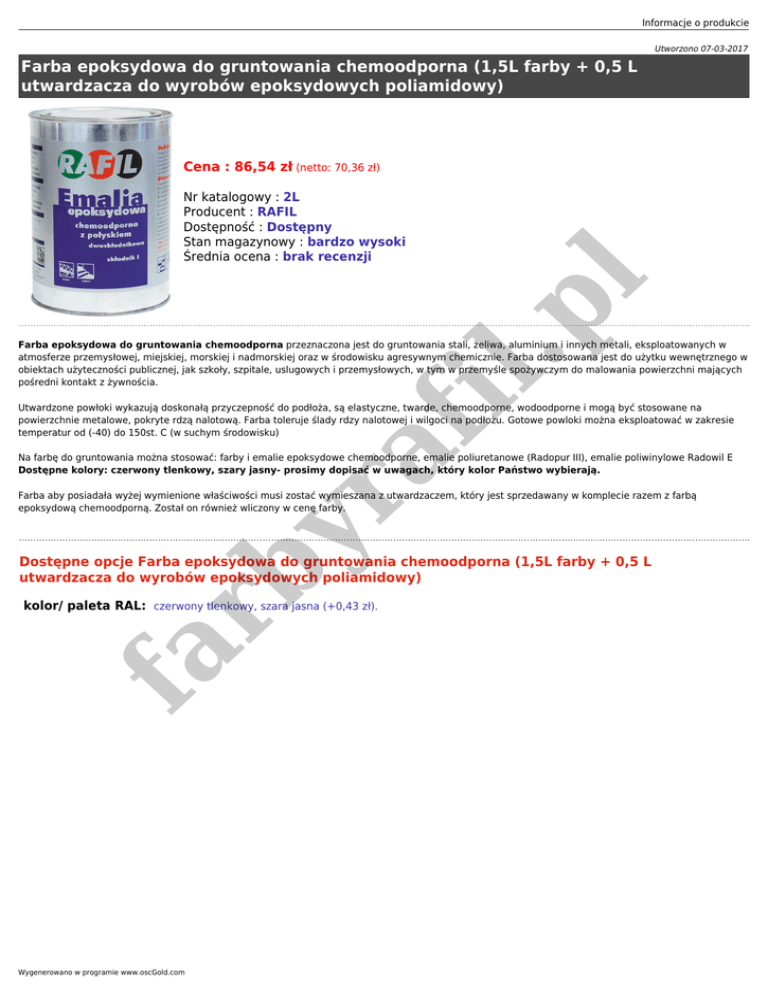 Informacje o produkcie Utworzono 07-03-2017 Farba epoksydowa do gruntowania chemoodporna (1,5L farby + 0,5 L utwardzacza do wyrobów epoksydowych poliamidowy) Cena : 86,54 zł (netto: 70,36 zł) fi l.p l Nr katalogowy : 2L Producent : RAFIL Dostępność : Dostępny Stan magazynowy : bardzo wysoki Średnia ocena : brak recenzji Farba epoksydowa do gruntowania chemoodporna przeznaczona jest do gruntowania stali, żeliwa, aluminium i innych metali, eksploatowanych w atmosferze przemysłowej, miejskiej, morskiej i nadmorskiej oraz w środowisku agresywnym chemicznie. Farba dostosowana jest do użytku wewnętrznego w obiektach użyteczności publicznej, jak szkoły, szpitale, uslugowych i przemysłowych, w tym w przemyśle spożywczym do malowania powierzchni mających pośredni kontakt z żywnościa. ra Utwardzone powłoki wykazują doskonałą przyczepność do podłoża, są elastyczne, twarde, chemoodporne, wodoodporne i mogą być stosowane na powierzchnie metalowe, pokryte rdzą nalotową. Farba toleruje ślady rdzy nalotowej i wilgoci na podłożu. Gotowe powloki można eksploatować w zakresie temperatur od (-40) do 150st. C (w suchym środowisku) Na farbę do gruntowania można stosować: farby i emalie epoksydowe chemoodporne, emalie poliuretanowe (Radopur III), emalie poliwinylowe Radowil E Dostępne kolory: czerwony tlenkowy, szary jasny- prosimy dopisać w uwagach, który kolor Państwo wybierają. rb y Farba aby posiadała wyżej wymienione właściwości musi zostać wymieszana z utwardzaczem, który jest sprzedawany w komplecie razem z farbą epoksydową chemoodporną. Został on również wliczony w cenę farby. Dostępne opcje Farba epoksydowa do gruntowania chemoodporna (1,5L farby + 0,5 L utwardzacza do wyrobów epoksydowych poliamidowy) fa kolor/ paleta RAL: czerwony tlenkowy, szara jasna (+0,43 zł). Wygenerowano w programie www.oscGold.com