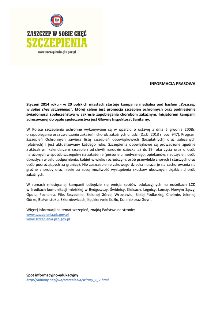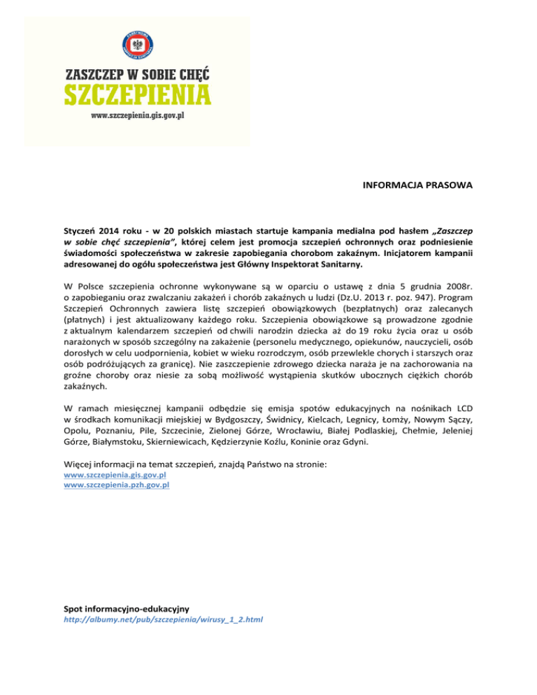 INFORMACJA PRASOWA Styczeń 2014 roku - w 20 polskich miastach startuje kampania medialna pod hasłem „Zaszczep w sobie chęć szczepienia”, której celem jest promocja szczepień ochronnych oraz podniesienie świadomości społeczeństwa w zakresie zapobiegania chorobom zakaźnym. Inicjatorem kampanii adresowanej do ogółu społeczeństwa jest Główny Inspektorat Sanitarny. W Polsce szczepienia ochronne wykonywane są w oparciu o ustawę z dnia 5 grudnia 2008r. o zapobieganiu oraz zwalczaniu zakażeń i chorób zakaźnych u ludzi (Dz.U. 2013 r. poz. 947). Program Szczepień Ochronnych zawiera listę szczepień obowiązkowych (bezpłatnych) oraz zalecanych (płatnych) i jest aktualizowany każdego roku. Szczepienia obowiązkowe są prowadzone zgodnie z aktualnym kalendarzem szczepień od chwili narodzin dziecka aż do 19 roku życia oraz u osób narażonych w sposób szczególny na zakażenie (personelu medycznego, opiekunów, nauczycieli, osób dorosłych w celu uodpornienia, kobiet w wieku rozrodczym, osób przewlekle chorych i starszych oraz osób podróżujących za granicę). Nie zaszczepienie zdrowego dziecka naraża je na zachorowania na groźne choroby oraz niesie za sobą możliwość wystąpienia skutków ubocznych ciężkich chorób zakaźnych. W ramach miesięcznej kampanii odbędzie się emisja spotów edukacyjnych na nośnikach LCD w środkach komunikacji miejskiej w Bydgoszczy, Świdnicy, Kielcach, Legnicy, Łomży, Nowym Sączy, Opolu, Poznaniu, Pile, Szczecinie, Zielonej Górze, Wrocławiu, Białej Podlaskiej, Chełmie, Jeleniej Górze, Białymstoku, Skierniewicach, Kędzierzynie Koźlu, Koninie oraz Gdyni. Więcej informacji na temat szczepień, znajdą Państwo na stronie: www.szczepienia.gis.gov.pl www.szczepienia.pzh.gov.pl Spot informacyjno-edukacyjny http://albumy.net/pub/szczepienia/wirusy_1_2.html