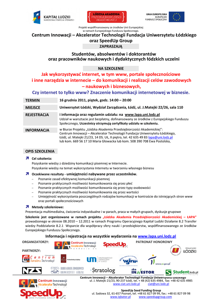 Projekt współfinansowany ze środków Unii Europejskiej w ramach Europejskiego Funduszu Społecznego. Centrum Innowacji – Akcelerator Technologii Fundacja Uniwersytetu Łódzkiego oraz SpeedUp Group ZAPRASZAJĄ Studentów, absolwentów i doktorantów oraz pracowników naukowych i dydaktycznych łódzkich uczelni NA SZKOLENIE Jak wykorzystywać internet, w tym www, portale społecznościowe i inne narzędzia w internecie – do komunikacji i realizacji celów zawodowych – naukowych i biznesowych, Czy internet to tylko www? Znaczenie komunikacji internetowej w biznesie. TERMIN 16 grudnia 2011, piątek, godz. 14:00 – 20:00 MIEJSCE Uniwersytet Łódzki, Wydział Zarządzania, Łódź, ul. J.Matejki 22/26, sala 110 REJESTRACJA i informacja oraz regulamin udziału: na www.lapa.uni.lodz.pl Udział w warsztacie jest bezpłatny, dofinansowany ze środków z Europejskiego Funduszu Społecznego, Uczestnicy otrzymują certyfikaty udziału w szkoleniu. INFORMACJA w Biurze Projektu „Łódzka Akademia Przedsiębiorczości Akademickiej”: Centrum Innowacji – Akcelerator Technologii Fundacja Uniwersytetu Łódzkiego, Łódź, ul. Matejki 21/23, 14 DS. UŁ, II piętro, tel. 42 635 49 83 [email protected] lub kom. 669 56 17 10 Maria Głowacka lub kom. 508 390 708 Ewa Postolska, OPIS SZKOLENIA Cel szkolenia: Pozyskanie wiedzy z dziedziny komunikacji pisemnej w Internecie. Pozyskanie wiedzy na temat wykorzystania Internetu w tworzeniu własnego biznesu Oczekiwane rezultaty - umiejętności nabywane przez uczestników. − − − − − Poznanie zasad efektywnej komunikacji pisemnej Poznanie praktycznych możliwości komunikowania się przez płeć Poznanie praktycznych możliwości komunikowania się przez typy osobowości Poznanie praktycznych możliwości komunikowania się przez wartości Umiejętność wykorzystania poszczególnych rodzajów komunikacji w kontraście do istniejących stron www oraz portali społecznościowych Metody szkoleniowe: Prezentacja multimedialna, ćwiczenia indywidualne i w parach, praca w małych grupach, dyskusje grupowe Szkolenie jest organizowane w ramach projektu „Łódzka Akademia Przedsiębiorczości Akademickiej – ŁAPA” prowadzonego w okresie 08.2010 – 12.2011 w ramach Programu Operacyjnego Kapitał Ludzki Działanie 8.2 Transfer wiedzy Poddziałanie 8.2.1 Wsparcie dla współpracy sfery nauki i przedsiębiorstw, współfinansowanego ze środków Europejskiego Funduszu Społecznego. Informacja i rejestracja na wszystkie wydarzenia na www.lapa.uni.lodz.pl ORGANIZATORZY: PATRONAT HONOROWY PARTNERZY: Centrum Innowacji – Akcelerator Technologii Fundacja Uniwersytetu Łódzkiego ul. J. Matejki 21/23, 90-237 Łódź, tel. + 48 (42) 635 4984, fax: +48 42 635 4985 www.ciat.uni.lodz.pl [email protected] SpeedUp Seed Funding Group ul. Sadowa 32, 61-657 Poznań, tel. +48 61 827 09 99, fax.: +48 61 827 09 98 www.iqbator.pl www.speedupgroup.com Projekt współfinansowany ze środków Unii Europejskiej w ramach Europejskiego Funduszu Społecznego. PROGRAM SZKOLENIA 16 grudnia 2011, piątek, 14:00 – 20:00 Łódź, ul. J.Matejki 22/26, Uniwersytet Łódzki Wydział Zarządzania, I piętro, sala 110 13:30 – 14:00 14:00 – 16:00 16:00-16:30 16:30 – 18:15 18:15 – 18:30 18:30 – 20:00 20:00 Rejestracja Część I Tytuł modułu: Współczesne trendy w internecie, a marketing 3.0, www, e-learning, społeczności internetowe, mailing (+e-mail-spam), reklama sieciowa − Zasady korzystania z Internetu − Jeżeli nie www, to co? − Podstawowe założenia komunikacji internetowej Lunch i networking Część II Tytuł modułu: Inspirująca komunikacja, a internetowe przekazy marketingowe. Warsztaty z komunikacji internetowej − Lingwistyka internetu − Komunikacja przez płeć − Komunikacja przez wartości − Komunikacja przez osobowości − Ćwiczenia praktyczne – tworzenie komunikatów internetowych – www/społeczność/mailing Część III Kawa i networking Część IV Tytuł modułu: Kreatywność w tworzeniu marketingowych przekazów wizualnych Warsztaty twórczego myślenia internetowego − Zasady tworzenia szablonu newsletterów − Zasady przekazów komunikacyjnych www − Zasady komunikacyjnych przekazów społecznościowych Zakończenie. Wręczenie certyfikatów udziału w szkoleniu Sylwetka Trenera : Szkolenie poprowadzi Łukasz Kuciński. Absolwent Wydziału Filologicznego oraz Marketingu i Zarządzania Uniwersytetu Łódzkiego o specjalizacji Marketingowe Zarządzanie Firmą. W latach 1999-2003 właściciel firmy o charakterze edukacyjnym, prowadzącej kursy językowe przygotowujące do egzaminów międzynarodowych. Jest autorem lub współautorem publikacji z zakresu nauczania języków obcych. Od maja 2001 na stałe związany z Wydawnictwami Szkolnymi i Pedagogicznymi na stanowisku Dyrektora Działu Nauczania Języków Obcych. Poza tworzeniem planów wydawniczych, budżetów, budowaniem zespołu redaktorów, specjalistów marketingowych i handlowców zajmuje się intensywna promocją i marketingiem internetowym przy wykorzystaniu nowoczesnych narzędzi informatycznych. Jest inicjatorem efektywnego systemu mailingowego, zbierania danych i deklaracji w systemie on-line, pozyskiwania wiedzy rynkowej za pośrednictwem portali społecznościowych i systemów ankietowania on-lineowego. Od roku 2006 członek Stowarzyszenia NLP Polska Od roku 2007 członek Grupy Trenerskiej NLP Polska Od roku 2007 założyciel i koordynator Klubu NLP Polska Łódź Od roku 2002 prowadzi szkolenia dla nauczycieli w zakresie stworzonej przez siebie strategii Inteligencji Pedagogicznej, technik motywacyjnych i procesów edukacyjnych Od roku 2008 zajmuje się głównie szkoleniami z zakresu Efektywnej Komunikacji i Inteligentnej Sprzedaży i Motywacji. Prowadzi indywidualny coaching dla menedżerów i kadry zarządzającej Właściciel firm szkoleniowych: NLP Biznesplus, Inteligencja Pedagogiczna. Centrum Innowacji – Akcelerator Technologii Fundacja Uniwersyte