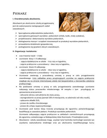 Piekarz I. Charakterystyka absolwenta. Absolwent po ukończeniu szkoły przygotowany jest do wykonywania następujących zadań zawodowych: Sporządzania półproduktów piekarskich, sporządzania gotowych wyrobów piekarskich (chleb, bułki, chały ozdobne), projektowania i dekorowania wyrobów piekarskich, obsługiwania maszyn i urządzeń stosowanych w produkcji wyrobów piekarskich, prowadzenia działalności gospodarczej, posługiwania się językiem obcym zawodowym. II. Organizacja kształcenia: • • • • • • • czas trwania nauki – 3 lata uczniowie klasy I i II odbywają: - zajęcia dydaktyczne w szkole - trzy razy w tygodniu, - zajęcia praktyczne u pracodawcy – dwa razy w tygodniu, uczniowie klasie III odbywają: - zajęcia dydaktyczne w szkole - dwa razy w tygodniu, - zajęcia praktyczne u pracodawcy – trzy razy w tygodniu, Uczniowie zawierają z pracodawcą umowę o pracę w celu przygotowania zawodowego. Lista zakładów pracy przyjmujących uczniów na zajęcia praktyczne znajduje się na stronie internetowej szkoły lub bezpośrednio u kierownika szkolenia praktycznego. Na podstawie umowy o pracę w celu przygotowania zawodowego uczniowie nabywają status pracownika młodocianego. W związku z tym przysługują im uprawnienia pracownicze: - wliczanie okresu zatrudnienia do stażu pracy, - wynagrodzenie za pracę (ponad 100 zł miesięcznie, w zależności od roku nauki), - opłacanie składki ZUS, - prawo do zasiłku chorobowego - prawo do urlopu wypoczynkowego. Uczniowie pod koniec klasy trzeciej przystępują do egzaminu potwierdzającego kwalifikację w zawodzie piekarz: Produkcja wyrobów piekarskich. Uczniowie odbywający zajęcia praktyczne w zakładach rzemieślniczych przystępują do egzaminu czeladniczego w Małopolskiej Izbie Rzemiosła i Przedsiębiorczości. Absolwenci szkoły zawodowej mogą uzyskać tytuł technika technologii żywności po uzyskaniu wykształcenia średniego oraz po ukończeniu kwalifikacyjnego kursu zawodowego, zakończonego egzaminem potwierdzającym kwalifikację: Organizacja i nadzorowanie produkcji wyrobów spożywczych. Uzupełnieniem dyplomu jest suplement w języku polskim i obcym zawierający opis kompetencji zawodowych. Po uzyskaniu matury mogą podjąć dalszą naukę na wyższych studiach. III. Możliwość zatrudnienia. Absolwenci Zasadniczej Szkoły Zawodowej po uzyskaniu tytułu piekarza mogą być zatrudnieni w piekarniach, zakładach rzemieślniczych i przemysłowych produkujących wyroby piekarskie, w punktach sprzedaży pieczywa. Mogą prowadzić także własną działalność gospodarczą.
