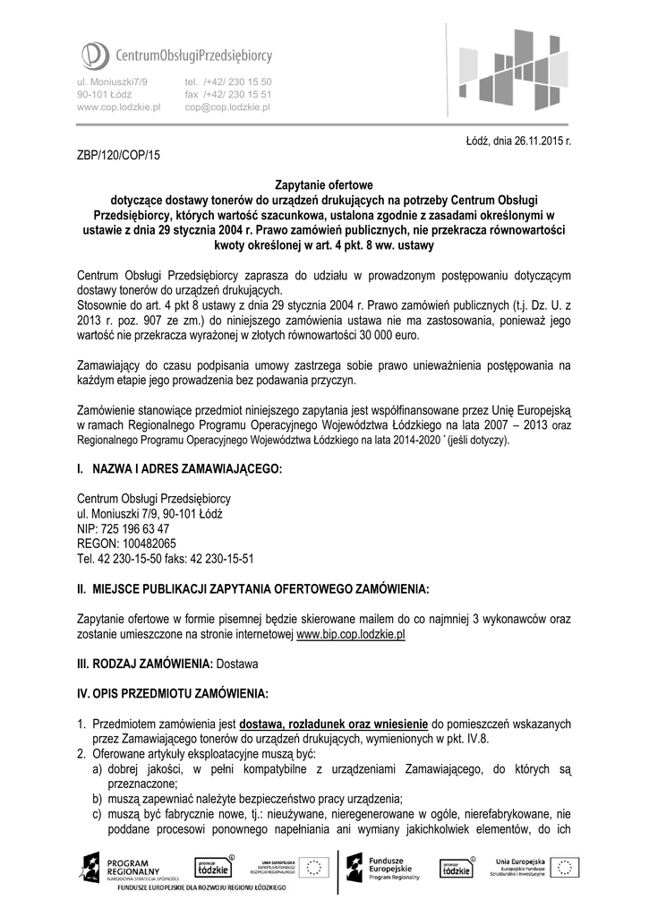 ul. Moniuszki7/9 90-101 Łódź www.cop.lodzkie.pl tel. /+42/ 230 15 50 fax /+42/ 230 15 51 [email protected] ZBP/120/COP/15 Łódź, dnia 26.11.2015 r. Zapytanie ofertowe dotyczące dostawy tonerów do urządzeń drukujących na potrzeby Centrum Obsługi Przedsiębiorcy, których wartość szacunkowa, ustalona zgodnie z zasadami określonymi w ustawie z dnia 29 stycznia 2004 r. Prawo zamówień publicznych, nie przekracza równowartości kwoty określonej w art. 4 pkt. 8 ww. ustawy Centrum Obsługi Przedsiębiorcy zaprasza do udziału w prowadzonym postępowaniu dotyczącym dostawy tonerów do urządzeń drukujących. Stosownie do art. 4 pkt 8 ustawy z dnia 29 stycznia 2004 r. Prawo zamówień publicznych (t.j. Dz. U. z 2013 r. poz. 907 ze zm.) do niniejszego zamówienia ustawa nie ma zastosowania, ponieważ jego wartość nie przekracza wyrażonej w złotych równowartości 30 000 euro. Zamawiający do czasu podpisania umowy zastrzega sobie prawo unieważnienia postępowania na każdym etapie jego prowadzenia bez podawania przyczyn. Zamówienie stanowiące przedmiot niniejszego zapytania jest współfinansowane przez Unię Europejską w ramach Regionalnego Programu Operacyjnego Województwa Łódzkiego na lata 2007 – 2013 oraz Regionalnego Programu Operacyjnego Województwa Łódzkiego na lata 2014-2020 * (jeśli dotyczy). I. NAZWA I ADRES ZAMAWIAJĄCEGO: Centrum Obsługi Przedsiębiorcy ul. Moniuszki 7/9, 90-101 Łódź NIP: 725 196 63 47 REGON: 100482065 Tel. 42 230-15-50 faks: 42 230-15-51 II. MIEJSCE PUBLIKACJI ZAPYTANIA OFERTOWEGO ZAMÓWIENIA: Zapytanie ofertowe w formie pisemnej będzie skierowane mailem do co najmniej 3 wykonawców oraz zostanie umieszczone na stronie internetowej www.bip.cop.lodzkie.pl III. RODZAJ ZAMÓWIENIA: Dostawa IV. OPIS PRZEDMIOTU ZAMÓWIENIA: 1. Przedmiotem zamówienia jest dostawa, rozładunek oraz wniesienie do pomieszczeń wskazanych przez Zamawiającego tonerów do urządzeń drukujących, wymienionych w pkt. IV.8. 2. Oferowane artykuły eksploatacyjne muszą być: a) dobrej jakości, w pełni kompatybilne z urządzeniami Zamawiającego, do których są przeznaczone; b) muszą zapewniać należyte bezpieczeństwo pracy urządzenia; c) muszą być fabrycznie nowe, tj.: nieużywane, nieregenerowane w ogóle, nierefabrykowane, nie poddane procesowi ponownego napełniania ani wymiany jakichkolwiek elementów, do ich 3. 4. 5. 6. 7. produkcji zostały wykorzystane wyłącznie elementy/półprodukty w 100% nowe, bez śladów poprzedniego używania i uszkodzenia; d) zapakowane próżniowo lub w inny sposób zabezpieczający toner przed wilgocią; e) zabezpieczone na czas transportu oraz przechowywania przed wysypaniem się tonera z kasety. Zabezpieczony musi być także bęben światłoczuły tonera przed uszkodzeniami mechanicznymi jak i dostępem światła; f) tonery muszą posiadać nienaruszone cechy pierwotnego opakowania; g) opakowane w kartonowe opakowanie zewnętrzne z opisem zawartości wraz z naniesionym logiem producenta tonera na opakowanie h) muszą spełniać normy obowiązujące na tego rodzaju artykuł; i) wyprodukowane w okresie do 12 miesięcy przed datą dostawy i objęte gwarancją Producenta na okres co najmniej 12 miesięcy; W przypadku oferowania tonerów innych producentów niż zalecane przez producenta urządzenia, Wykonawca złoży np. zaświadczenie (raport z testów) wystawione przez producenta oferowanych tonerów do drukarek lub jego upoważnionego przedstawiciela, potwierdzające spełnienie odpowiednio normy ISO/IEC 19752 i/lub ISO/IEC 19798 lub równoważnych w zakresie testowania wydajności oferowanych tonerów lub zaświadczenie wystawione przez niezależny podmiot uprawniony do kontroli jakości potwierdzający, że dostarczone produkty odpowiadają ww. normom technicznym lub równoważne zaświadczenie wystawione przez podmioty mające swoją siedzibę w innym państwie członkowskim Europejskiego Obszaru Gospodarczego. Wszystkie złożone dokumenty winny być w języku polskim lub ich tłumaczenia na język polski potwierdzone za zgodność z oryginałem przez Wykonawcę. Udowodnienie równoważności artykułów eksploatacyjnych leży po stronie Wykonawcy. W przypadku, zaoferowania tonerów do drukarek wyprodukowanych przez producenta innego niż HP oraz Kyocera, Wykonawca zobowiązany jest złożyć oświadczenie, że oferowany przez niego toner posiada sprawny, inteligentny układ elektroniczny (chip) przekazujący informację o stanie zużycia tonera, działający analogicznie jak chip w tonerach marki HP oraz Kyocera. W przypadku zaoferowania tonerów wyprodukowanych przez producenta innego niż HP oraz Kyocera Zamawiający wymaga również osobnego oświadczenia ze strony producenta lub wyłącznego dystrybutora urządzeń drukujących i materiałów eksploatacyjnych marek HP i Kyocera w Polsce dotyczące zgodności zaoferowanych tonerów z tonerami oryginalnymi. Oświadczenie musi być spersonifikowane poprzez wskazanie na potrzeby jakiego podmiotu gospodarczego lub podmiotów będzie dokonywana dostawa oraz podania w nim unikalnego numeru postępowania, którego dotyczy. Numer postępowania został nadany przez Zamawiającego. Dostarczone materiały eksploatacyjne do drukarek, powinny zawierać wszystkie elementy, które zawierają oryginalne materiały eksploatacyjne (takie jak np. rolki zbierające zużyty toner). W przypadku stwierdzenia przez Zamawiającego, w którymkolwiek z dostarczonych przez Wykonawcę nieoryginalnych materiałów eksploatacyjnych, braku chociaż jednego elementu, który występuje w oryginalnym materiale eksploatacyjnym, Zamawiający ma prawo zwrócić całą partię materiałów eksploatacyjnych i żądać niezwłocznie dostarczenia nowych, wolnych od wad, zgodnych z opisem przedmiotu zamówienia materiałów eksploatacyjnych. Wykonawca zobowiązany będzie do pokrycia kosztów naprawy urządzenia drukującego w przypadku kiedy jego uszkodzenie będzie wynikiem zastosowania w tym 
