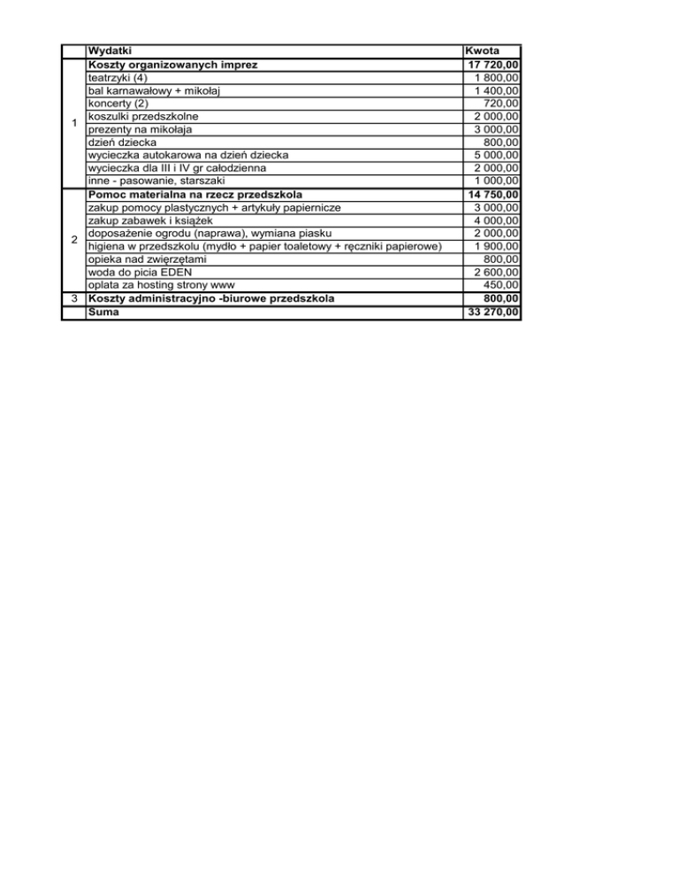 Wydatki Koszty organizowanych imprez teatrzyki (4) bal karnawałowy + mikołaj koncerty (2) koszulki przedszkolne 1 prezenty na mikołaja dzień dziecka wycieczka autokarowa na dzień dziecka wycieczka dla III i IV gr całodzienna inne - pasowanie, starszaki Pomoc materialna na rzecz przedszkola zakup pomocy plastycznych + artykuły papiernicze zakup zabawek i książek doposażenie ogrodu (naprawa), wymiana piasku 2 higiena w przedszkolu (mydło + papier toaletowy + ręczniki papierowe) opieka nad zwięrzętami woda do picia EDEN oplata za hosting strony www 3 Koszty administracyjno -biurowe przedszkola Suma Kwota 17 720,00 1 800,00 1 400,00 720,00 2 000,00 3 000,00 800,00 5 000,00 2 000,00 1 000,00 14 750,00 3 000,00 4 000,00 2 000,00 1 900,00 800,00 2 600,00 450,00 800,00 33 270,00