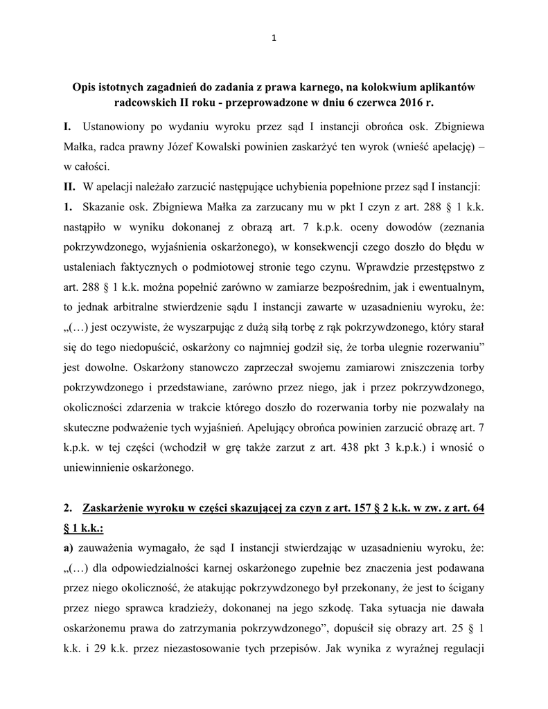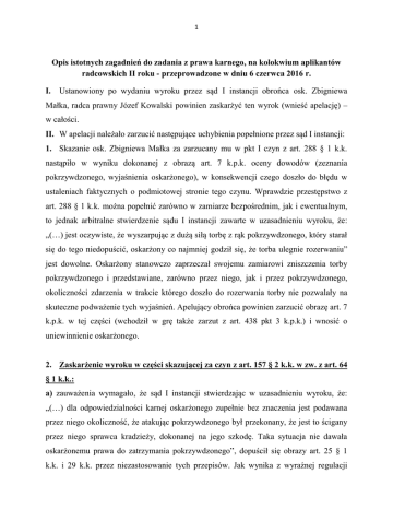 1 Opis istotnych zagadnień do zadania z prawa karnego, na kolokwium aplikantów radcowskich II roku - przeprowadzone w dniu 6 czerwca 2016 r. I. Ustanowiony po wydaniu wyroku przez sąd I instancji obrońca osk. Zbigniewa Małka, radca prawny Józef Kowalski powinien zaskarżyć ten wyrok (wnieść apelację) – w całości. II. W apelacji należało zarzucić następujące uchybienia popełnione przez sąd I instancji: 1. Skazanie osk. Zbigniewa Małka za zarzucany mu w pkt I czyn z art. 288 § 1 k.k. nastąpiło w wyniku dokonanej z obrazą art. 7 k.p.k. oceny dowodów (zeznania pokrzywdzonego, wyjaśnienia oskarżonego), w konsekwencji czego doszło do błędu w ustaleniach faktycznych o podmiotowej stronie tego czynu. Wprawdzie przestępstwo z art. 288 § 1 k.k. można popełnić zarówno w zamiarze bezpośrednim, jak i ewentualnym, to jednak arbitralne stwierdzenie sądu I instancji zawarte w uzasadnieniu wyroku, że: „(…) jest oczywiste, że wyszarpując z dużą siłą torbę z rąk pokrzywdzonego, który starał się do tego niedopuścić, oskarżony co najmniej godził się, że torba ulegnie rozerwaniu” jest dowolne. Oskarżony stanowczo zaprzeczał swojemu zamiarowi zniszczenia torby pokrzywdzonego i przedstawiane, zarówno przez niego, jak i przez pokrzywdzonego, okoliczności zdarzenia w trakcie którego doszło do rozerwania torby nie pozwalały na skuteczne podważenie tych wyjaśnień. Apelujący obrońca powinien zarzucić obrazę art. 7 k.p.k. w tej części (wchodził w grę także zarzut z art. 438 pkt 3 k.p.k.) i wnosić o uniewinnienie oskarżonego. 2. Zaskarżenie wyroku w części skazującej za czyn z art. 157 § 2 k.k. w zw. z art. 64 § 1 k.k.: a) zauważenia wymagało, że sąd I instancji stwierdzając w uzasadnieniu wyroku, że: „(…) dla odpowiedzialności karnej oskarżonego zupełnie bez znaczenia jest podawana przez niego okoliczność, że atakując pokrzywdzonego był przekonany, że jest to ścigany przez niego sprawca kradzieży, dokonanej na jego szkodę. Taka sytuacja nie dawała oskarżonemu prawa do zatrzymania pokrzywdzonego”, dopuścił się obrazy art. 25 § 1 k.k. i 29 k.k. przez niezastosowanie tych przepisów. Jak wynika z wyraźnej regulacji 2 ustawowej (art. 25 § 1), prawo do obrony przysługuje wobec zamachu na jakiekolwiek dobro chronione prawem, a więc – co oczywiste - także mienie. W sprawie jest bezsporne, że oskarżony wraz z synem ścigał sprawcę, który włamał się do jego garażu i uciekał z zabranymi stamtąd cennymi narzędziami, stanowiącymi własność oskarżonego. Oskarżony zamierzał go zatrzymać i odebrać zabrane rzeczy. Na podstawie art. 25 § 1 k.k. miał do tego prawo, bowiem ze strony sprawcy włamania do garażu w dalszym ciągu trwał bezpośredni i bezprawny zamach na mienie oskarżonego. Zgodnie z dominującym w polskiej literaturze oraz orzecznictwie poglądem, zabór rzeczy nie wyczerpuje się w unicestwieniu władztwa dotychczasowego władającego nad rzeczą. Konieczne jest uzupełnienie negatywnego elementu zaboru, tj. pozbawienia osoby uprawnionej władztwa nad rzeczą, przez element pozytywny, tj. zawładnięcie rzeczą przez dokonującego zaboru, tzn. objęcie tej rzeczy w faktyczne władanie przez sprawcę (tzw. teoria zawładnięcia). Dla zrealizowania znamienia skutku przestępstwa kradzieży muszą więc zostać przesądzone łącznie dwa elementy. Po pierwsze, fakt pozbawienia przez sprawcę osoby uprawnionej władztwa nad rzeczą. Po wtóre, objęcie tej rzeczy przez sprawcę we władanie (zob. M. Dąbrowska – Kardas, P. Kardas w: A. Zoll red. Kodeks karny, część szczególna, komentarz, tom III, Zakamycze 2006, s.34 i n.). Sprawca, którego ścigał oskarżony z synem nie zawładną jeszcze rzeczami oskarżonego jak właściciel, co przesądza, że w dalszym ciągu trwał zamach z jego strony na mienie oskarżonego. W doktrynie i orzecznictwie zgodnie przyjmuje się, że zamach jest bezpośredni tak długo, jak długo trwa stan niebezpieczeństwa dla dobra prawnego, utrzymywany przez zachowanie napastnika. Tak samo należy uznać, że spełniony został warunek bezpośredniości zamachu, gdy działanie obronne zmierza do odebrania skradzionej rzeczy uciekającemu sprawcy kradzieży. Na gruncie przestępstwa kradzieży występuje różnica między czasem dokonania i czasem zakończenia czynu zabronionego. Przyjmuje się tutaj, że zamach bezpośredni występuje także po objęciu przez sprawcę zabranej rzeczy w posiadanie, kończy się zaś z chwilą uzyskania spokojnego posiadania rzeczy przez sprawcę, np. poprzez ostateczne oderwanie się od bezpośredniego pościgu. (zob. A. Zoll w: A. Zoll red. Kodeks karny, część ogólna, komentarz, tom I, wydanie 4,Warszawa 2012, s. 454, A. Wąsek, Kodeks karny, komentarz, tom I, Gdańsk 1999, s. 301, J. Satko, 3 glosa do wyroku SA w Krakowie z 17.05.1995, II Akr 86/95, PiP 1996, nr 8-9, s. 187189). To (spokojne posiadanie rzeczy przez sprawcę) w rozstrzyganej sprawie nie nastąpiło. b) Problem działania oskarżonego w granicach obrony koniecznej stawał się jednak aktualny po rozstrzygnięciu kwestii pierwotnej, jaką był błąd oskarżonego co do osoby sprawcy kradzieży na jego szkodę. W sprawie jest bezsporne (prawidłowo ustalił to sąd I instancji), że oskarżony tracąc na krótką chwilę wzrokowy kontakt ze ściganym sprawcą włamania (co nie wyklucza bezpośredniości pościgu) w przekonaniu, że zatrzymuje właśnie jego, zatrzymał inną osobę, tj. pokrzywdzonego Janusza Kołka wobec którego zastosował przemoc w celu realizowania prawa do obrony, przez odebranie swoich rzeczy. Oskarżony zatem ewidentnie działał w błędzie co do kontratypu obrony koniecznej, o jakim mowa w art. 29 k.k. Sąd I instancji, nie analizując w ogóle okoliczności w jakich doszło do zatrzymania pokrzywdzonego i całkowicie pomijając problem błędu oskarżonego, z obrazą tego przepisu (także przez jego niezastosowani