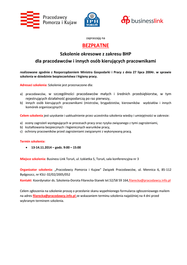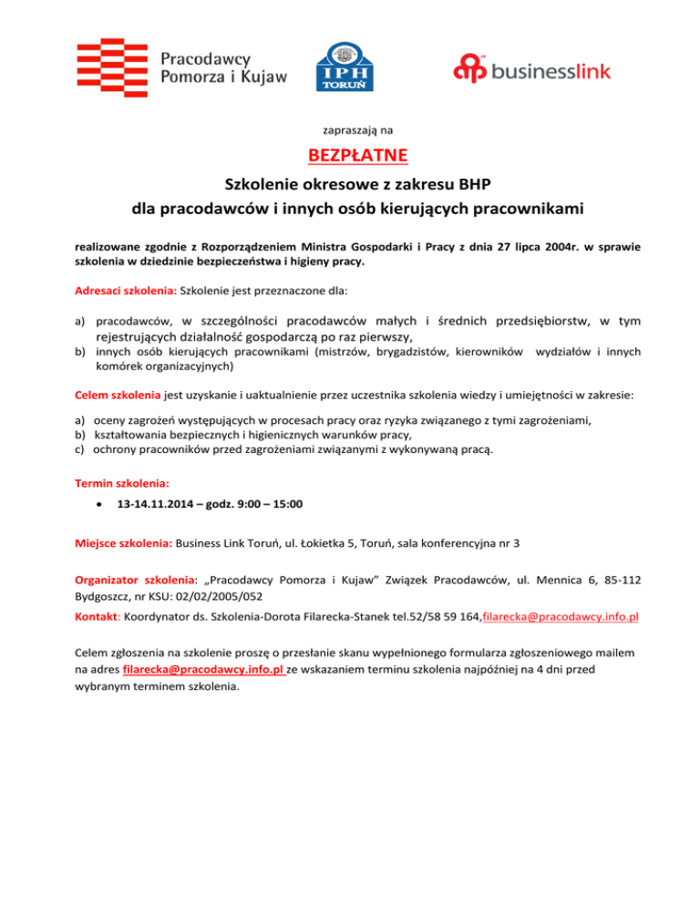 zapraszają na BEZPŁATNE Szkolenie okresowe z zakresu BHP dla pracodawców i innych osób kierujących pracownikami realizowane zgodnie z Rozporządzeniem Ministra Gospodarki i Pracy z dnia 27 lipca 2004r. w sprawie szkolenia w dziedzinie bezpieczeństwa i higieny pracy. Adresaci szkolenia: Szkolenie jest przeznaczone dla: a) pracodawców, w szczególności pracodawców małych i średnich przedsiębiorstw, w tym rejestrujących działalność gospodarczą po raz pierwszy, b) innych osób kierujących pracownikami (mistrzów, brygadzistów, kierowników wydziałów i innych komórek organizacyjnych) Celem szkolenia jest uzyskanie i uaktualnienie przez uczestnika szkolenia wiedzy i umiejętności w zakresie: a) oceny zagrożeń występujących w procesach pracy oraz ryzyka związanego z tymi zagrożeniami, b) kształtowania bezpiecznych i higienicznych warunków pracy, c) ochrony pracowników przed zagrożeniami związanymi z wykonywaną pracą. Termin szkolenia: 13-14.11.2014 – godz. 9:00 – 15:00 Miejsce szkolenia: Business Link Toruń, ul. Łokietka 5, Toruń, sala konferencyjna nr 3 Organizator szkolenia: „Pracodawcy Pomorza i Kujaw” Związek Pracodawców, ul. Mennica 6, 85-112 Bydgoszcz, nr KSU: 02/02/2005/052 Kontakt: Koordynator ds. Szkolenia-Dorota Filarecka-Stanek tel.52/58 59 164,[email protected] Celem zgłoszenia na szkolenie proszę o przesłanie skanu wypełnionego formularza zgłoszeniowego mailem na adres [email protected] ze wskazaniem terminu szkolenia najpóźniej na 4 dni przed wybranym terminem szkolenia.