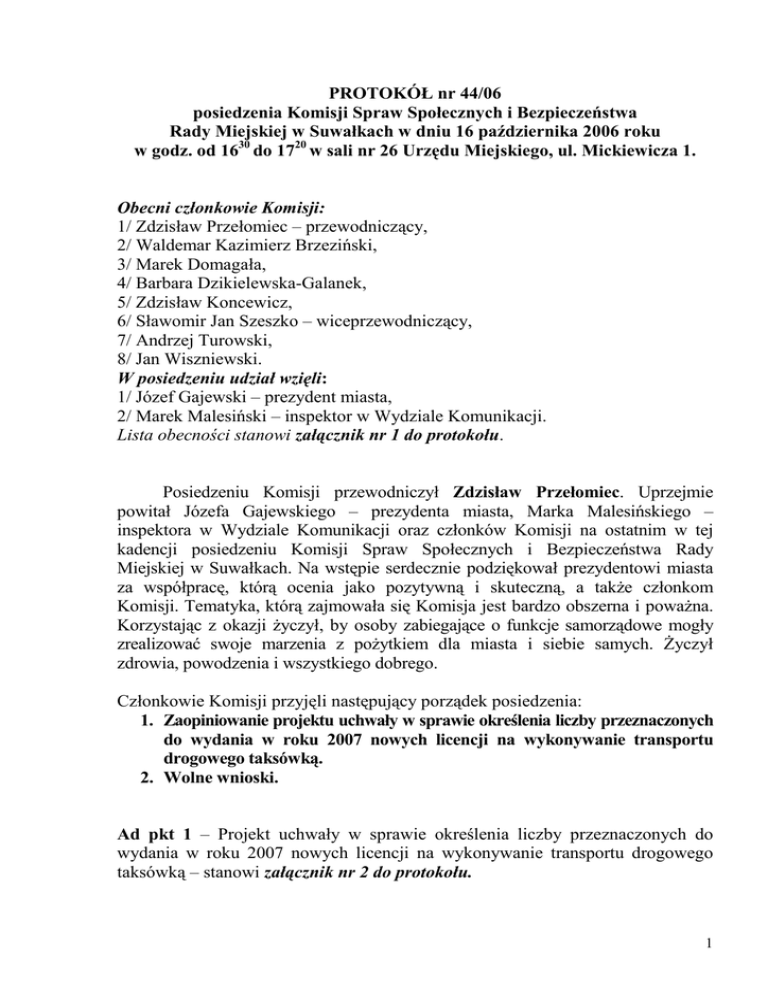 PROTOKÓŁ nr 44/06 posiedzenia Komisji Spraw Społecznych i Bezpieczeństwa Rady Miejskiej w Suwałkach w dniu 16 października 2006 roku w godz. od 1630 do 1720 w sali nr 26 Urzędu Miejskiego, ul. Mickiewicza 1. Obecni członkowie Komisji: 1/ Zdzisław Przełomiec – przewodniczący, 2/ Waldemar Kazimierz Brzeziński, 3/ Marek Domagała, 4/ Barbara Dzikielewska-Galanek, 5/ Zdzisław Koncewicz, 6/ Sławomir Jan Szeszko – wiceprzewodniczący, 7/ Andrzej Turowski, 8/ Jan Wiszniewski. W posiedzeniu udział wzięli: 1/ Józef Gajewski – prezydent miasta, 2/ Marek Malesiński – inspektor w Wydziale Komunikacji. Lista obecności stanowi załącznik nr 1 do protokołu. Posiedzeniu Komisji przewodniczył Zdzisław Przełomiec. Uprzejmie powitał Józefa Gajewskiego – prezydenta miasta, Marka Malesińskiego – inspektora w Wydziale Komunikacji oraz członków Komisji na ostatnim w tej kadencji posiedzeniu Komisji Spraw Społecznych i Bezpieczeństwa Rady Miejskiej w Suwałkach. Na wstępie serdecznie podziękował prezydentowi miasta za współpracę, którą ocenia jako pozytywną i skuteczną, a takŜe członkom Komisji. Tematyka, którą zajmowała się Komisja jest bardzo obszerna i powaŜna. Korzystając z okazji Ŝyczył, by osoby zabiegające o funkcje samorządowe mogły zrealizować swoje marzenia z poŜytkiem dla miasta i siebie samych. śyczył zdrowia, powodzenia i wszystkiego dobrego. Członkowie Komisji przyjęli następujący porządek posiedzenia: 1. Zaopiniowanie projektu uchwały w sprawie określenia liczby przeznaczonych do wydania w roku 2007 nowych licencji na wykonywanie transportu drogowego taksówką. 2. Wolne wnioski. Ad pkt 1 – Projekt uchwały w sprawie określenia liczby przeznaczonych do wydania w roku 2007 nowych licencji na wykonywanie transportu drogowego taksówką – stanowi załącznik nr 2 do protokołu. 1 Józef Gajewski – w związku z tym, iŜ nie ma konieczności i potrzeby zwiększenia liczby licencji na wykonywanie transportu drogowego taksówką, nie proponuje wprowadzenia zmiany ich liczby. Wiadomo, iŜ ogólna ilość licencji nie moŜe przekroczyć 280 sztuk. Na koniec 2005 roku 227 przedsiębiorców posiadało waŜne licencje na wykonywanie transportu drogowego taksówką. Natomiast od początku 2006 r. wydano 23 nowe licencje, z tym wygasło 9 licencji, a 2 licencje zostały cofnięte. W sumie na koniec września br. 239 przedsiębiorców posiada licencje. Uwzględniając dotychczasowy stan i brak uzasadnienia na zwiększenie liczby taksówek w mieście, postanowiono pozostać przy liczbie 280 licencji. Zdzisław Przełomiec zauwaŜył, iŜ w przedstawionym uzasadnieniu mowa jest o wygaśnięciu licencji, jak teŜ o jej cofnięciu – w jakich okolicznościach mogą być cofane licencje? Na początku kadencji doszło do nagannych zachowań kierowców, które echem odbiły się w mieście, gdzie chodziło o przekraczanie prędkości, wymuszanie na przejściach i parkowanie w niedozwolonych miejscach. Czy takie sytuacje mogły wpływać na cofanie licencji? Marek Malesiński wyjaśnił, iŜ tego typu sytuacje, kiedy ktoś przekroczył przepisy ruchu drogowego, nie są podstawą do cofnięcia licencji – potrzebny jest prawomocny wyrok sądu skazujący za przestępstwa przeciwko bezpieczeństwu w komunikacji. Ponadto licencje są cofane, gdy przedsiębiorca nie spełnia warunków do jej posiadania. Przykładem moŜe być sytuacja, gdy przedsiębiorca nie przedstawi dokumentów do kontroli, gdyŜ raz na 5 lat organ wydający licencje ma prawo skontrolować kaŜdego posiadacza licencji odnośnie spełnienia warunków udzielonej licencji. Drugim przykładem jest sytuacja, gdy kierowca został skazany prawomocnym wyrokiem sądu, na podstawie którego cofnięto mu licencję. Natomiast przypadki wygaśnięcia licencji dotyczą sytuacji, gdy przedsiębiorca wyrejestruje swoją działalność, albo ją zawiesi. JeŜeli licencja wygasa nie pociąga za sobą Ŝadnych negatywnych skutków i moŜna ją w kaŜdej chwili przywrócić. W przypadku cofnięcia licencji, moŜna ponownie o nią się starać dopiero po 3 latach. Podkreślił, iŜ Wydział Komunikacji współpracuje z Urzędem Skarbowym, skąd otrzymuje informacje o przedsiębiorcach, którzy zawiesili działalność na okres dłuŜszy niŜ 6 miesięcy. Zdzisław Przełomiec – co się dzieje, jeśli jest ignorancja pracowników korporacji, jeśli jest zawyŜanie cennika lub złe zachowanie kierowców? Kto ma prawo ingerować, jeśli coś jest nie tak? Marek Malesiński odpowiedział, iŜ w roku ubiegłym Rada Miejska uchwaliła przepisy porządkowe związane z przewozem osób i ich bagaŜu taksówkami, gdzie wskazany został organ, do którego moŜna składać zaŜalenia, a mianowicie 2 Wojewódzki Inspektorat Inspekcji Handlowej w Białymstoku, Delegatura w Suwałkach. Ponadto kaŜdy taksówkarz powinien posiadać te przepisy, znać je i okazywać na Ŝyczenie klienta. Barbara Dzikielewska-Galanek zapytała o skutki zaŜalenia? Czy organ kontrolujący ma wpływ na zmianę zachowań? Marek Malesiński stwierdził, iŜ dotychczas nie było Ŝadnych informacji odnośnie złoŜonych zaŜaleń. Gdyby np. okazało się, Ŝe kierowca zawyŜa naleŜności, wówczas licencja zostałaby cofnięta. Jednak zanim do tego dojdzie, musi zostać przeprowadzone odpowiednie postępowanie. Andrzej Turowski – czy wśród kierowców taksówek znajdują się „półetatowcy”? Marek Malesiński – obecnie nie ma juŜ takiego pojęcia jak „półetatowcy”, tylko posiadacz licencji. Osoba ta musi posiadać zarejestrowaną działalność, ukończyć szkolenie, zdać egzamin, nie być karany, mieć badania lekarskie i psychologiczne oraz posiadać odpowiedni samochód. Zdzisław Przełomiec zapytał czy powinny być limity licencji, czy teŜ rynek sam nie powinien regulować tego? MoŜna powiedzieć, iŜ jest to pewna ingerencja w określoną sferę, tak jakby ktoś chciał regulować ilość punktów u