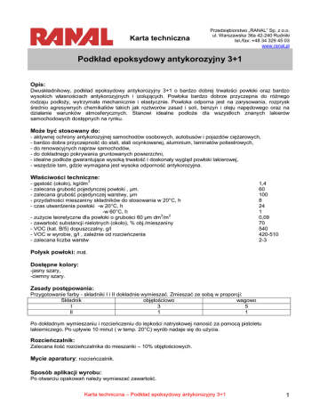 Karta techniczna Przedsiębiorstwo „RANAL” Sp. z o.o. ul. Warszawska 36a 42-240 Rudniki tel./fax: +48 34 329 45 03 www.ranal.pl Podkład epoksydowy antykorozyjny 3+1 Opis: Dwuskładnikowy, podkład epoksydowy antykorozyjny 3+1 o bardzo dobrej trwałości powłoki oraz bardzo wysokich własnościach antykorozyjnych i izolujących. Powłoka bardzo dobrze przyczepna do różnego rodzaju podłoży, wytrzymała mechanicznie i elastycznie. Powłoka odporna jest na zarysowania, rozprysk średnio agresywnych chemikaliów takich jak roztworów zasad i soli, benzyn i oleju napędowego oraz na działanie warunków atmosferycznych. Stanowi idealne podłoże dla wszystkich znanych lakierów samochodowych dostępnych na rynku. Może być stosowany do: - aktywnej ochrony antykorozyjnej samochodów osobowych, autobusów i pojazdów ciężarowych, - bardzo dobra przyczepność do stali, stali ocynkowanej, aluminium, laminatów poliestrowych, - do renowacyjnych napraw samochodów, - do dokładnego pokrywania gruntowanych powierzchni, - idealne podłoże gwarantujące wysoką trwałość i doskonały wygląd powłoki lakierowej, - wszędzie tam, gdzie wymagana jest wysoka odporność antykorozyjna. Właściwości techniczne: - gęstość (około), kg/dm3 - zalecana grubość pojedynczej powłoki , μm. - zalecana grubość pojedynczej warstwy, μm - przydatności mieszaniny składników do stosowania w 20°C, h - czas utwardzenia powłoki -w 20°C, h -w 60°C, h - zużycie teoretyczne dla powłoki o grubości 60 μm dm3/m2 - zawartość substancji nielotnych (około), % obj./mieszaniny - VOC (kat. B/5) dopuszczalny, g/l - VOC w wyrobie, g/l , zależnie od rozcieńczenia - zalecana liczba warstw 1,4 60 100 8 24 1 0,09 70 540 420-510 2-3 Połysk powłoki: mat. Dostępne kolory: -jasny szary, -ciemny szary. Zasady postępowania: Przygotowanie farby - składniki I i II dokładnie wymieszać. Zmieszać ze sobą w proporcji: Składnik objętościowo wagowo I 3 5 II 1 1 Po dokładnym wymieszaniu i rozcieńczeniu do lepkości natryskowej nanosić za pomocą pistoletu lakierniczego. Po upływie 10 minut ( w temp. 20°C) wyrób nadaje się do użycia. Rozcieńczalnik: Zalecana ilość rozcieńczalnika do mieszanki – 10% objętościowych. Mycie aparatury: rozcieńczalnik. Sposób aplikacji wyrobu: Po otwarciu opakowań należy wymieszać zawartość. Karta techniczna – Podkład epoksydowy antykorozyjny 3+1 1 Metoda aplikacji wyrobu: Natrysk bezpowietrzny, pędzel, natrysk powietrzny – po dodaniu 10% - lepkość DINø 4 – 35-40 s: - średnica dyszy 1,6 – 2,2 mm; - ciśnienie natryskowe 3,0 – 4,0 atm; - zalecane nałożenie warstw 2-3; - czas na odparowanie rozcieńczalnika między warstwami 25 min; - możliwość dosuszania podkładu w podwyższonej temperaturze po około 25 min od nałożenia ostatniej warstwy (czas potrzebny na uzyskanie odpowiedniej rozlewności i wstępne odparowanie rozcieńczalników). Sposób stosowania: Podłoże- powierzchnia odtłuszczona, pozbawiona zanieczyszczeń, wolna od oleju, smaru, pyłu, luźno związanej z podłożem starej powłoki malarskiej, zgorzeliny walcowniczej, rdzy i obcych zanieczyszczeń. Powłoka przeszlifowana papierem ściernym 120 – 220, wolna od tłuszczu, kurzu, korozji, sucha. - Powierzchnia stali sucha, pozbawiona obcych zanieczyszczeń, odtłuszczona - oczyszczona do stopnia czystości co najmniej Sa 2 (obróbka strumieniowa) dla powierzchni zewnętrznych. Dla powierzchni zewnętrznych dopuszcza się oczyszczenie do stopnia czystości co najmniej St 3 (czyszczenie ręczne lub z wykorzystaniem narzędzi z napędem mechanicznym wg PN-ISO 12944-4). - Stare powłoki lakierowe odtłuścić i przeszlifować na sucho papierem P220-P360. - Nie sezonowane powierzchnie stali ocynkowanej zanurzeniowo i powierzchnie aluminiowe suche, zmatowione drobnoziarnistą włókniną ścierną. - Powierzchnie ocynkowane powinny być wolne od wszelkich zanieczyszczeń, produktów korozji cynku. Czyszczenie gorącą wodą, wodą pod ciśnieniem, omiatanie ścierniwem lub czyszczenie ręczne z wykorzystaniem narzędzi z napędem mechanicznym. - Powierzchnia przygotowana do malowania powinna być sucha, pozbawiona soli, tłuszczu, kurzu i innych zanieczyszczeń. - Dla uzyskania odpowiedniej ochrony antykorozyjnej całkowita grubość powłoki powinna być wyższa niż 80μm. Warunki w czasie malowania i utwardzania powłoki: - minimalna temperatura podłoża 5°C; - powierzchnia o temperaturze powyżej punktu rosy (uniknięcie kondensacji); - wilgotność względna powietrza najwyżej 85%; - sprawna wentylacja. Warunki przechowywania: 12 miesięcy od daty produkcji w fabrycznie zamkniętym opakowaniu w temp. 5°C - 35°C. oraz 6 miesięcy utwardzacz. Informacja dodatkowa: Zawartość lotnych związków organicznych ( LZO) w wyrobach RANAL zgodna z Rozporządzeniem Ministra Gospodarki z dnia 16 stycznia 2007 r. ( Dz.U. z dnia 24 stycznia 2007 r.) i Dyrektywą UE 2004/42/CE z dnia 21 kwietnia 2004 r. Opakowanie: Art. Nr 80670 Pojemność, l: 0,75+0,25 Opakowanie zbiorcze, szt. 6 Waga kartonu, kg 6,90 UWAGA! Wyrób do profesjonalnego stosowania w przemyśle. Informacje dotyczące bezpieczeństwa stosowania wyrobu zawarte są w Karcie Charakterystyki Preparatu Niebezpiecznego. Podane informacje są oparte na starannych laboratoryjnych badaniach i długoletnim doświadczeniu. Mocna pozycja na rynku nie zwalnia nas ze stałej kontroli jakości naszych wyrobów. Jednak nie odpowiadamy za efekty końcowe przy nieprawidłowym ich użyciu. RANAL Sp. z o.o. Karta techniczna – Podkład epoksydowy antykorozyjny 3+1 2