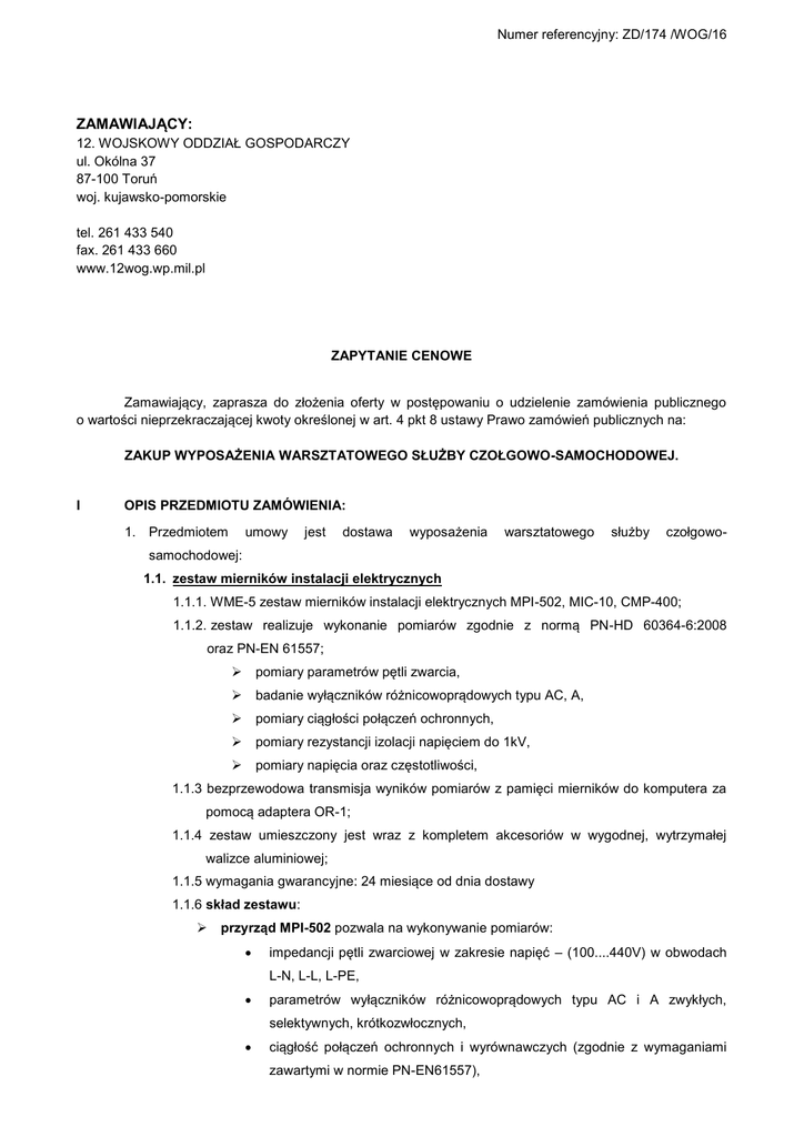Numer referencyjny: ZD/174 /WOG/16 ZAMAWIAJĄCY: 12. WOJSKOWY ODDZIAŁ GOSPODARCZY ul. Okólna 37 87-100 Toruń woj. kujawsko-pomorskie tel. 261 433 540 fax. 261 433 660 www.12wog.wp.mil.pl ZAPYTANIE CENOWE Zamawiający, zaprasza do złożenia oferty w postępowaniu o udzielenie zamówienia publicznego o wartości nieprzekraczającej kwoty określonej w art. 4 pkt 8 ustawy Prawo zamówień publicznych na: ZAKUP WYPOSAŻENIA WARSZTATOWEGO SŁUŻBY CZOŁGOWO-SAMOCHODOWEJ. I OPIS PRZEDMIOTU ZAMÓWIENIA: 1. Przedmiotem umowy jest dostawa wyposażenia warsztatowego służby czołgowo- samochodowej: 1.1. zestaw mierników instalacji elektrycznych 1.1.1. WME-5 zestaw mierników instalacji elektrycznych MPI-502, MIC-10, CMP-400; 1.1.2. zestaw realizuje wykonanie pomiarów zgodnie z normą PN-HD 60364-6:2008 oraz PN-EN 61557; pomiary parametrów pętli zwarcia, badanie wyłączników różnicowoprądowych typu AC, A, pomiary ciągłości połączeń ochronnych, pomiary rezystancji izolacji napięciem do 1kV, pomiary napięcia oraz częstotliwości, 1.1.3 bezprzewodowa transmisja wyników pomiarów z pamięci mierników do komputera za pomocą adaptera OR-1; 1.1.4 zestaw umieszczony jest wraz z kompletem akcesoriów w wygodnej, wytrzymałej walizce aluminiowej; 1.1.5 wymagania gwarancyjne: 24 miesiące od dnia dostawy 1.1.6 skład zestawu: przyrząd MPI-502 pozwala na wykonywanie pomiarów: impedancji pętli zwarciowej w zakresie napięć – (100....440V) w obwodach L-N, L-L, L-PE, parametrów wyłączników różnicowoprądowych typu AC i A zwykłych, selektywnych, krótkozwłocznych, ciągłość połączeń ochronnych i wyrównawczych (zgodnie z wymaganiami zawartymi w normie PN-EN61557), Numer referencyjny: ZD/174 /WOG/16 napięcia i częstotliwości sieci. przyrząd MIC-10 pozwala na wykonywanie pomiarów: pomiar rezystancji izolacji: - napięcie pomiarowe wybierane : 50, 100, 250, 500, 1000 V, - ciągłe wskazanie mierzonej rezystancji izolacji, samoczynne rozładowanie pojemności mierzonego obiektu po zakończeniu pomiaru rezystancji izolacji, - akustyczne wyznaczanie pięciosekundowych odcinków czasu ułatwiające zdjęcie charakterystyk czasowych, - wskazania rzeczywistego napięcia pomiarowego podczas pomiaru, - zabezpieczenie przed pomiarem obiektów pod napięciem, - pomiar trójprzewodowy pomiar ciągłości połączeń ochronnych i wyrównawczych zgodnie z PN-EN 61557-4 prądem >200mA; niskonapięciowy pomiar ciągłości obwodu i rezystancji: -pomiar rezystancji obwodu (<1999) prądem o wartości <15mA, -szybka sygnalizacja akustyczna dla obwodu o rezystancji mniejszej od 30 pomiar pojemności podczas pomiaru RISO; pomiar napięć stałych i przemiennych w zakresie 0....600V możliwość zasilania 4 akumulatorami lub bateriami alkalicznymi AA, napięcie zasilania monitorowane w mierniku; przyrządy spełniają wymagania normy PN-EN 61557 przyrząd CMP-400 pozwala na wykonanie pomiarów: prądu przemiennego do 400A; napięcia stałego i przemiennego do 600V z wykorzystaniem dodatkowych przewodów pomiarowych; rezystancji oraz ciągłości połączeń z sygnalizacją akustyczną; temperatury za pomocą sondy znajdującej się w wyposażeniu miernika. 1.2 Piaskarka kabinowa 990L z ochronnymi rękawicami do piaskowania oraz pistoletem i zestawem dysz do piaskowania 1.2.1. pojemność: 990 L; 1.2.2. zasilanie: kompresor /230V/50Hz; 1.2.3. zapotrzebowanie na powietrze: 6801/min.; 1.2.4. ciśnienie robocze: 4 do 8 bar; 1.2.5. model: kabinowy; 1.2.6. wymiary wewnętrzne kabiny: 1175x885x625-845mm; 1.2.7. wysokość całkowita urządzenia: 1770mm; 1.2.8. zalecana ilość materiału ściernego: 3x25kg; 1.2.9. waga: 175kg; 1.2.10. wymagania gwarancyjne i serwisowe: 24 miesiące od dnia dostawy oraz serwis w miejscu instalacji piaskarki; 1.2.11. w zestawie: rękawice do piaskowania z naturalnej gumy; regulator ciśnienie z manometrem; Numer referencyjny: ZD/174 /WOG/16 wewnętrzna oświetlenie niskonapięciowe; zamienne tarcze ochronne na wziernik; przemysłowy pistolet piaskujący z kompletem dysz do piaskowania. 1.3. Prasa warsztatowa hydrauliczno-pneumatyczna WP 45H: 1.3.1. średnica stempla dociskowego: 58mm; 1.3.2. przejście między stojakami: 800mm; 1.3.3. obszar roboczy: 0-750mm; 1.3.4. siła nacisku: 45 ton; 1.3.5. wymiary maszyny: 1400x1710mm; 1.3.6. waga netto: 310kg; 1.3.7. waga podczas wysyłki ok.: 368kg; 1.3.8. wymiary paczki: 500x1800x1080mm; 1.3.9. automatyczny powrót tłoka; 1.3.10. ręczna lub pneumatyczna regulacja nacisku prasy; 1.3.11. regulacja wysokości stołu; 1.3.12. wymagania gwarancyjne i w zakresie serwisowania: 12 miesięcy od dnia zakupu towaru oraz serwis w miejscu instalacji prasy. 2. Zamawiający nie dopuszcza składania ofert częściowych. 3. Wymagany produkt jest nowy, nieużywany, nieregenerowany, wyprodukowany nie wcześniej niż w IV kwartale 2015 lub 2016 roku oraz wolny od wad prawnych i fizycznych oraz roszczeń osób trzecich. 4. Wraz z urządzeniami Wykonawca dostarczy deklaracje zgodności z normami oraz instrukcje w języku polskim. 5. Świadczona dostawa odbędzie się na koszt i odpowiedzialność Wykonawcy. 6. Termin gwarancji zgodnie z opisem przedmiotu zamówienia od momentu dostawy. Gwarancja obejmuje również przedmioty umowy lub usługi nabyte u kooperantów przez Wykonawcę. 7. Wykonawca odpowiada za wady prawne i fizyczne ujawnione w dostarczonym wyrobie i ponosi z tego tytułu wszelkie zobowiązania. 8. Wykonawca jest zobowiązany do usunięcia wad fizycznych wyrobów lub dostarczenia wyrobów wolnych od wad, jeżeli wady te ujawnią się w ciągu okresu gwarancji, w ciągu 14 dni od chwili złożenia reklamacji. 9. Wykonawca usunie wady w dostarczonych wyrobach w miejscu, w którym zostały one ujawnione lub na własny koszt dostarczy je do swojej siedziby w celu ich usprawnienia. 10. Wyroby wolne od wad wykonawca dostarczy na własny koszt do miejsca, w którym wady te zostały ujawnione w terminie do 14 dni od chwili złożenia 