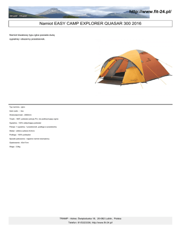 http://www.fit-24.pl/ Namiot EASY CAMP EXPLORER QUASAR 300 2016 Namiot biwakowy typu igloo posiada dużą sypialnię i obszerny przedsionek. Typ namiotu - igloo Ilość osób- 3os Wodoodporność - 2000mm Tropik - 180T, poliester pokryty PU, nie podtrzymujący ognia Sypialnia - 100% oddychający poliester Pokoje -1 sypialnia, 1 przedsionek ,podłoga w przedsionku Stelaż - włókno szklane 8,5mm Podłoga - 100% polietylen Sposób pakowania - najpierw namiot wewnętrzny Opakowanie - 63x17cm Waga - 3,9kg TRAMP - Adres: Świętoduska 18, 20-082 Lublin, Polska Telefon: 81/5323336, http://www.fit-24.pl/ http://www.fit-24.pl/ TRAMP - Adres: Świętoduska 18, 20-082 Lublin, Polska Telefon: 81/5323336, http://www.fit-24.pl/