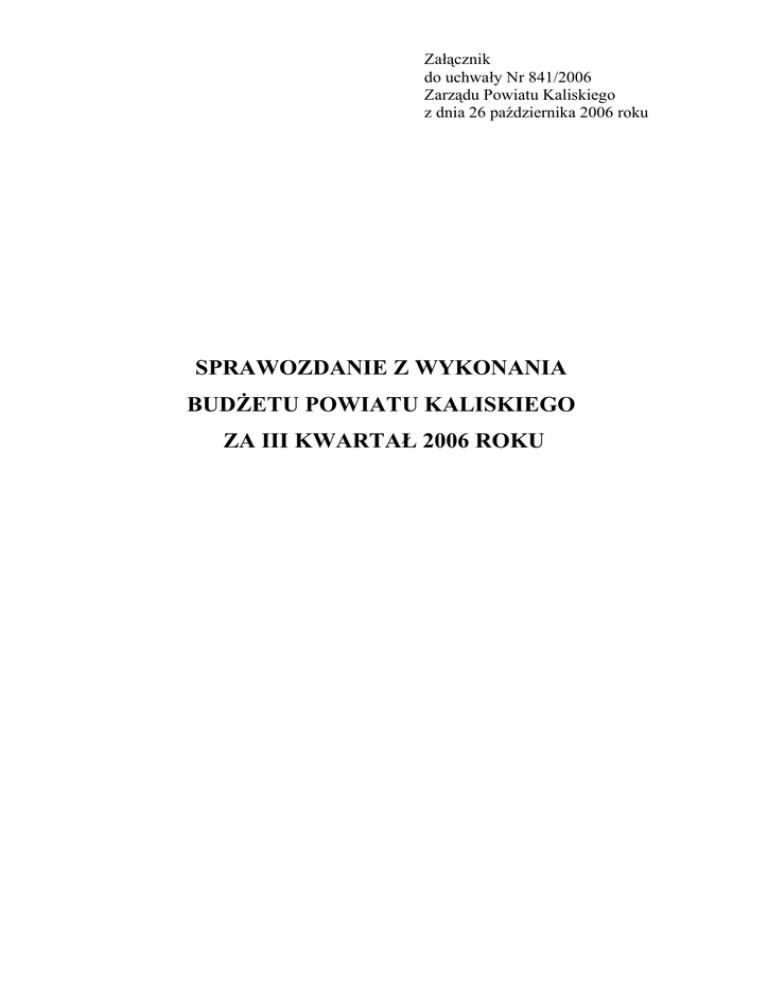 Załącznik do uchwały Nr 841/2006 Zarządu Powiatu Kaliskiego z dnia 26 października 2006 roku SPRAWOZDANIE Z WYKONANIA BUDŻETU POWIATU KALISKIEGO ZA III KWARTAŁ 2006 ROKU Zgodnie z art. 14 ustawy z dnia 30 czerwca 2005 r. o finansach publicznych (Dz. U. Nr 249, poz. 2104 z późn. zm.) Zarząd Powiatu Kaliskiego podaje do publicznej wiadomości informację o wykonaniu budżetu Powiatu Kaliskiego za III kwartał 2006 rok w terminie do 31 października 2006 roku. Budżet Powiatu Kaliskiego na 2006 rok został przyjęty uchwałą Nr XXV/293/2005 Rady Powiatu Kaliskiego z dnia 21 grudnia 2005 roku w wysokości: - dochody – 22.214.731 zł, - wydatki – 22.292.731 zł, - deficyt – 78.000 zł, - przychody – 1.500.000 zł, - rozchody – 1.422.000 zł. Po zmianach uchwałami Rady Powiatu Kaliskiego i Zarządu Powiatu Kaliskiego plan budżetu Powiatu Kaliskiego został zwiększony: - po stronie dochodów o kwotę 1.643.152 zł do kwoty 23.857.883 zł, - po stronie wydatków o kwotę 3.555.815 zł do kwoty 25.848.546 zł, - deficyt o kwotę 1.912.663 zł do kwoty 1.990.663 zł, - przychody o kwotę 1.912.655 zł do kwoty 3.412.655 zł. Wykonanie budżetu Powiatu Kaliskiego w III kwartale 2006 roku (zł) wynosiło: Wyszczególnienie Lp. 1. 2. Dochody Powiatu Kaliskiego Wydatki Powiatu Kaliskiego 2.1. Wydatki inwestycyjne Powiatu Kaliskiego 3. 4. 5. 6. Deficyt Nadwyżka Przychody Rozchody Plan (zł) Wykonanie (zł) % 23.857.883 18.632.238,72 78,10 25.848.546 16.220.313,81 62,75 2.482.091 177.128,54 7,14 1.990.663 - - - 2.411.924,91 - 3.412.655 1.572.656,27 46,08 1.421.992 968.994,00 68,14 2 1. DOCHODY POWIATU KALISKIEGO W III kwartale 2006 roku plan dochodów został zwiększony o kwotę 318.826 zł do kwoty 23.857.883 zł m.in. z subwencji budżetu państwa, dotacji celowych z budżetu państwa i jednostek samorządu terytorialnego, środków pomocy finansowej i dochodów własnych. Źródła pochodzenia dochodów ukazuje Tabela 1. i Wykres 1. Tabela 1. Wykonanie dochodów Powiatu Kaliskiego w III kwartale 2006 roku (zł) Wyszczególnienie Kwoty (zł) Subwencje z budżetu państwa Udziały powiatu we wpływach z podatków Dotacje celowe z budżetu państwa Dotacje celowe i pomoc finansowa od jednostek samorządu terytorialnego Środki na realizację zadań współfinansowanych z Unii Europejskiej w tym: środki z Unii Europejskiej, z budżetu państwa Środki otrzymane z innych źródeł, w tym: ARiMR, WORD Dochody własne DOCHODY OGÓŁEM Udział (%) 9.625.668,00 3.386.101,80 1.307.311,00 51,66 516.824,40 2,77 443.206,92 2,38 289.509,95 3.063.616,65 18.632.238,72 1,56 18,17 7,02 16,44 100,00 Wykres 1. Struktura dochodów Powiatu Kaliskiego w III kwartale 2006 roku w % 18,17% 7,02% 2,77% 2,38% 1,56% 16,44% 51,66% Subwencje z budżetu państwa Udziały powiatu we wpły wach z podatków Dotacje celowe z budżetu państwa Dotacje celowe i pomoc f inansowa od jednostek samorządu tery torialnego Środki na realizację zadań współf inansowany ch z Unii Europejskiej w ty m: środki z Unii Europejskiej, z budżetu państwa Środki otrzy mane z inny ch źródeł, w ty m: ARiMR, WORD Dochody własne 3 2. WYDATKI POWIATU KALISKIEGO Planowane wydatki budżetu Powiatu Kaliskiego w III kwartale 2006 rok po zmianach w wysokości 25.848.546 zł wykonano w kwocie 16.220.313,81 zł, tj. 62,75 % założonego planu – co obrazuje Tabela 2. i Wykres 2. Tabela 2. Wykonanie wydatków Powiatu Kaliskiego w III kwartale 2006 roku (zł) - struktura (%) Wyszczególnienie Rolnictwo i łowiectwo Leśnictwo Transport i łączność Turystyka Gospodarka mieszkaniowa Działalność usługowa Administracja publiczna Bezpieczeństwo publiczne Obsługa długu Oświata Ochrona zdrowia Pomoc społeczna Kultura i sport OGÓŁEM WYDATKI Kwoty (zł) Udział w (%) 0,00 265.682,52 1.968.056,59 19.474,52 36.760,79 184.046,07 4.716.753,91 3.185,16 118.078,60 5.219.971,95 18.543,00 3.116.633,32 553.127,38 16.220.313,81 0,00 1,64 12,13 0,12 0,23 1,13 29,08 0,02 0,73 32,18 0,11 19,21 3,41 100,00 Wykres 2.Struktura wydatków Powiatu Kaliskiego w III kwartale 2006 roku 0,73% 1,64% 12,13% 0,12% 3,41% 19,21% 0,23% 0,11% 1,13% 29,08% 32,18% 0,02% Leśnictw o Kultura i sport Administracja publiczna Ochrona zdrow ia Transport i łączność Gospodarka mieszkaniow a Bezpieczeństw o publiczne Pomoc społeczna Turystyka Działalność usługow a Ośw iata Obsługa długu 4 2.1 . WYDATKI INWESTYCYJNE Planowane wydatki inwestycyjne w wysokości 2.482.091 zł zostały wykonane w kwocie 177.128,54 zł, tj. 7,14 % planu. Strukturę wydatków majątkowych ukazuje Tabela 3. Tabela 3. Wydatki inwestycyjne w III kwartale 2006 roku : Wyszczególnienie Transport i łączność Administracja publiczna Oświata OGÓŁEM WYDATKI Plan (zł) 1 820 898 113 862 547 331 2.482.091 Wykonanie (zł) 79.897,38 93.926,16 3.305,00 177.128,54 3. DEFICYT I WOLNE ŚRODKI W budżecie Powiatu Kaliskiego na 2006 rok planowano deficyt budżetowy w wysokości 1.990.663 zł, natomiast w III kwartale 2006 roku osiągnięto nadwyżkę budżetową w kwocie 2.411.924,91 zł. W rozliczeniu finansowym na koniec III kwartału na rachunku bankowym budżetu Powiatu Kaliskiego pozostała kwota 3.015.587,18 zł wolnych środków. 4. ZOBOWIĄZANIA POWIATU KALISKIEGO W 2006 ROK Na koniec III kwartału 2006 roku w budżecie Powiatu wystąpiły zobowiązania długoterminowe z tytułu zaciągniętych kredytów bankowych na inwestycje i remonty na drogach w ogólnej kwocie 2.825.008,00 zł. W budżecie Powiatu Kaliskiego nie wystąpiły zobowiązania wymagalne. 5