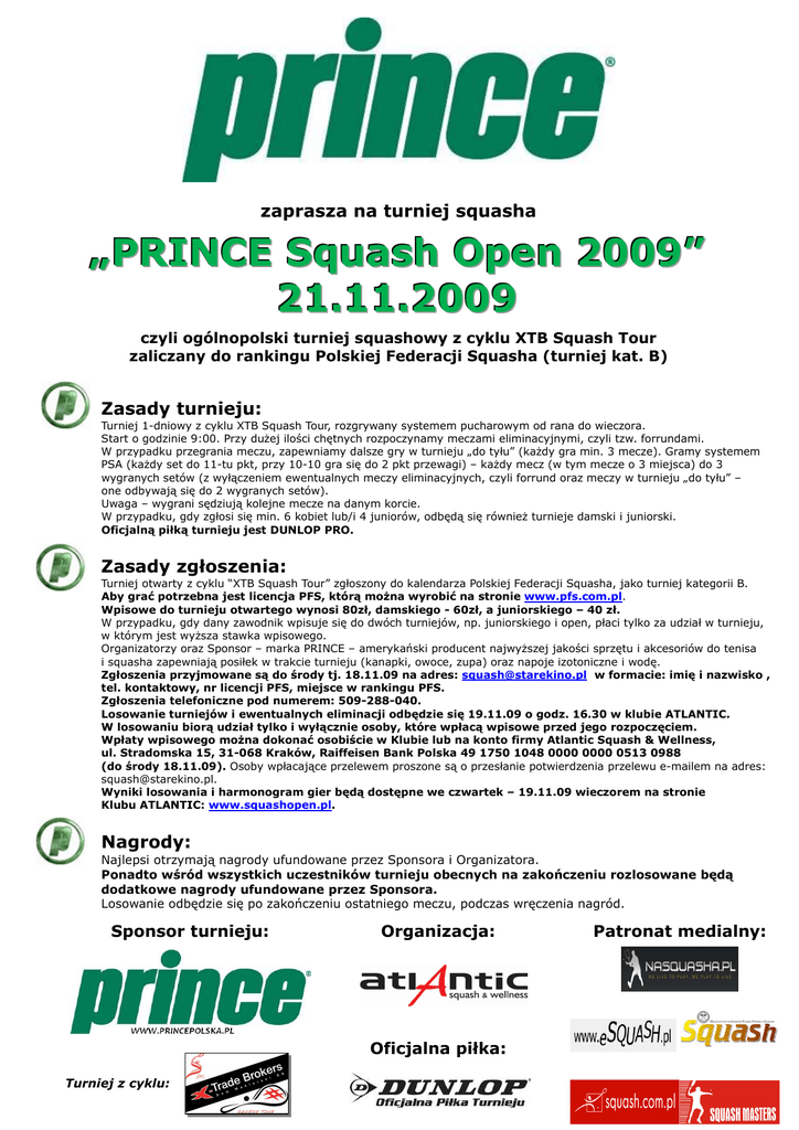 zaprasza na turniej squasha „PRINCE Squash Open 2009” 21.11.2009 czyli ogólnopolski turniej squashowy z cyklu XTB Squash Tour zaliczany do rankingu Polskiej Federacji Squasha (turniej kat. B) Zasady turnieju: Turniej 1-dniowy z cyklu XTB Squash Tour, rozgrywany systemem pucharowym od rana do wieczora. Start o godzinie 9:00. Przy duŜej ilości chętnych rozpoczynamy meczami eliminacyjnymi, czyli tzw. forrundami. W przypadku przegrania meczu, zapewniamy dalsze gry w turnieju „do tyłu” (kaŜdy gra min. 3 mecze). Gramy systemem PSA (kaŜdy set do 11-tu pkt, przy 10-10 gra się do 2 pkt przewagi) – kaŜdy mecz (w tym mecze o 3 miejsca) do 3 wygranych setów (z wyłączeniem ewentualnych meczy eliminacyjnych, czyli forrund oraz meczy w turnieju „do tyłu” – one odbywają się do 2 wygranych setów). Uwaga – wygrani sędziują kolejne mecze na danym korcie. W przypadku, gdy zgłosi się min. 6 kobiet lub/i 4 juniorów, odbędą się równieŜ turnieje damski i juniorski. Oficjalną piłką turnieju jest DUNLOP PRO. Zasady zgłoszenia: Turniej otwarty z cyklu “XTB Squash Tour” zgłoszony do kalendarza Polskiej Federacji Squasha, jako turniej kategorii B. Aby grać potrzebna jest licencja PFS, którą moŜna wyrobić na stronie www.pfs.com.pl. Wpisowe do turnieju otwartego wynosi 80zł, damskiego - 60zł, a juniorskiego – 40 zł. W przypadku, gdy dany zawodnik wpisuje się do dwóch turniejów, np. juniorskiego i open, płaci tylko za udział w turnieju, w którym jest wyŜsza stawka wpisowego. Organizatorzy oraz Sponsor – marka PRINCE – amerykański producent najwyŜszej jakości sprzętu i akcesoriów do tenisa i squasha zapewniają posiłek w trakcie turnieju (kanapki, owoce, zupa) oraz napoje izotoniczne i wodę. Zgłoszenia przyjmowane są do środy tj. 18.11.09 na adres: [email protected] w formacie: imię i nazwisko , tel. kontaktowy, nr licencji PFS, miejsce w rankingu PFS. Zgłoszenia telefoniczne pod numerem: 509-288-040. Losowanie turniejów i ewentualnych eliminacji odbędzie się 19.11.09 o godz. 16.30 w klubie ATLANTIC. W losowaniu biorą udział tylko i wyłącznie osoby, które wpłacą wpisowe przed jego rozpoczęciem. Wpłaty wpisowego moŜna dokonać osobiście w Klubie lub na konto firmy Atlantic Squash & Wellness, ul. Stradomska 15, 31-068 Kraków, Raiffeisen Bank Polska 49 1750 1048 0000 0000 0513 0988 (do środy 18.11.09). Osoby wpłacające przelewem proszone są o przesłanie potwierdzenia przelewu e-mailem na adres: [email protected]. Wyniki losowania i harmonogram gier będą dostępne we czwartek – 19.11.09 wieczorem na stronie Klubu ATLANTIC: www.squashopen.pl. Nagrody: Najlepsi otrzymają nagrody ufundowane przez Sponsora i Organizatora. Ponadto wśród wszystkich uczestników turnieju obecnych na zakończeniu rozlosowane będą dodatkowe nagrody ufundowane przez Sponsora. Losowanie odbędzie się po zakończeniu ostatniego meczu, podczas wręczenia nagród. Sponsor turnieju: Organizacja: Patronat medialny: Turniej z cyklu: Turniej z cyklu: MAGAZYN POD PATRONATEM POLSKIEJ FEDERACJI SQUASHA : Oficjalna piłka: Turniej z cyklu: