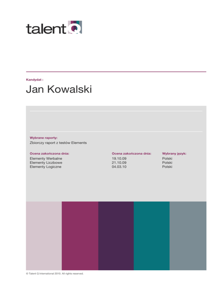 Kandydat : Jan Kowalski Wybrane raporty: Zbiorczy raport z testów Elements Ocena zakończona dnia: Ocena zakończona dnia: Wybrany język: Elementy Werbalne Elementy Liczbowe Elementy Logiczne 19.10.09 21.10.09 04.03.10 Polski Polski Polski © Talent Q International 2010. All rights reserved. Strona 2 / 5 Raport Elements Przeprowadzono następujące testy Elements: werbalny, numeryczny i logiczny. Wszystkie testy mają charakter dynamiczny (adaptacyjny). Testy dynamiczne (adaptacyjne) same dostosowują się do udzielanych odpowiedzi. Jeżeli ktoś udziela poprawnej odpowiedzi, system przechodzi do pytań trudniejszych, a za każdym razem, gdy udziela niepoprawnej odpowiedzi (lub nie udziela odpowiedzi w określonym limicie czasowym) system przechodzi do pytań nieco prostszych. W ten sposób test może sam dostosować się do poziomu zdolności odpowiadającego i go właściwie określić. Tym samym, odpowiadający nie traci czasu na odpowiadanie na pytania zbyt proste lub zbyt trudne. Testy dynamiczne pozwalają szybciej określić prawdopodobny poziom zdolności odpowiadającego niż testy tradycyjne, w których każdy odpowiada na te same pytania. Testy posiadają wbudowaną funkcjonalność randomizacji. W związku z tym istnieje bardzo małe prawdopodobieństwo by dwie osoby, nawet przy takim samym poziomie zdolności, miały odpowiadać na dokładnie takie same pytania. Taki zabieg zabezpiecza test w sytuacjach, kiedy osoby badane rozwiązywać go będą w domu lub bez bezpośredniego nadzoru. Każda osoba otrzymuje właściwie dobrany i odmienny zestaw pytań, ich liczba jest jednak stała. Test werbalny zawiera 15 pytań, a numeryczny 12 pytań; 3 pytania do każdego z 5 fragmentów tekstu w teście werbalnym oraz 3 pytania do każdej z 4 tabel (lub zbiorów tabel) w teście numerycznym. Test logiczny zawiera również 12 zrandomizowanych pytań. Grupa porównawcza Otrzymany wynik porównano z próbką wyników z bazy danych osób, które wcześniej rozwiązały test (lub testy). Grupę porównawczą stanowili absolwenci, specjaliści i managerowie. Jan Kowalski 18/11/2010 13:16 © Talent Q International 2010. All rights reserved. 1 Strona 3 / 5 1 Raport Elements 5 10 15 20 25 30 35 40 45 50 55 60 65 70 75 80 Elementy Werbalne Elementy Liczbowe 85 90 95 99 90 35 Elementy Logiczne 80 Grupa porównawcza : Professional, Graduate and Managerial Elementy Werbalne Uwzględniając liczbę prawidłowo udzielonych odpowiedzi w określonym limicie czasowym oraz poziom ich trudności, przyjęty zgodnie z metodą adaptacyjną samego testu, uzyskane wyniki, w porównaniu z właściwą grupą referencyjną wskazaną powyżej, pokazują, że: zdolność rozumowania werbalnego jest lepsza niż 90% wyniku grupy porównawczej Czas rozwiązywania 14 minut i 55 sekund średnio tyle samo co inni Elementy Liczbowe Uwzględniając liczbę prawidłowo udzielonych odpowiedzi w określonym limicie czasowym oraz poziom ich trudności, przyjęty zgodnie z metodą adaptacyjną samego testu, uzyskane wyniki, w porównaniu z właściwą grupą referencyjną wskazaną powyżej, pokazują, że: zdolność rozumowania numerycznego jest lepsza niż 35% wyniku grupy porównawczej Czas rozwiązywania 12 minut i 28 sekund średnio tyle samo co inni Elementy Logiczne Uwzględniając liczbę prawidłowo udzielonych odpowiedzi w określonym limicie czasowym oraz poziom ich trudności, przyjęty zgodnie z metodą adaptacyjną samego testu, uzyskane wyniki, w porównaniu z właściwą grupą referencyjną wskazaną powyżej, pokazują, że: zdolność rozumowania logicznego jest lepsza niż 80% wyniku grupy porównawczej Czas rozwiązywania 11 minut i 48 sekund dłużej niż większość osób Weryfikacja Do celów weryfikacji wyników udostępniono krótsze wersje już wypełnionych testów. Każdy z nich zawiera 6 pytań. Maksymalny przewidziany czas wynosi po 6 minut dla testów werbalnego i logicznego oraz 8 minut dla testu numerycznego. Testy weryfikacyjne rozwiązuje się pod nadzorem. W ten sposób jesteśmy pewni, kto rzeczywiście go wypełnia. Moduły weryfikacyjne są adaptacyjne tak samo jak pełna wersja testu. Zaczynają się na odpowiednim poziomie trudności, uwzględniającym omawiany powyżej wynik testu rozwiązywanego bez nadzoru. Jeżeli wynik osiągnięty w testach weryfikacyjnych jest istotnie niższy od wyniku testów rozwiązywanych bez nadzoru, otrzymasz stosowne ostrzeżenie. Celem tego zabiegu jest zabezpieczenie się przed sytuacją, w której osoba rozwiązująca test w warunkach braku nadzoru poprosi kogoś o ich rozwiązanie lub skorzysta z niedozwolonej pomocy. Jan Kowalski 18/11/2010 13:16 © Talent Q International 2010. All rights reserved. Strona 4 / 5 Raport Elements 1 Weryfikacja testu numerycznego Test weryfikacyjny testu numerycznego (jak wskazany powyżej) został wypełniony. Wnioski z weryfikacji Liczba udzielonych poprawnie odpowiedzi i wybrany adaptacyjnie przez system poziom trudności pytań wskazują ten sam poziom zdolności co wskazany w pierwszym teście. Test weryfikacyjny potwierdza pierwotny wynik. Jan Kowalski 18/11/2010 13:16 © Talent Q International 2010. All rights reserved. Strona 5 / 5 Oświadczenie Raport został wygenerowany przez system komputerowy. Spółka Talent Q International, jej oddziały oraz przedstawicielstwa nie mogą zapewnić, że nie podlegał on modyfikacjom. Spółka Talent Q International, jej oddziały oraz przedstawicielstwa nie ponoszą odpowiedzialności za jakiekolwiek skutki powstałe w związku z wykorzystaniem raportu. Wykorzystanie Elements Verbal/Numerical tests jest dozwolone tylko osobom upoważnionym przez Spółkę Talent Q International, jej oddziały i przedstawicielstwa. Informacje zawarte w niniejszym raporcie uznaje się za poufne, w związku z czym raport powinien być przechowywany w warunkach zapewniających jego bezpieczeństwo oraz zgodność z najlepszymi praktykami w obszarze ochrony danych osobowych. W standardowyc