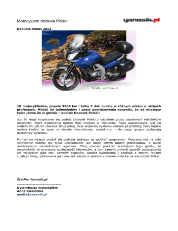 Motocyklem dookoła Polski! Dookoła Polski 2012 10 motocyklistów, prawie 3500 km i tylko 7 dni. Ludzie w różnym wieku, o różnych profesjach. Miłość do jednośladów i pasja podróżowania sprawiły, że od miesięcy tylko jedno im w głowie – podróż Dookoła Polski! Już 26 maja rozpocznie się podróż Dookoła Polski z udziałem grupy zapalonych miłośników motocykli. Start wydarzenia będzie miał miejsce w Poznaniu. Trasa zaplanowana jest na siedem dni (do 02 czerwca 2012 roku). Przy wsparciu systemu Yanosik.pl przebieg trasy będzie można śledzić na żywo na stronie internetowej motokm.pl – do czego gorąco zachęcają uczestnicy wyprawy. Pomysł na wyjazd zrodził się podczas jednego ze spotkań grupowych. Wyprawa ma na celu sprawienie radości nie tylko uczestnikom, ale także innym fanom jednośladów, a także mieszkańcom odwiedzanych regionów. Chcą również pokazać sceptykom tego sportu, że motocykliści to przyjazna społeczność kierowców, a tym samym zmienić sposób postrzegania ich wyłącznie jako tzw. dawców organów. Oprócz zwiedzania i spotkań z innymi fanami z całego kraju, planowana jest również wizyta w jednym z domów dziecka na wschodzie Polski. Źródło: Yanosik.pl ------------------------------Dystrybucja materiałów: Anna Ciesielska [email protected]