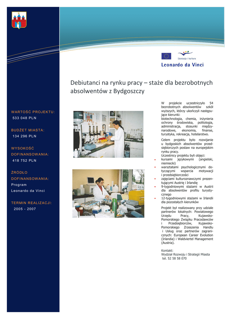 Rozwiązania informatyczne Debiutanci na rynku pracy – staże dla bezrobotnych absolwentów z Bydgoszczy W A R TO Ś Ć P R O J E K T U : 533 048 PLN B U D Ż E T MI A S TA : 134 296 PLN W YS O K O Ś Ć D O F I N A N S OW A N I A : 418 752 PLN ŹRÓDŁO D O F I N A N S OW A N I A : Program Leonardo da Vinci T E R MI N R E A L I Z A C J I : 2005 - 2007 W projekcie uczestniczyło 54 bezrobotnych absolwentów szkół wyższych, którzy ukończyli następujące kierunki: biotechnologia, chemia, inżynieria ochrony środowiska, politologia, administracja, stosunki międzynarodowe, ekonomia, finanse, turystyka, rekreacja, hotelarstwo. Celem projektu było rozwijanie u bydgoskich absolwentów przedsiębiorczych postaw na europejskim rynku pracy. Uczestnicy projektu byli objęci: kursami językowymi (angielski, niemiecki) warsztatami psychologicznymi dotyczącymi wsparcia motywacji i przedsiębiorczości zajęciami kulturoznawczymi prezentującymi Austrię i Irlandię 9-tygodniowymi stażami w Austrii dla absolwentów profilu turystycznego 12-tygodniowymi stażami w Irlandii dla pozostałych kierunków Projekt był realizowany przy udziale partnerów lokalnych: Powiatowego Urzędu Pracy, KujawskoPomorskiego Związku Pracodawców i Przedsiębiorców, KujawskoPomorskiego Zrzeszenia Handlu i Usług oraz partnerów zagranicznych: European Career Evolution (Irlandia) i Waldviertel Management (Austria). Kontakt: Wydział Rozwoju i Strategii Miasta tel. 52 58 58 070