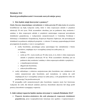 Działanie 10.4 Rozwój przedsiębiorczości i tworzenie nowych miejsc pracy 1. Kto będzie mógł skorzystać z pomocy? Osoby fizyczne nieposiadające zatrudnienia w wieku powyżej 29 roku życia (do projektu kwalifikować się będą wyłącznie osoby, które w dniu rozpoczęcia udziału w projekcie ukończyły 30 rok życia. Wiek uczestników określany jest na podstawie daty urodzenia i ustalany w dniu rozpoczęcia udziału w projekcie) zamierzające rozpocząć prowadzenie działalności gospodarczej, z wyłączeniem zarejestrowanych w Centralnej Ewidencji i Informacji o Działalności Gospodarczej, Krajowym Rejestrze Sądowym, lub prowadzących działalność na podstawie odrębnych przepisów w okresie 12 miesięcy poprzedzających dzień przystąpienia do projektu, w tym w szczególności: osoby bezrobotne, poszukujące pracy (pozostające bez zatrudnienia) i bierne zawodowo, znajdujące się w szczególnej sytuacji na rynku pracy, tj.: o kobiety, o osoby po 50 r. życia (osoby po 50 roku życia, to te, które w dniu rozpoczęcia udziału w projekcie ukończyły 50 lat. Wiek uczestników określany jest na podstawie daty urodzenia i ustalany w dniu rozpoczęcia udziału w projekcie), o z niepełnosprawnościami, o długotrwale bezrobotne, o niskowykwalifikowane, osoby odchodzące z rolnictwa zarejestrowane jako bezrobotne oraz członkowie ich rodzin zarejestrowani jako bezrobotni, pod warunkiem, że należą do osób znajdujących się w szczególnej sytuacji na rynku pracy, a ich gospodarstwa rolne nie przekraczają 2 ha przeliczeniowych. W przypadku osób zarejestrowanych jako bezrobotne wsparcie może być kierowane wyłącznie do osób, dla których ustalono pierwszy (bezrobotni aktywni) lub drugi profil pomocy (bezrobotni wymagający wsparcia). 2. Jaki rodzaj wsparcia będzie można otrzymać w ramach Działania 10.4? Wsparcie doradczo-szkoleniowe dla osób planujących rozpoczęcie działalności gospodarczej, przez wyspecjalizowane instytucje oraz zgodnie z wypracowanymi i obowiązującymi standardami świadczenia usług (wsparcie doradczo – szkoleniowe stanowić będzie uzupełnienie dla typu operacji 2. i nie będzie mogło być realizowane samodzielnie). Wsparcie na rozpoczęcie działalności gospodarczej w formie bezzwrotnej tj. dotacje wraz ze wsparciem pomostowym dla osób bezrobotnych, poszukujących pracy (pozostających bez zatrudnienia) i nieaktywnych zawodowo, znajdujących się w szczególnej sytuacji na rynku pracy (w przypadku projektów realizowanych przez MUP/PUP kwota dotacji może wynieść maksymalnie do 6-krotności wysokości przeciętnego wynagrodzenia w rozumieniu art. 2, ust. 1, pkt. 28 ustawy z dnia 20 kwietnia 2004 r. o promocji zatrudnienia i instytucjach rynku pracy (Dz. U. z 2015 r., poz. 149, z późn. zm.), a zasady jej udzielania są zgodne z zapisami ustawy o promocji zatrudnienia i instytucjach rynku pracy oraz odpowiednimi aktami wykonawczymi. W przypadku projektów realizowanych przez podmioty inne niż MUP/PUP kwota dotacji może wynieść maksymalnie do 6-krotności przeciętnego wynagrodzenia za pracę w gospodarce narodowej obowiązującego w dniu przyznania wsparcia. Wsparcie pomostowe udzielane jest w okresie od 6 do 12 miesięcy od dnia zawarcia umowy o udzielenie wsparcia pomostowego maksymalnie do wysokości minimalnego wynagrodzenia, o którym mowa w przepisach o minimalnym wynagrodzeniu za pracę. Działalność gospodarcza rozpoczęta w ramach projektu musi być prowadzona przez okres co najmniej 12 miesięcy od dnia faktycznego rozpoczęcia działalności gospodarczej zgodnie z aktualnym wpisem do CEIDG lub KRS). 3. Kiedy rozpoczną się projekty? Realizacja projektów w ramach działania 10.4 rozpoczną się nie wcześniej, niż po rozstrzygnięciu konkursów i podpisaniu umów z realizatorami. O szczegółowych terminach Wojewódzki Urząd Pracy będzie informować na bieżąco. 4. Kto realizuje projekty oraz gdzie szukać informacji o projektach? Realizatorami projektów będą podmioty spełniające kryteria określone w dokumentacji konkursowej i wyłonione przez Wojewódzki Urząd Pracy w drodze konkursu. Pełna lista realizatorów wraz ze szczegółowymi terminami naboru uczestników i rodzajami oferowanego wsparcia będzie zamieszczona w zakładce „Chce skorzystać ze wsparcia” oraz dostępna w Głównym Punkcie Informacyjnym Funduszy Europejskich.