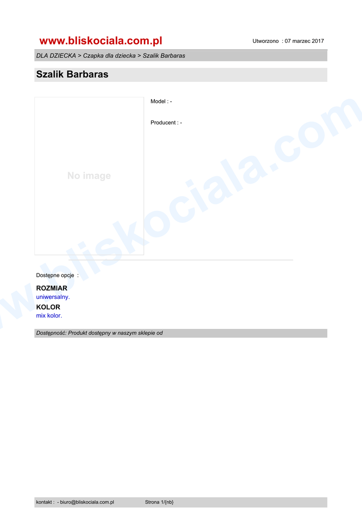 www.bliskociala.com.pl Utworzono : 07 marzec 2017 DLA DZIECKA > Czapka dla dziecka > Szalik Barbaras Szalik Barbaras m o c . a l a Model : - Producent : - No image i c o k il s w b . w Dostępne opcje : ROZMIAR uniwersalny. KOLOR mix kolor. Dostępność: Produkt dostępny w naszym sklepie od kontakt : - [email protected] Strona 1/{nb}