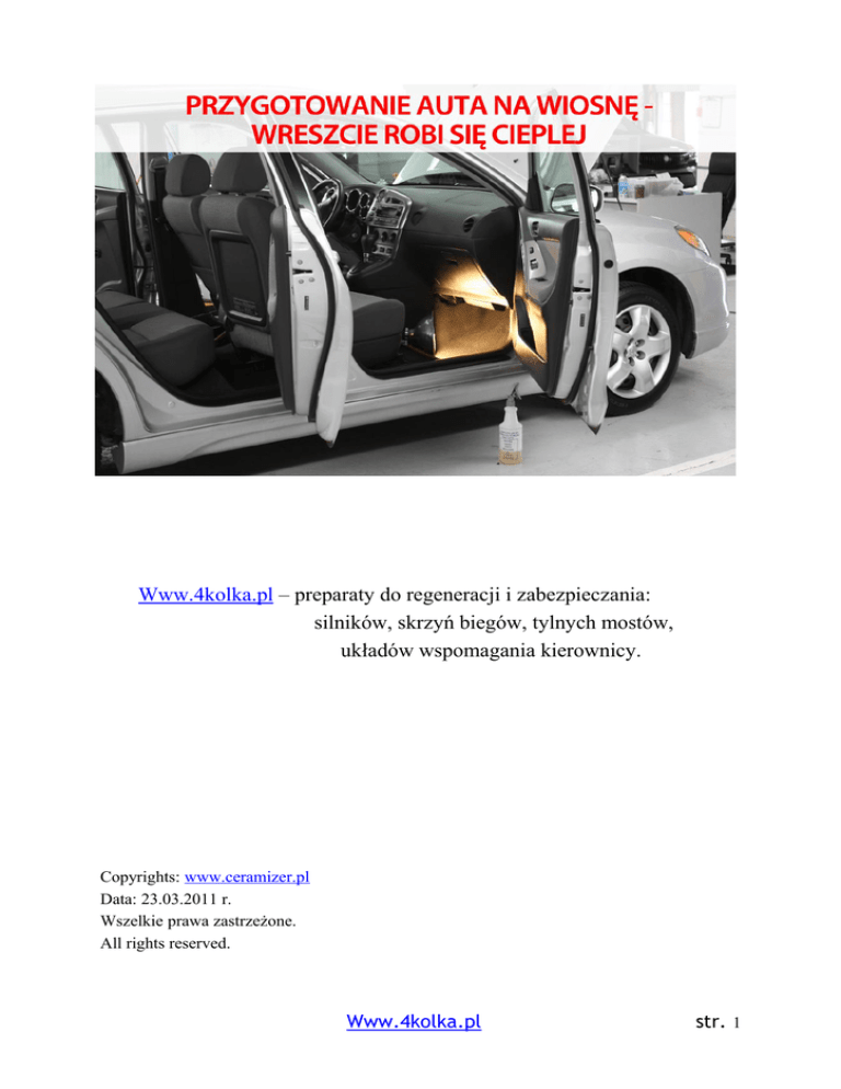 Www.4kolka.pl – preparaty do regeneracji i zabezpieczania: silników, skrzyń biegów, tylnych mostów, układów wspomagania kierownicy. Copyrights: www.ceramizer.pl Data: 23.03.2011 r. Wszelkie prawa zastrzeżone. All rights reserved. Www.4kolka.pl str. 1 Wstęp Gdy dni są coraz dłuższe, temperatura zaczyna sprzyjać spacerom, a na drzewach pojawiają się zielone pąki, najwyższy czas pomyśleć o przygotowaniu naszego samochodu do sezonu letniego. Wbrew pozorom i pewnie wielu innym podobnym poradnikom, wcale nie trzeba oddawać auta w ręce fachowców, a wiele rzeczy można zrobić samemu. Najpierw dokładnie umyj pojazd W naszym klimacie, przez kilka zimowych miesięcy auto pracuje w bardzo trudnych warunkach. Zmienne temperatury dobowe, srogi mróz, opady atmosferyczne jak śnieg, deszcz lub grad, a także działalność naszych drogowców, którzy wysypują na drogi sól, mają wpływ na stan wizualny naszego pojazdu jak i w pewnym stopniu jego stan techniczny. Dlatego jednym z pierwszych kroków podczas naszego wiosennego przeglądu będzie umycie pojazdu oraz zajęcie się jego wnętrzem. Starajmy się to zrobić, gdy temperatura dobowa nie spada poniżej zera. Unikniemy dzięki temu niepotrzebnych konsekwencji związanych z zamarzniętymi zamkami czy przymarzniętymi drzwiami, a sama praca będzie po prostu dużo przyjemniejsza. Mycie wiosenne jest o tyle istotne, że pozwala usunąć nagromadzone na naszym pojeździe nieczystości. Będą to pozostałości środków do utrzymania dróg w ruchu, w tym soli drogowej czy chemicznych preparatów do rozpuszczania błota poślizgowego jak również po prostu z zwykłego brudu. Warto umyć zarówno nadwozie jak i podwozie auta poprzez oczyszczenie powłoki z zalegającej soli, która sprzyja procesom korozji. Zacznijmy od dokładnego opłukania naszego samochodu. Nie omijajmy przy tym żadnych zakamarków. Rozpoczynając od dachu, dokładnie wypłukujmy brud z: • szpar międzydrzwiowych; • kratek wlotu powietrza; • listew ozdobnych (sugerujemy strumień wody skierować zarówno od dołu jak i od góry listwy); • nadkoli oraz podwozia (jeśli mamy dostęp); • progów; • felgi wraz z oponami; • wszelkich szczelin i zakamarków (np. łączenia zderzaków z karoserią) gdzie mógł zebrać się brud. Jak działa myjnia samoobsługowa? Nie każdy posiada w domu specjalistyczny sprzęt (np. myjkę podciśnieniową) dlatego sugerujemy skorzystanie z coraz łatwiej dostępnych myjni samoobsługowych (tzw. bezdotykowych). Koszt Www.4kolka.pl str. 2 będzie niski a przy tym zyskamy satysfakcję, iż sami zadbaliśmy o nasze auto oraz pewność, że wszystko zostało wykonane z odpowiednią dokładnością i uwagą. Zazwyczaj korzystanie z takich myjni kosztuje 1 zł za 1 minutę. Na dosyć dokładne umycie auta przeciętnych gabarytów powinno wystarczyć 10-12 minut. Obsługa tych myjni jest bardzo prosta, wystarczy wrzucić ilość monet która odpowiada ilości minut w przeciągu których będziemy myć auto (dla przykładu dwie monety 5 złotowe to 10-ciu minutowe mycie auta). Następnie włączamy jeden z kilku przycisków (które są podpisane). Każdy z nich do czego innego służy, np. gdy przyciśniemy przycisk (program) 1, z myjki leci zazwyczaj ciepła woda z chemią rozpuszczającą wszelki brud, przycisk 2 uaktywnia ciepłą wodę do spłukiwania itd. Co myjnia to obyczaj, dlatego w różnych myjniach dany przycisk (program) może oznaczać co innego. Po umyciu pojazdu Po dokładnym umyciu okaże się, jak zima wpłynęła na stan powłoki blacharsko-lakierniczej. Wraz z umyciem nadwozia powinniśmy dokładnie przyjrzeć się karoserii. Piasek, żwir, błoto mogły zostawić różne ślady w postaci rys i odprysków na lakierze. Niewielkie koliste zarysowania skutecznie usuniemy regeneratorem lakieru. Jeśli zauważymy „rude” naloty korozji, trzeba dodatkowo oczyścić te miejsca z rdzy i nałożyć powłokę ochronną (np. podkład i lakier przy użyciu malutkiego pędzelka). Trudne zanieczyszczenia jak pył z hamulców, owady, smołę, czy ptasie odchody możesz usunąć specjalnym szamponem do trudnych zanieczyszczeń. Na koniec aby zachować na długo efekt wizualny a co ważniejsze zabezpieczyć lakier warto nawoskować samochód dobrym woskiem. Dla pełniejszego efektu zalecamy także zastosowanie specjalnych kosmetyków do pielęgnacji felg i opon. Usuną one zabrudzenia i nadadzą naszym kołom lśniący nowy wygląd. Wnętrze Czyszczenie wnętrza pojazdu ma na celu podnieść komfort estetyczny użytkowania pojazdu, co wcale nie jest takie bagatelne. Udowodniono, że jakość prowadzenia pojazdu uzależniona jest m.in. od samopoczucia kierowcy, na co z całą pewnością ma wpływ czystość czy zapach wewnątrz pojazdu. Postarajmy się dokładnie odkurzyć podłogę kabiny, nie omijać trudno dostępnych miejsc pod siedzeniami czy w okolicy pedałów. Nagromadzony piasek wraz z naniesioną solą i błotem pośniegowym oraz utrzymująca się na dywanikach i zapewne pod nimi wilgoć, wpływa korodująco na elementy metalowe, w tym między innymi na wewnętrzną cześć podłogi. Postarajmy się wysuszyć tapicerkę nim położymy na niej letnie dywaniki. Www.4kolka.pl str. 3 W przypadku niewielkiej ilości wilgoci, wystarczy w słoneczny dzień odsłonić mokre elementy podłogi, włączyć nawiew gorącego powietrza „na nogi” oraz pozostawić otwarte drzwi na kilka godzin. W trudniejszych przypadkach konieczne będzie skorzystanie z dodatkowego nadmuchu ciepłego powietrza (np. „farelki” czy suszarki) lub w ostateczności skorzystanie z usług profesjonalnej firmy. Samo czyszczenie deski rozdzielczej, elementów drzwi itp. pozostawiamy Państwa fantazji. Jest dostępnych wiele preparatów przystosowanych do tego celu oraz gustu zapachowego nabywcy, więc każdy znajdzie coś dla siebie. Ważne jednak, abyśmy zadbali o nasze bezpieczeństwo na drodze, czyli o widoczność, poprzez umycie sz