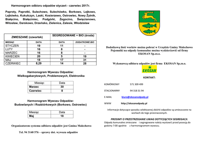 Harmonogram odbioru odpadów styczeń - czerwiec 2017r. Paproty, Paprotki, Sulechowo, Sulechówko, Borkowo, Lejkowo, Lejkówko, Kukułczyn, Laski, Kosierzewo, Ostrowiec, Nowy Żytnik, Białęcino, Białęciniec, Podgórki, Żegocino, Święcianowo, Witosław, Darskowo, Drzeńsko, Zielenica, Zalesie, Włodzisław ZMIESZANE (czwartek) SEGREGOWANE + BIO (środa) MIESIĄC DATA DATA DODATKOWE BIO STYCZEŃ LUTY MARZEC KWIECIEŃ MAJ CZERWIEC 19 16 16 20 18 8,29 11 8 8 5 17 14 19 31 28 Dodatkową ilość worków można pobrać w Urzędzie Gminy Malechowo Pojemniki na odpady komunalne można wydzierżawić od firmy EKOSAN Sp.zo.o. Wykonawcą odbioru odpadów jest firma EKOSAN Sp.zo.o. Harmonogram Wywozu Odpadów: Wielkogabarytowych, Problemowych, Elektronika Miesiąc Marzec Czerwiec Data 30 8 Harmonogram Wywozu Odpadów: Budowlanych i Rozbiórkowych (Borkowo, Ostrowiec) Miesiąc Maj Data 18 KONTAKT: KOMÓRKOWY 571 309 499 STACJONARNY 94 318 31 94 E-MAIL [email protected] WWW http://ekosanodpady.pl Informacje dotyczące sposobu selektywnej zbiórki odpadów są umieszczone na workach do tego przeznaczonych. PROSIMY O PRZESTRZEGANIE UWAG DOTYCZĄCYCH SEGREGACJI. Organizatorem systemu odbioru odpadów jest Gmina Malechowo Tel. 94 3140 576 – sprawy dot. wywozu odpadów Odpady komunalne zmieszane i segregowane należy wystawić przed posesją do godziny 7:00 zgodnie z harmonogramem wywozu. Harmonogram odbioru odpadów styczeń - czerwiec 2017r. Gorzyca, Przystawy, Pięćmiechowo, Grabowo, Uniedrożyn, Pękanino, Kawno, Kusice, Krzekoszewo, Niemica, Bartolino, Malechowo, Malechówko, Karwice, Karwiczki, Karw, Sęczkowo ZMIESZANE (czwartek) SEGREGOWANE + BIO (środa) MIESIĄC DATA DATA DODATKOWE BIO STYCZEŃ LUTY MARZEC KWIECIEŃ MAJ CZERWIEC 12 9 9 13 11 1,22 11 8 8 5 17 14 19 31 28 Dodatkową ilość worków można pobrać w Urzędzie Gminy Malechowo Pojemniki na odpady komunalne można wydzierżawić od firmy EKOSAN Sp. z o.o. Wykonawcą odbioru odpadów jest firma EKOSAN Sp. zo.o. Harmonogram Wywozu Odpadów: Wielkogabarytowych, Problemowych, Elektronika KONTAKT: Miesiąc Marzec Czerwiec Data 30 1 Harmonogram Wywozu Odpadów: Budowlanych i Rozbiórkowych (Kusice, Malechowo) Miesiąc Maj Data 18 KOMÓRKOWY 571 309 499 STACJONARNY 94 318 31 94 E-MAIL [email protected] WWW http://ekosanodpady.pl Informacje dotyczące sposobu selektywnej zbiórki odpadów są umieszczone na workach do tego przeznaczonych. PROSIMY O PRZESTRZEGANIE UWAG DOTYCZĄCYCH SEGREGACJI. Organizatorem systemu odbioru odpadów jest Gmina Malechowo Tel. 94 3140 576 – sprawy dot. wywozu odpadów Odpady komunalne zmieszane i segregowane należy wystawić przed posesją do godziny 7:00 zgodnie z harmonogramem wywozu.