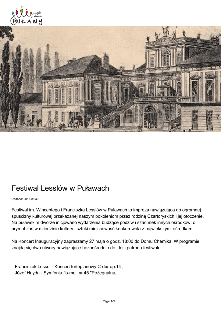 Festiwal Lesslów w Puławach Dodano: 2016.05.30 Festiwal im. Wincentego i Franciszka Lesslów w Puławach to impreza nawiązująca do ogromnej spuścizny kulturowej przekazanej naszym pokoleniom przez rodzinę Czartoryskich i jej otoczenie. Na puławskim dworze inicjowano wydarzenia budzące podziw i szacunek innych ośrodków, o prymat zaś w dziedzinie kultury i sztuki miejscowość konkurowała z największymi ośrodkami. Na Koncert Inauguracyjny zapraszamy 27 maja o godz. 18:00 do Domu Chemika. W programie znajdą się dwa utwory nawiązujące bezpośrednio do idei i patrona festiwalu: Franciszek Lessel - Koncert fortepianowy C-dur op.14 , Józef Haydn - Symfonia fis-moll nr 45 "Pożegnalna,,. Page 1/3 Wykonawcami koncertu będą: pianista - prof. Maciej Pabich oraz Orkiestra Teatru Muzycznego w Lublinie pod dyrekcją Marcina Sompolińskiego. W sobotę, 28 maja, o godz 17:00 zapraszamy na koncert multimedialny. Będzie to kompilacja elementów słownych, muzycznych i multimedialnych, prezentująca historię ziemi puławskiej na przestrzeni minionego tysiąclecia. Wydarzenie nawiązujące do obchodzonej w bieżącym roku 110. rocznicy nadania Puławom praw miejskich. Wydarzeniem kończącym pierwszą edycję festiwalu będzie plenerowa inscenizacja arcydzieła Opera "Czarodziejski Flet,, Wolfganga Amadeusza Mozarta. Odbędzie się ona 5 czerwca na Dziedzińcu Pałacu Czartoryskich o godz. 20.00. Obok zespołu Teatru Muzycznego w Lublinie w spektaklu udział wezmą wybitni soliści polskich scen operowych, całość zaś poprowadzi Maestro Marcin Sompoliński."Czarodziejski flet,, to kolejne po "Cyruliku sewilskim,, G. Rossiniego dzieło operowe zrealizowane w Puławach. Na wszystkie wymienione imprezy wstęp WOLNY. W muzycznej historii Puław na szczególną uwagę zasługują trzy postacie. Wincenty Ferdynand Lessel, jego syn Franciszek Lessel oraz żyjący w połowie XIX w. Antoni Stolpe. W tworzeniu kultury przypadły im całkiem odmienne role, jednak wszyscy zasłużyli na pamięć poprzez dzieło które po sobie zostawili. Talenty kompozytorów związanych z Puławami docenili już wybitni muzykolodzy i artyści w Europie wydając ich dzieła drukiem oraz rejestrując kompozycje na płytach. Coraz częściej również w Polsce nazwiska Lessel i Stolpe można zobaczyć na afiszach i okładkach płyt. Wydaje się jednak, że renesans zainteresowania twórczością tych artystów dopiero nadchodzi. Puławy ; z racji wpisania kompozytorów w swoją historię ; mają szczególne prawo i obowiązek dbać o spuściznę po nich a także promować ich twórczość. Stąd pomysł festiwalu. Chcemy aby obecna, jak i każda przyszła edycja, zawierała odniesienia zarówno do dziedzictwa artystycznego Puław jak i istotnych dla miasta wydarzeń i osób bliższych naszym czasom. Szczególną uwagę w warstwie muzycznej zwrócić pragniemy na kompozycje i kompozytorów okresu klasycystycznego. Jest to o tyle istotne, że czasy te w muzyce polskiej sprawiają wrażenie niedocenianych a zdają się skrywać jeszcze wiele istotnych kwestii i utworów zasługujących na zaprezentowanie szerszej publiczności. Page 2/3 Źródło: Page 3/3