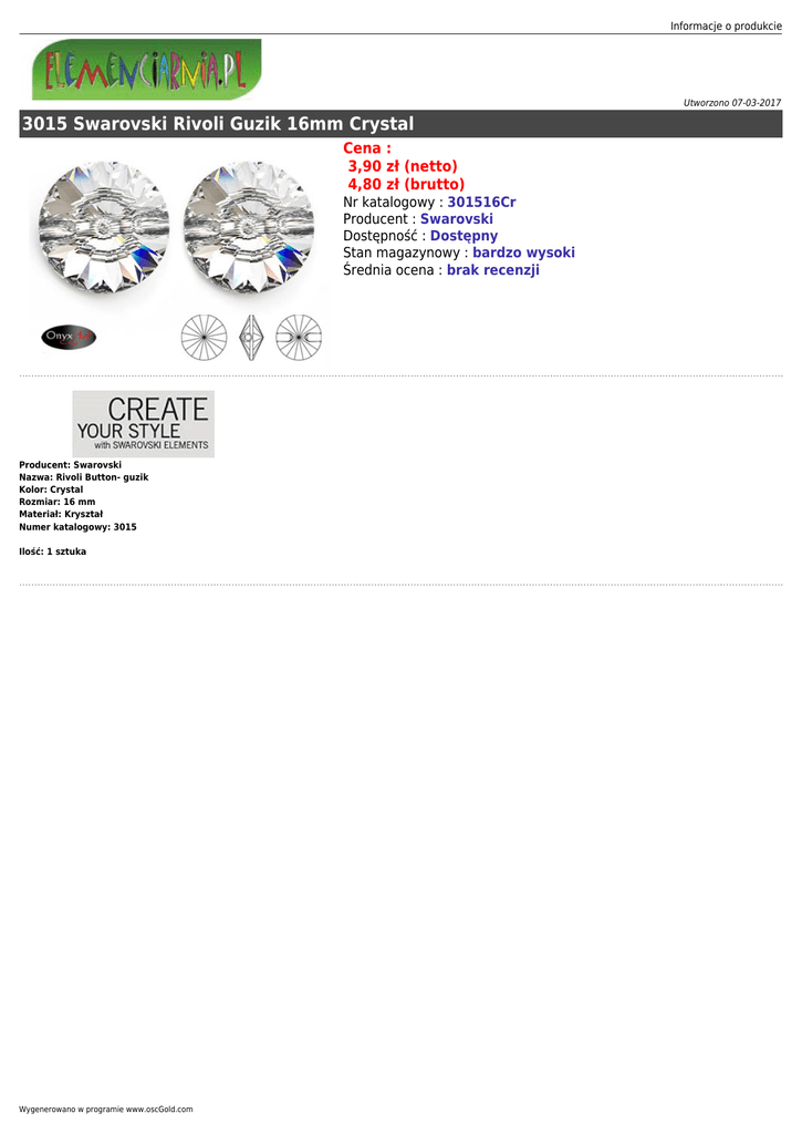 Informacje o produkcie Utworzono 07-03-2017 3015 Swarovski Rivoli Guzik 16mm Crystal Cena : 3,90 zł (netto) 4,80 zł (brutto) Nr katalogowy : 301516Cr Producent : Swarovski Dostępność : Dostępny Stan magazynowy : bardzo wysoki Średnia ocena : brak recenzji Producent: Swarovski Nazwa: Rivoli Button- guzik Kolor: Crystal Rozmiar: 16 mm Materiał: Kryształ Numer katalogowy: 3015 Ilość: 1 sztuka Wygenerowano w programie www.oscGold.com