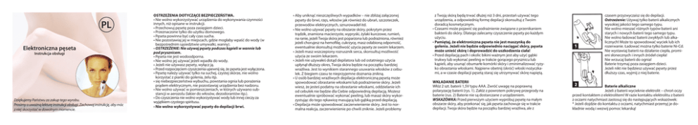 PL Elektroniczna pęseta Instrukcja obsługi Dziękujemy Państwu za zakup tego wyrobu. Prosimy o uważną lekturę instrukcji obsługi. Zachowaj instrukcję, aby móc z niej skorzystać w dowolnym momencie. OSTRZEŻENIA DOTYCZĄCE BEZPIECZEŃSTWA. • Nie wolno wykorzystywać urządzenia do wykonywania czynności innych, niż opisane w instrukcji. • Przechowuj pęsetę poza zasięgiem dzieci. • Przeznaczone tylko do użytku domowego. • Pęseta powinna być cały czas sucha. • Nie pozostawiaj jej w miejscach, gdzie mogłaby wpaść do wody (w bezpośrednim sąsiedztwie umywalki, wanny). • OSTRZEŻENIE: Nie używaj pęsety podczas kąpieli w wannie lub pod prysznicem. • Pęseta nie jest wodoodporna. • Nie wolno jej używać jeżeli wpadła do wody. • Jeżeli nie używasz pęsety, wyłącz ją. • Przed rozpoczęciem czyszczenia upewnij się, że pęseta jest wyłączona. • Pęsetę należy używać tylko na suchej, czystej skórze, nie wolno korzystać z pianki do golenia, żelu itp. • się niebezpieczeństwa wybuchu, powstania ognia lub porażenia prądem elektrycznym, nie pozostawiaj urządzenia bez nadzoru. • Nie wolno używać w pomieszczeniach, w których używano substancji w aerozolu (lakier do włosów, dezodorantów itp.). • Do czyszczenia nie wolno wykorzystywać wody lub innej cieczy za wyjątkiem czystego spiritusu. • Nie wolno wykorzystywać pęsety do depilacji brwi. • Aby uniknąć nieszczęśliwych wypadków – nie zbliżaj załączonej pęsety do brwi, rzęs, włosów jak również do ubrań, szczoteczek, przewodów elektrycznych, sznurowadeł itd. • Nie wolno używać pęsety na obszarze skóry, pokrytym przez trądzik, znamiona macierzyste, wypryski, żylaki kurczowe, rumień, na ranie, jeżeli Twoja skóra jest poparzona lub podrażniona, również jeżeli chorujesz na hemofilię, cukrzycę, masz osłabioną odporność, ewentualnie skonsultuj możliwość użycia pęsety ze swoim lekarzem. • Jeżeli masz wszczepiony rozrusznik serca, skonsultuj możliwość użycia ze swoim lekarzem. • Jeżeli nie używałeś dotąd depilatora lub od ostatniego użycia upłynął dłuższy okres, Twoja skóra będzie na początku bardziej wrażliwa. Jest to wynikiem starannego usuwania włosków z cebulek. Z biegiem czasu te nieprzyjemne doznania znikną. • U osób bardziej wrażliwych depilacja elektroniczną pęsetą może spowodować obrastanie włoskami lub podrażnienie skóry. Jeżeli wiesz, że jesteś podatny na obrastanie włoskami, oddzielanie ich od cebulek nie będzie dla Ciebie odpowiednią depilacją. Możesz ewentualnie spróbować wykonać peeling, lub masaż skóry wykorzystując do tego rękawicę masującą lub gąbką przed depilacją. • Depilacja może spowodować zaczerwienienie skóry. Jest to normalna reakcja, zaczerwienienie po chwili zniknie. Jeżeli problemy z Twoją skórą będą trwać dłużej niż 3 dni, przestań używać tego urządzenia, a odpowiednią formę depilacji skonsultuj z Twoim doradcą kosmetycznym. • Czasami może pojawić się podrażnienie związane z przenikaniem bakterii do skóry. Dlatego zalecamy czyszczenie pęsety po każdym użyciu. • Pamiętaj, że elektroniczna pęseta nie jest maszynką do golenia. Jeżeli nie będzie odpowiednio naciągać skóry, pęseta może unieść skórę i doprowadzić do uszkodzenia ciała! • Przed depilacją pach i okolic bikini ważnym jest aby użyć gąbki trukwy lub wykonać peeling w trakcie gorącego prysznicu lub kąpieli, aby usunąć obumarłe komórki skóry i zminimalizować ryzyko obrastania włoskami. Najpierw obetnij (skróć) włoski nożyczkami, a w czasie depilacji pęsetą staraj się utrzymywać skórę napiętą. czasem przyzwyczaisz się do depilacji. Ostrzeżenie: Używaj tylko baterii alkalicznych wysokiej jakości tego samego typu. Nie wolno mieszać różnych typów baterii ani starych i nowych baterii tego samego typu. Nie wolno ładować baterii zwykłych lub alkalicznych! Może to spowodować wyciek lub ich rozerwanie. Ładować można tylko baterie Ni-Cd. Nie wystawiaj baterii na działanie ciepła, promieni słonecznych i innych źródeł ciepła! Nie wrzucaj baterii do ognia! Baterie trzymaj poza zasięgiem dzieci. Jeżeli nikt nie będziesz używać pęsety przez dłuższy czas, wyjmij z niej baterie. WKŁADANIE BATERII Włóż 2 szt. baterii 1,5V typu AAA. Zwróć uwagę na poprawną polaryzację baterii (rys. 1). Załóż z powrotem pokrywę przegrody na baterie (rus. 2) Baterie nie są dostarczane z urządzeniem. WSKAZÓWKA: Przed pierwszym użyciem wypróbuj pęsetę na małym obszarze skóry, aby przekonać się, jak pęseta zachowuje się w trakcie depilacji. Twoja skóra będzie na początku bardziej wrażliwa, ale z Baterie alkaliczne Jeżeli z baterii wycieknie elektrolit – chroń oczy przed kontaktem z elektrolitem! W razie kontaktu elektrolitu z baterii z oczami natychmiast zastosuj się do następujących wskazówek: * Jeżeli dojdzie do kontaktu z oczami, natychmiast przemyj je dokładnie wodą i wezwij pomoc lekarską! WSKAZÓWKI DOTYCZĄCE UŻYTKOWANIA: ◊ Usuwając włoski z cebulek należy napinać skórę, aby uniknąć uczucia nieprzyjemnego gryzienia i minimalizować uciążliwości w trakcie depilacji. ◊ Włącz pęsetę przesuwając przełącznik do góry w pozycję „ON” włączone (rys. 3). ◊ Palcami jednej ręki napinaj skórę, drugą ręką trzymaj pęsetę pod kątem 90° w stosunku do powierzchni, którą będziesz depilować. Pęseta powinna być skierowana znaczkiem „logo” w Twoim kierunku. ◊ Nie ma potrzeby dociskania pęsety do skóry. ◊ Poruszaj pęsetą szybko wykonu- jąc ruchy koliste, delikatnie nad powierzchnią skóry (rys. 4).Nie ma potrzeby dociskania pęsety do skóry. ◊ Po każdym użyciu zalecamy wyczyścić pęsetę. W tym celu skorzystaj ze szczoteczki, którą znajdziesz w opakowaniu. Pęseta idealnie nadaje się do depilacji włosków nad górną wargą, n