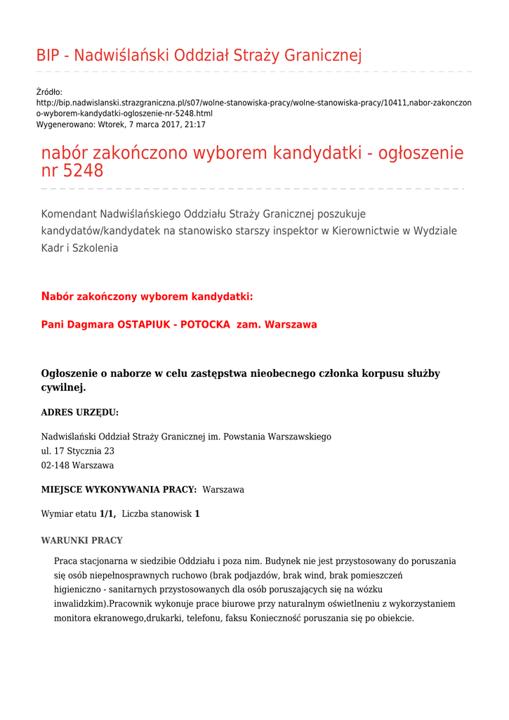 BIP - Nadwiślański Oddział Straży Granicznej Źródło: http://bip.nadwislanski.strazgraniczna.pl/s07/wolne-stanowiska-pracy/wolne-stanowiska-pracy/10411,nabor-zakonczon o-wyborem-kandydatki-ogloszenie-nr-5248.html Wygenerowano: Wtorek, 7 marca 2017, 21:17 nabór zakończono wyborem kandydatki - ogłoszenie nr 5248 Komendant Nadwiślańskiego Oddziału Straży Granicznej poszukuje kandydatów/kandydatek na stanowisko starszy inspektor w Kierownictwie w Wydziale Kadr i Szkolenia Nabór zakończony wyborem kandydatki: Pani Dagmara OSTAPIUK - POTOCKA zam. Warszawa Ogłoszenie o naborze w celu zastępstwa nieobecnego członka korpusu służby cywilnej. ADRES URZĘDU: Nadwiślański Oddział Straży Granicznej im. Powstania Warszawskiego ul. 17 Stycznia 23 02-148 Warszawa MIEJSCE WYKONYWANIA PRACY: Warszawa Wymiar etatu 1/1, Liczba stanowisk 1 WARUNKI PRACY Praca stacjonarna w siedzibie Oddziału i poza nim. Budynek nie jest przystosowany do poruszania się osób niepełnosprawnych ruchowo (brak podjazdów, brak wind, brak pomieszczeń higieniczno - sanitarnych przystosowanych dla osób poruszających się na wózku inwalidzkim).Pracownik wykonuje prace biurowe przy naturalnym oświetlneniu z wykorzystaniem monitora ekranowego,drukarki, telefonu, faksu Konieczność poruszania się po obiekcie. ZAKRES ZADAŃ ewidencjonowanie korespondencji wchodzącej i wychodzącej, przyjmowanie oraz wysyłanie korespondencji w zakresie Wydziału, redagowanie strony intranetowej Wydziału Kadr i Szkolenia, powielanie i przekazywanie do właściwych komórek/jednostek organizacyjnych danych dotyczących pracowników i funkcjonariuszy Oddziału zawartych w dokumentacji kadrowej i meldunkach, prowadzenie w systemie informatycznym ewidencji czasu służby/pracy Wydziału oraz osób bezpośrednio podlegających Komendantowi Oddziału, prowadzenie rejestru wpływu zwolnień lekarskich funkcjonariuszy, sporządzanie protokołów dokumentów zakwalifikowanych do wybrakowania lub archiwum znajdujących się w ewidencji Wydziału Kadr i Szkolenia, sporządzanie zestawień, statystyk w zakresie realizacji zadań. WYMAGANIA NIEZBĘDNE Wykształcenie: średnie doświadczenie zawodowe: 2 lata doświadczenia w administracji/pracy. dyskrecja dobra organizacja pracy własnej komunikatywność znajomość przepisów dotyczących archiwizacji dokumentów znajomość podstawowych zagadnień dotyczących funkcjonowania SG umiejętność obsługi komputera oraz innych urządzeń biurowych umiejetności analityczne dokładność Posiadanie obywatelstwa polskiego Korzystanie z pełni praw publicznych Nieskazanie prawomocnym wyrokiem za umyślne przestępstwo lub umyślne przestępstwo skarbowe WYMAGANIA DODATKOWE Wykształcenie: średnie w zakresie administracji publicznej doświadczenie zawodowe: 1 rok w zakresie spraw kadrowych znajomość przepisów dotyczących rozliczania czasu służby/pracy DOKUMENTY I OŚWIADCZENIA NIEZBĘDNE Życiorys/CV i list motywacyjny Kopie dokumentów potwierdzających spełnienie wymagania niezbędnego w zakresie wykształcenia Kopie dokumentów potwierdzających spełnienie wymagania niezbędnego w zakresie doświadczenia zawodowego / stażu pracy Kopia poświadczenia bezpieczeństwa uprawniającego do dostępu do informacji niejawnych klauzula "poufne" lub oświadczenie o wyrażeniu zgody na przeprowadzenie postępowania sprawdzającego zgodnie z ustawą o ochronie informacji niejawnych z dn. 05.08.2010 r. (Dz. U. Nr 182, poz. 1228) Oświadczenie o posiadaniu obywatelstwa polskiego albo kopia dokumentu potwierdzającego posiadanie polskiego obywatelstwa Oświadczenie o wyrażeniu zgody na przetwarzanie danych osobowych do celów naboru Oświadczenie o korzystaniu z pełni praw publicznych Oświadczenie o nieskazaniu prawomocnym wyrokiem za umyślne przestępstwo lub umyślne przestępstwo skarbowe DOKUMENTY I OŚWIADCZENIA DODATKOWE Kopia dokumentu potwierdzającego niepełnosprawność - w przypadku kandydatek/kandydatów, zamierzających skorzystać z pierwszeństwa w zatrudnieniu w przypadku, gdy znajdą się w gronie najlepszych kandydatek/kandydatów Kopie dokumentów potwierdzających spełnienie wymagania dodatkowego w zakresie wykształcenia Kopie dokumentów potwierdzających spełnienie wymagania dodatkowego w zakresie doświadczenia zawodowego / stażu pracy Kopie świadectw pracy. TERMINY I MIEJSCE SKŁADANIA DOKUMENTÓW Dokumenty należy złożyć do: 13.11.2016 Decyduje data: stempla pocztowego / osobistego dostarczenia oferty do urzędu Miejsce składania dokumentów: Nadwiślański Oddział Straży Granicznej ul. 17 Stycznia 23 02-148 Warszawa z dopiskiem „straszy inspektor NwOSG/WKiSz/5” Tel. (22) 500 30 77, 500 33 79 INNE INFORMACJE: W miesiącu poprzedzającym datę upublicznienia ogłoszenia wskaźnik zatrudnienia osób niepełnosprawnych w urzędzie, w rozumieniu przepisów o rehabilitacji zawodowej i społecznej oraz zatrudnianiu osób niepełnosprawnych, nie wynosi co najmniej 6%. 1. Proponowane wynagrodzenie w wysokości 2 154,92 zł (brutto) + dodatek za wysługę lat; Godziny pracy urzędu: 7:30 - 15:30; 2. Dokumenty należy składać osobiście w siedzibie urzędu lub listownie. Oferty złożone po terminie nie będą rozpatrywane (decyduje data przyjęcia oferty w siedzibie urzędu lub data stempla pocztowego). 3. Rozpatrzeniu nie będą podlegać oferty niespełniające wymagań formalnych określonych w ogłoszeniu, a także oferty, które nie zawierają kompletu wymaganych oraz uwierzytelnionych (opatrzonych datą i podpisem) dokumentów takich jak : list motywacyjny, CV i wszystkie pozostałe dokumenty załączone do oferty. Wzory wymaganych oświadczeń znajdują się na stronie Biuletynu Informacji Publicznej Nadwiślańskiego Oddziału Straży Granicznej w zakładce" Wolne stanowiska pracy". 4. Do celów organizacyjnych uprzejmie prosimy o wskazywanie numerów telefonów oraz adresów e-mail do kontaktów za pośrednictwem poczty elektronicznej. 5. Kandyd