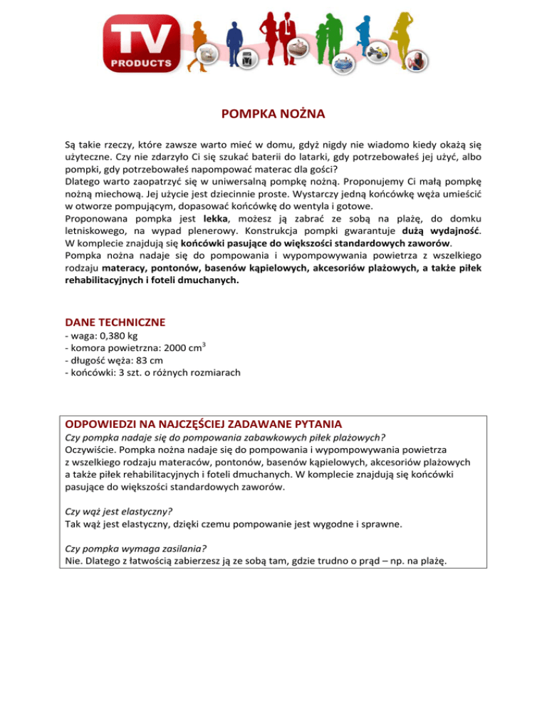 POMPKA NOŻNA Są takie rzeczy, które zawsze warto mieć w domu, gdyż nigdy nie wiadomo kiedy okażą się użyteczne. Czy nie zdarzyło Ci się szukać baterii do latarki, gdy potrzebowałeś jej użyć, albo pompki, gdy potrzebowałeś napompować materac dla gości? Dlatego warto zaopatrzyć się w uniwersalną pompkę nożną. Proponujemy Ci małą pompkę nożną miechową. Jej użycie jest dziecinnie proste. Wystarczy jedną końcówkę węża umieścić w otworze pompującym, dopasować końcówkę do wentyla i gotowe. Proponowana pompka jest lekka, możesz ją zabrać ze sobą na plażę, do domku letniskowego, na wypad plenerowy. Konstrukcja pompki gwarantuje dużą wydajność. W komplecie znajdują się końcówki pasujące do większości standardowych zaworów. Pompka nożna nadaje się do pompowania i wypompowywania powietrza z wszelkiego rodzaju materacy, pontonów, basenów kąpielowych, akcesoriów plażowych, a także piłek rehabilitacyjnych i foteli dmuchanych. DANE TECHNICZNE ‐ waga: 0,380 kg ‐ komora powietrzna: 2000 cm3 ‐ długość węża: 83 cm ‐ końcówki: 3 szt. o różnych rozmiarach ODPOWIEDZI NA NAJCZĘŚCIEJ ZADAWANE PYTANIA Czy pompka nadaje się do pompowania zabawkowych piłek plażowych? Oczywiście. Pompka nożna nadaje się do pompowania i wypompowywania powietrza z wszelkiego rodzaju materaców, pontonów, basenów kąpielowych, akcesoriów plażowych a także piłek rehabilitacyjnych i foteli dmuchanych. W komplecie znajdują się końcówki pasujące do większości standardowych zaworów. Czy wąż jest elastyczny? Tak wąż jest elastyczny, dzięki czemu pompowanie jest wygodne i sprawne. Czy pompka wymaga zasilania? Nie. Dlatego z łatwością zabierzesz ją ze sobą tam, gdzie trudno o prąd – np. na plażę.