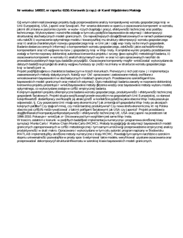 Nr wniosku: 149557, nr raportu: 6150. Kierownik (z rap.): dr Kamil Włodzimierz Makieła Głównym celem realizowanego projektu było przeprowadzenie analizy komparatywnej wzrostu gospodarczego krajów Unii Europejskiej, USA, Japonii oraz Szwajcarii. Porównania dokonano w oparciu o oszacowania komponentów wzrostu, jakimi są: zmiana w poziomie czynników wytwórczych (kapitału i pracy), efektywności technicznej oraz postępu technicznego. Wykorzystane i rozwinięte zostało w tym celu podejście bayesowskie do estymacji i dekompozycji strukturalnej stochastycznych modeli granicznych. Do najważniejszych działań zrealizowanych w ramach postawionego celu należą: i) wyznaczenie optymalnego modelu i towarzyszącej mu struktury dekompozycji wzrostu gospodarczego oraz ii) analiza charakterystyki rozwoju gospodarczego krajów Unii jak i całej wspólnoty na tle innych gospodarek. Badanie dostarcza cennych informacji o komponentach wzrostu gospodarczego, zależności jakie zachodzą między komponentami oraz ich wpływie na rozwój gospodarczy krajów Wspólnoty. Kompletne wyniki projektu przedstawione zostały w formie rozprawy doktorskiej autorstwa kierownika projektu i szczegółowo opisują i) metodologię badania, ii) oszacowania komponentów wzrostu iii) analizę otrzymanych wyników oraz iv) opis opracowanych narzędzi do prowadzenia podobnych tego typu badań w przyszłości. Oszacowane komponenty mogą również zostać wykorzystane do dalszych badań; na przykład do analizy wpływu funduszy spójności na zmiany w strukturze wzrostu gospodarczego krajów beneficjentów. Projekt podjął działania o charakterze badawczym w trzech kierunkach. Pierwszym z nich jest rozwój i implementacja zaawansowanych metody statystycznych. Należy wyróżnić opracowane i zastosowane metody związane z wnioskowaniem bayesowskim w stochastycznych modelach granicznych. Przedstawiono szeroką gamę tzw. bayesowskich modeli granicznych oraz metod ich estymacji. Opis metodologii badania zawarty w rozprawie doktorskiej kierownika projektu prezentuje również bayesowskie metody łączenia wiedzy oraz bayesowskie metody wyboru modelu optymalnego, co wykorzystane zostaje w części empirycznej badania. Kolejnym aspektem projektu są empiryczne badania wzrostu gospodarczego, produktywności i efektywności technicznej gospodarek światowych. Projekt skupia swoją uwagę przede wszystkim na gospodarkach Unii Europejskiej, co stanowi kolejną wartość dodaną pracy zwiększając jej atrakcyjność w kontekście pytań, na jakie obecnie Wspólnota poszukuje odpowiedzi; tj. Czy poszerzanie Unii miało sens ekonomiczny? Jak zmieniła się gospodarka Wspólnoty po akcesjach kolejnych państw? Czy stała się mniej, czy może bardziej produktywna? Czy nowa strefa ekonomiczna, której Polska obecnie jest częścią, może rywalizować z takimi potęgami światowymi jak USA czy Japonia? Projekt przedstawia dogłębną analizę komparatywną produktywności i efektywności technicznej UE, USA oraz Japonii na przestrzeni lat 1996-2010. Pokazuje również jak zróżnicowana pod tym względem jest sama Wspólnota. W trzecim, ostatnim z kierunków podjętych badań jest implementacja numeryczna i programowa określonej klasy symulacji Monte Carlo – Markov Chain Monte Carlo (MCMC). Metody te posłużyły do estymacji bayesowskich modeli granicznych zaproponowanych w części metodologicznej i tym samym umożliwiły przeprowadzenie empirycznej analizy produktywności w skali makro. Opracowano i wykorzystano w tym celu autorski program napisany w środowisku MATLAB implementujący określone metody numeryczne z klasy MCMC. Powstało tym samym narzędzie o szerokim stopniu uniwersalności pozwalające w prosty sposób estymować takie modele, weryfikować uzyskane oszacowania oraz przeprowadzać dekompozycję strukturalną wzrostu w szerokiej klasie bayesowskich modeli granicznych.