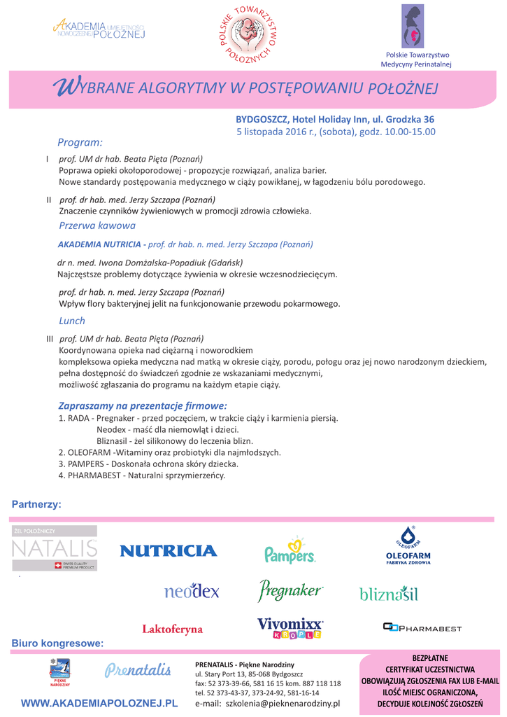 Polskie Towarzystwo Medycyny Perinatalnej WYBRANE ALGORYTMY W POSTĘPOWANIU POŁOŻNEJ BYDGOSZCZ, Hotel Holiday Inn, ul. Grodzka 36 5 listopada 2016 r., (sobota), godz. 10.00-15.00 Program: I prof. UM dr hab. Beata Pięta (Poznań) Poprawa opieki okołoporodowej - propozycje rozwiązań, analiza barier. Nowe standardy postępowania medycznego w ciąży powikłanej, w łagodzeniu bólu porodowego. II prof. dr hab. med. Jerzy Szczapa (Poznań) Znaczenie czynników żywieniowych w promocji zdrowia człowieka. Przerwa kawowa AKADEMIA NUTRICIA - prof. dr hab. n. med. Jerzy Szczapa (Poznań) dr n. med. Iwona Domżalska-Popadiuk (Gdańsk) Najczęstsze problemy dotyczące żywienia w okresie wczesnodziecięcym. prof. dr hab. n. med. Jerzy Szczapa (Poznań) Wpływ flory bakteryjnej jelit na funkcjonowanie przewodu pokarmowego. Lunch III prof. UM dr hab. Beata Pięta (Poznań) Koordynowana opieka nad ciężarną i noworodkiem kompleksowa opieka medyczna nad matką w okresie ciąży, porodu, połogu oraz jej nowo narodzonym dzieckiem, pełna dostępność do świadczeń zgodnie ze wskazaniami medycznymi, możliwość zgłaszania do programu na każdym etapie ciąży. Zapraszamy na prezentacje firmowe: 1. RADA - Pregnaker - przed poczęciem, w trakcie ciąży i karmienia piersią. Neodex - maść dla niemowląt i dzieci. Bliznasil - żel silikonowy do leczenia blizn. 2. OLEOFARM -Witaminy oraz probiotyki dla najmłodszych. 3. PAMPERS - Doskonała ochrona skóry dziecka. 4. PHARMABEST - Naturalni sprzymierzeńcy. Partnerzy: . Biuro kongresowe: PRENATALIS - Piękne Narodziny ul. Stary Port 13, 85-068 Bydgoszcz fax: 52 373-39-66, 581 16 15 kom. 887 118 118 tel. 52 373-43-37, 373-24-92, 581-16-14 WWW.AKADEMIAPOLOZNEJ.PL e-mail: [email protected] BEZPŁATNE CERTYFIKAT UCZESTNICTWA OBOWIĄZUJĄ ZGŁOSZENIA FAX LUB E-MAIL ILOŚĆ MIEJSC OGRANICZONA, DECYDUJE KOLEJNOŚĆ ZGŁOSZEŃ