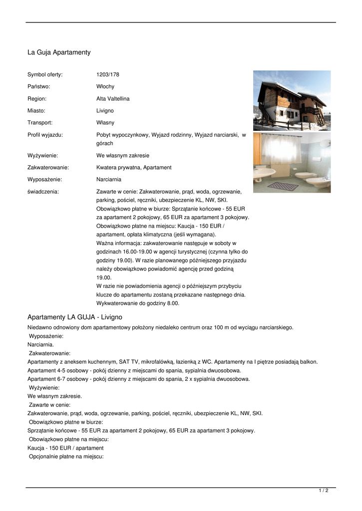 La Guja Apartamenty Symbol oferty: 1203/178 Państwo: Włochy Region: Alta Valtellina Miasto: Livigno Transport: Własny Profil wyjazdu: Pobyt wypoczynkowy, Wyjazd rodzinny, Wyjazd narciarski, w Wyżywienie: We własnym zakresie Zakwaterowanie: Kwatera prywatna, Apartament Wyposażenie: Narciarnia świadczenia: Zawarte w cenie: Zakwaterowanie, prąd, woda, ogrzewanie, górach parking, pościel, ręczniki, ubezpieczenie KL, NW, SKI. Obowiązkowo płatne w biurze: Sprzątanie końcowe - 55 EUR za apartament 2 pokojowy, 65 EUR za apartament 3 pokojowy. Obowiązkowo płatne na miejscu: Kaucja - 150 EUR / apartament, opłata klimatyczna (jeśli wymagana). Ważna informacja: zakwaterowanie następuje w soboty w godzinach 16.00-19.00 w agencji turystycznej (czynna tylko do godziny 19.00). W razie planowanego późniejszego przyjazdu należy obowiązkowo powiadomić agencję przed godziną 19.00. W razie nie powiadomienia agencji o późniejszym przybyciu klucze do apartamentu zostaną przekazane następnego dnia. Wykwaterowanie do godziny 8.00. Apartamenty LA GUJA - Livigno Niedawno odnowiony dom apartamentowy położony niedaleko centrum oraz 100 m od wyciągu narciarskiego. Wyposażenie: Narciarnia. Zakwaterowanie: Apartamenty z aneksem kuchennym, SAT TV, mikrofalówką, łazienką z WC. Apartamenty na I piętrze posiadają balkon. Apartament 4-5 osobowy - pokój dzienny z miejscami do spania, sypialnia dwuosobowa. Apartament 6-7 osobowy - pokój dzienny z miejscami do spania, 2 x sypialnia dwuosobowa. Wyżywienie: We własnym zakresie. Zawarte w cenie: Zakwaterowanie, prąd, woda, ogrzewanie, parking, pościel, ręczniki, ubezpieczenie KL, NW, SKI. Obowiązkowo płatne w biurze: Sprzątanie końcowe - 55 EUR za apartament 2 pokojowy, 65 EUR za apartament 3 pokojowy. Obowiązkowo płatne na miejscu: Kaucja - 150 EUR / apartament Opcjonalnie płatne na miejscu: 1/2 Łóżeczko (na zapytanie) - 10 EUR za dzień Ważna informacja: zakwaterowanie następuje w soboty w godzinach 16.00-19.00 w agencji turystycznej (czynna tylko do godziny 19.00). W razie planowanego późniejszego przyjazdu należy obowiązkowo powiadomić agencję przed godziną 19.00. W razie nie powiadomienia agencji o późniejszym przybyciu klucze do apartamentu zostaną przekazane następnego dnia. Wykwaterowanie do godziny 8.00. TERMINY: od: 2017-03-11 do: 2017-03-18 (8 dni), miejsca: zamów cena od: 1082 PLN = 261 EUR od: 2017-03-18 do: 2017-03-25 (8 dni), miejsca: zamów cena od: 1082 PLN = 261 EUR od: 2017-03-25 do: 2017-04-01 (8 dni), miejsca: zamów cena od: 1028 PLN = 248 EUR od: 2017-04-01 do: 2017-04-08 (8 dni), miejsca: zamów cena od: 745 PLN = 180 EUR od: 2017-04-08 do: 2017-04-15 (8 dni), miejsca: zamów cena od: 860 PLN = 208 EUR CENNIK: Długość pobytu: 8 dni 8 dni 8 dni 8 dni Grupa cenowa: H A C E 14 14 14 2.5 2.5 2.5 1560 1255 1469 1391 1125 1326 1157 904 1079 988 774 936 (-) (-) (-) Ubezpieczenie (obligatoryjne) (*) Ubezpieczenie KL, NW, SKI 14 (*) Turystyczny Fundusz Gwarancyjny 2.5 Pobyt w obiekcie (do wyboru) Apart. 7 os. standardowo dla osób: 7 1092 Apart. 6 os. standardowo dla osób: 6 minimalnie: 1 962 Apart. 5 os. standardowo dla osób: 5 793 (*) Apart. 4 os. standardowo dla osób: 4 minimalnie: 1 663 Rodzaj osoby (do wyboru) (*) Uczestnik (-) Waluta: EUR Aktualne ceny z systemu S.A.R.T. (-) - cena usługi, podatku kalkulowana przy osobie lub gratis (*) - kwota wliczona w cenę standardową 2/2
